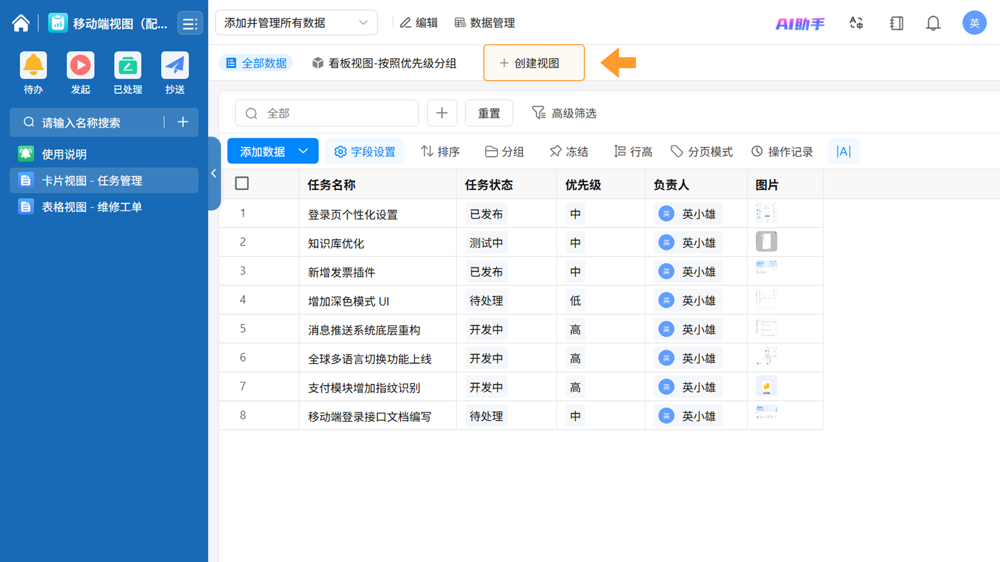 - 方式一:在表单数据页面,点击顶部的 「+ 创建视图」。