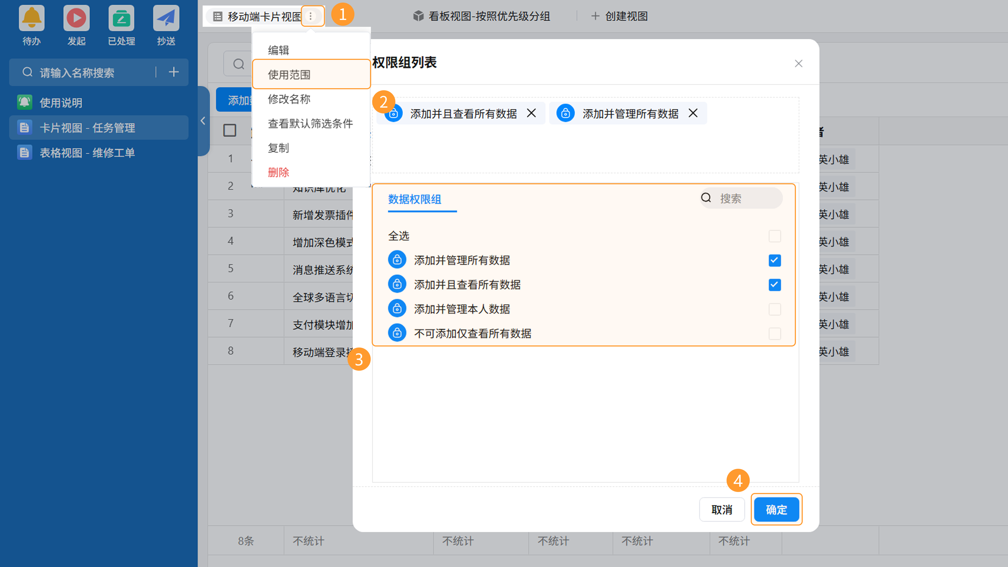 首次保存视图时,系统将自动弹出“使用范围”设置弹窗。您可以指定哪些部门、角色或成员(即您设置的权限组)具备查看该视图的权限。