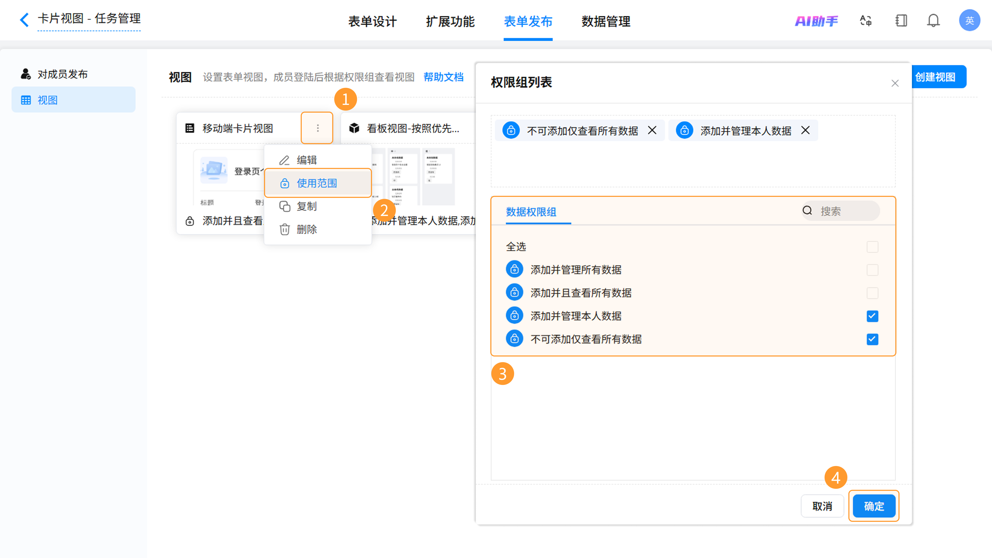 3)配置完成后,返回「表单发布 >> 视图」页面,点击对应视图右上角的「更多 >> 使用范围」,重新勾选权限组并保存。