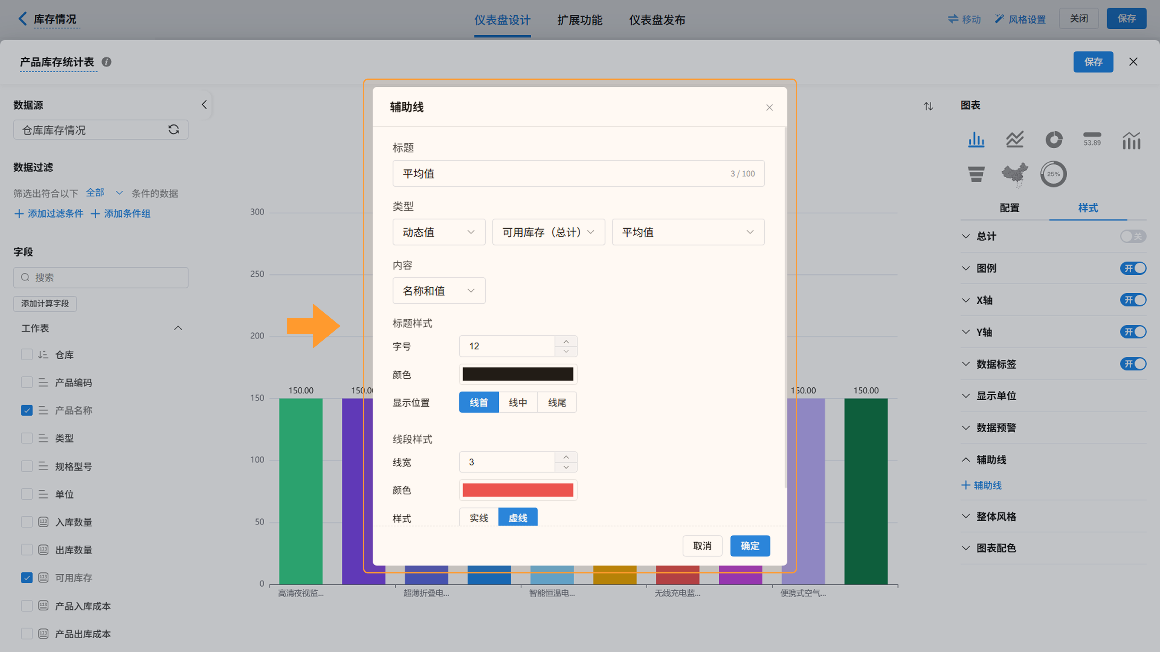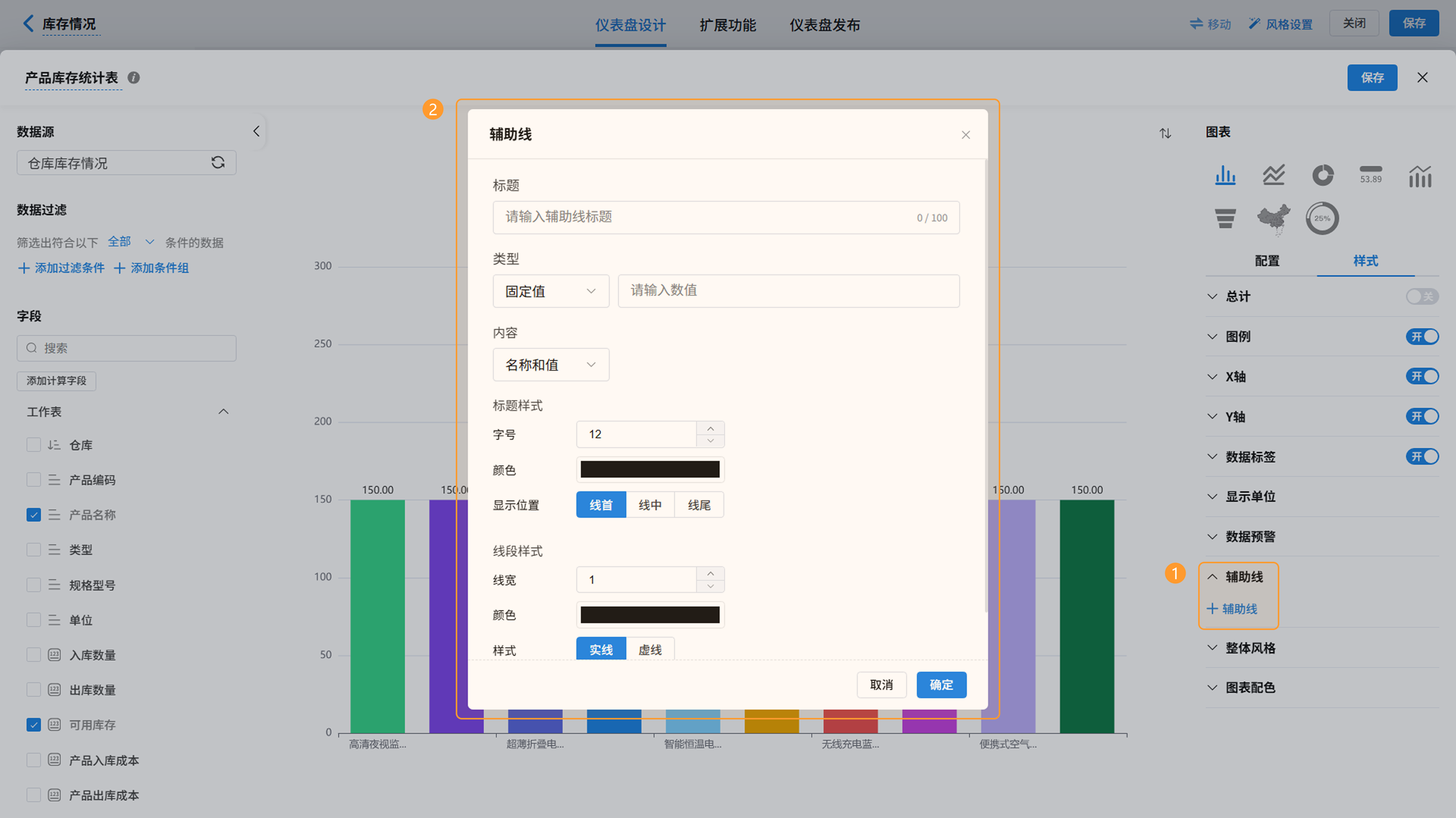 辅助线(也可称参考线)是在图表组件中添加的一条水平线,用于标记特定数值在纵轴上的位置,帮助用户更直观地对比数据或识别关键数值阈值。