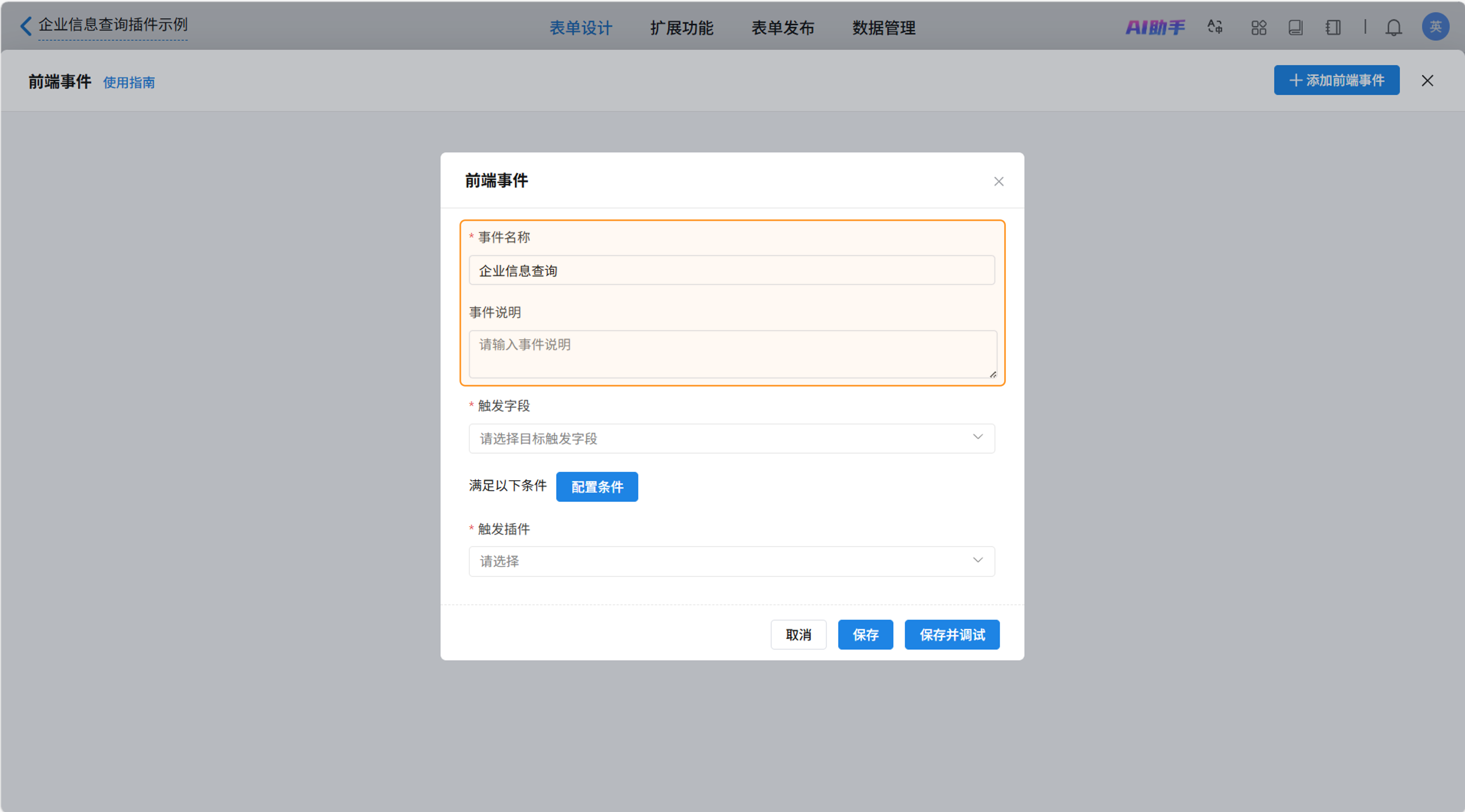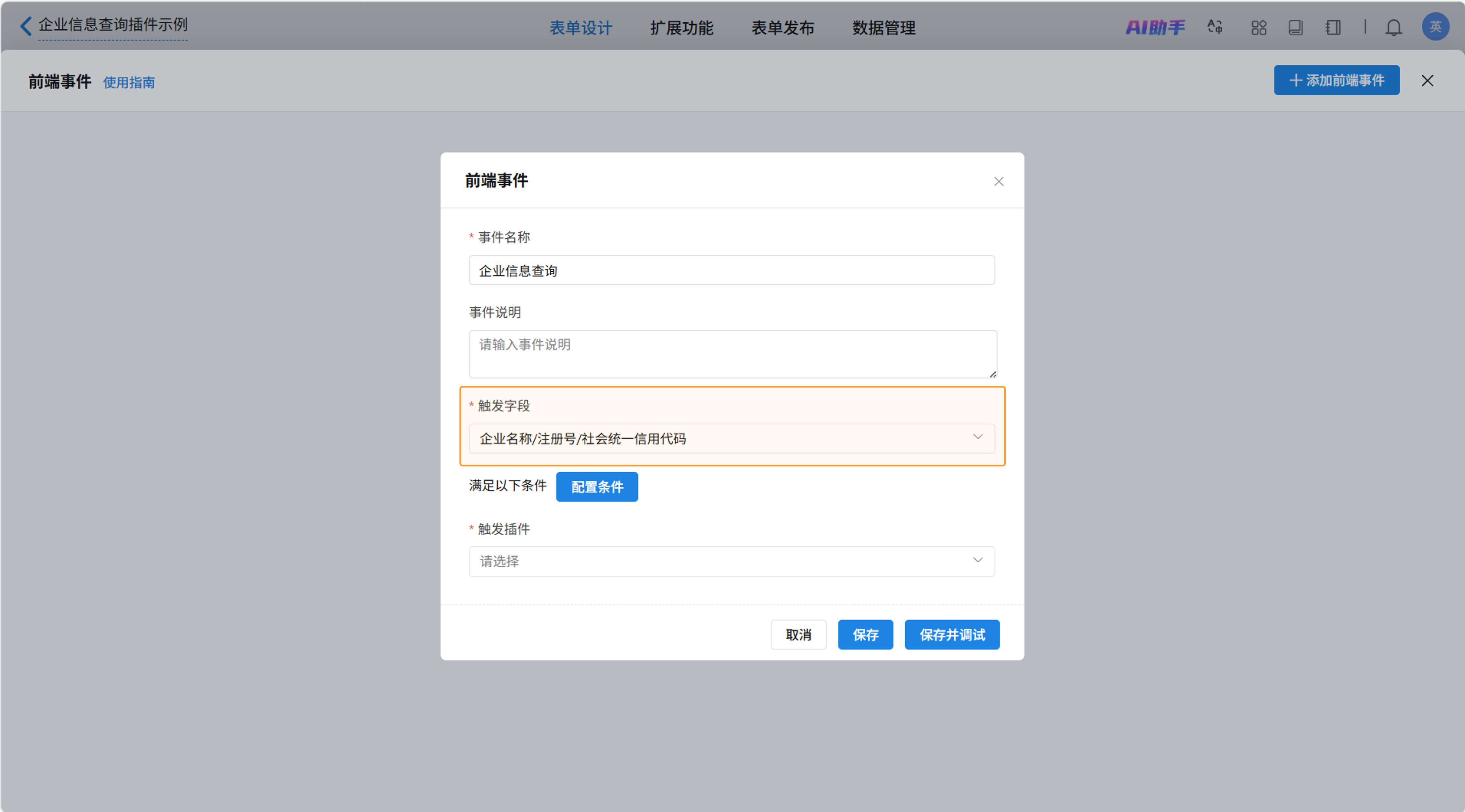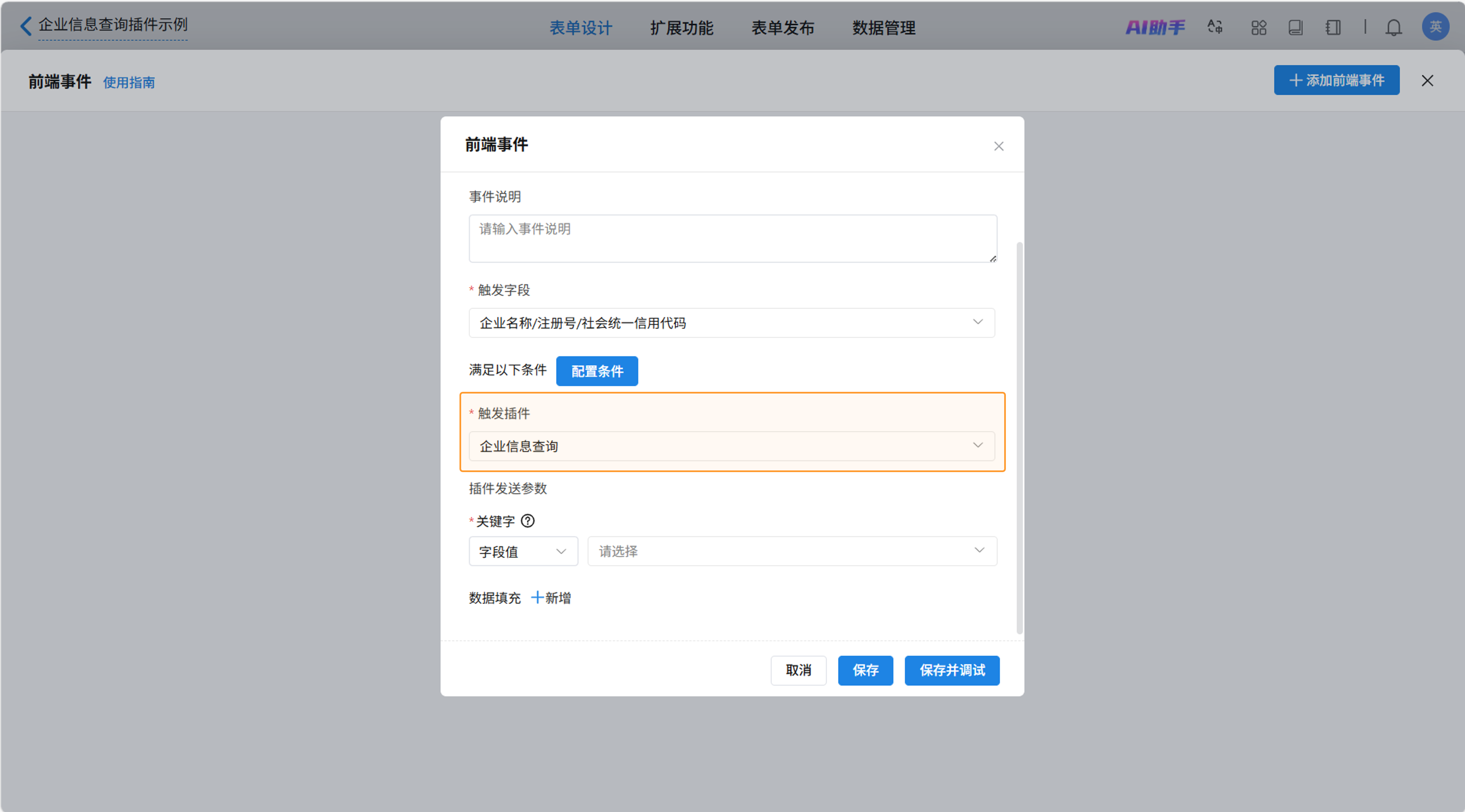 触发插件就是当前前端事件需要使用的插件。此处选择“企业信息查询”插件。