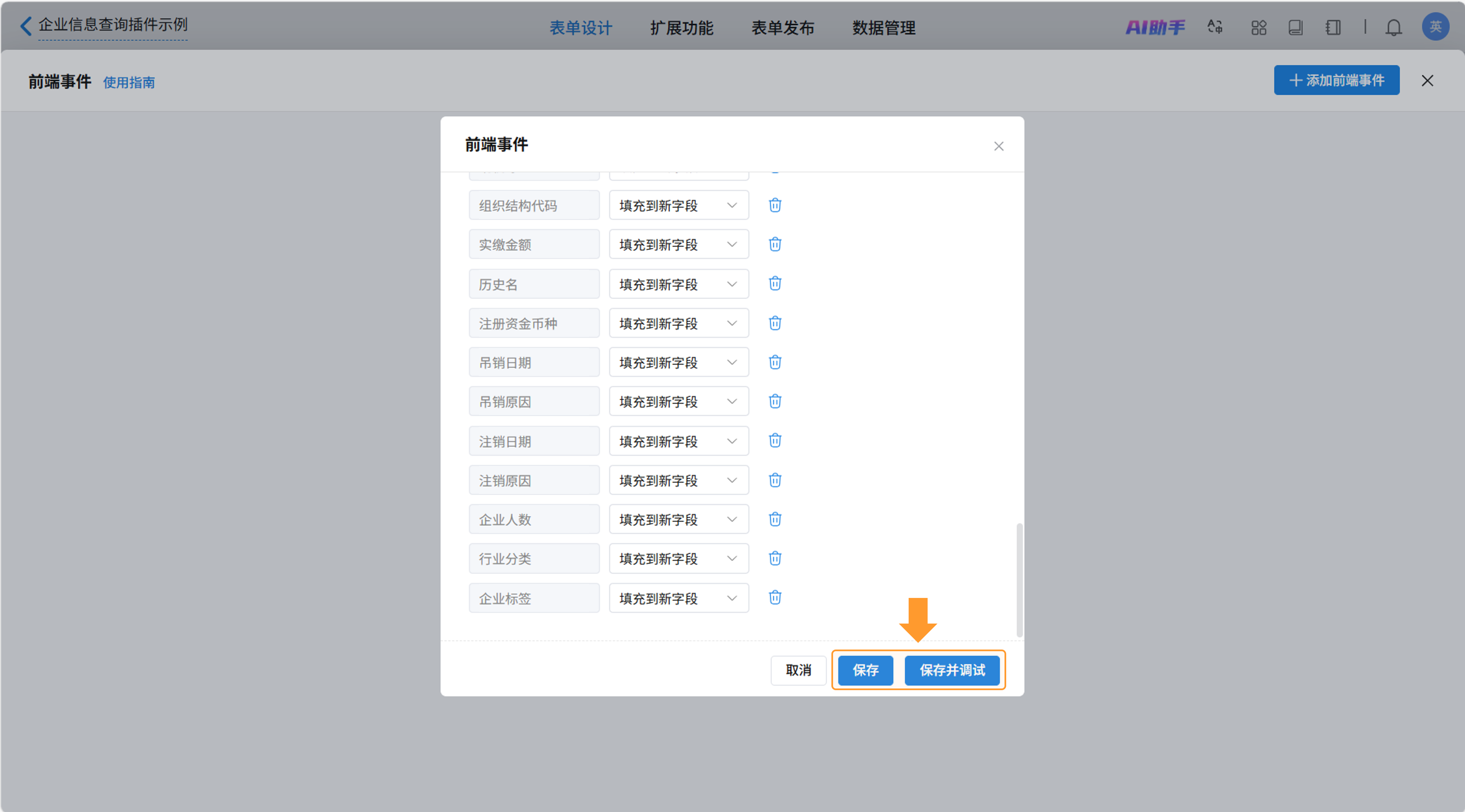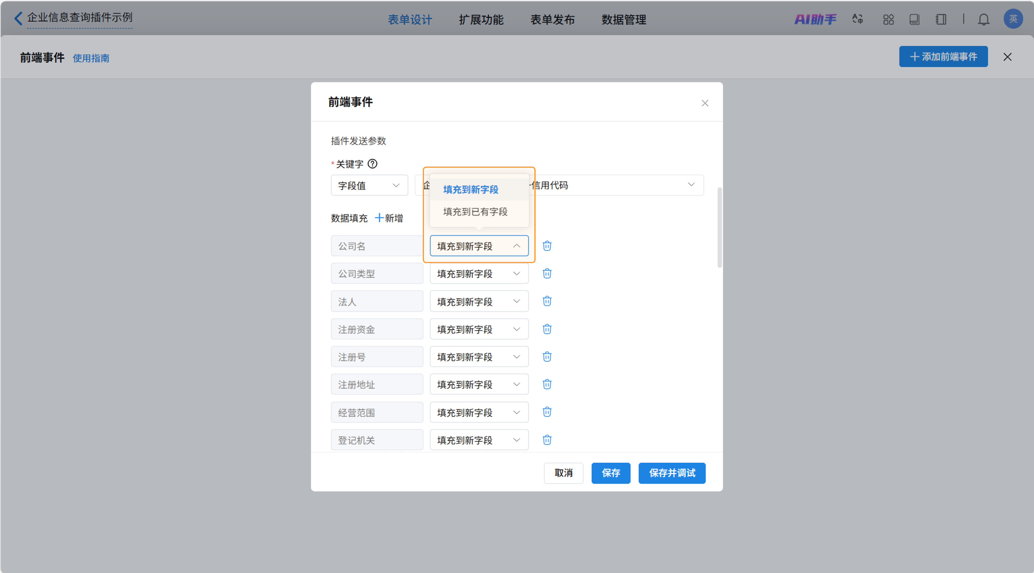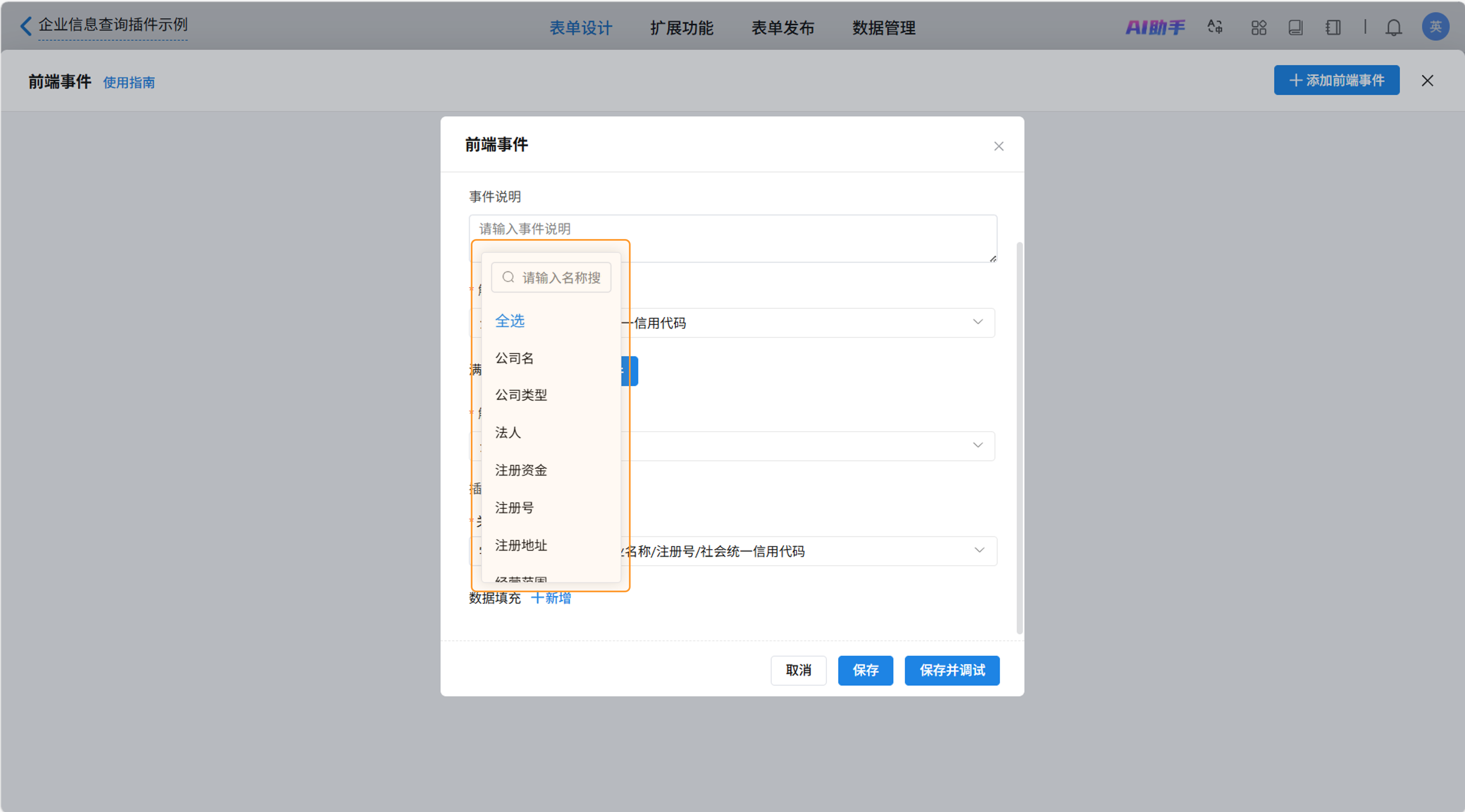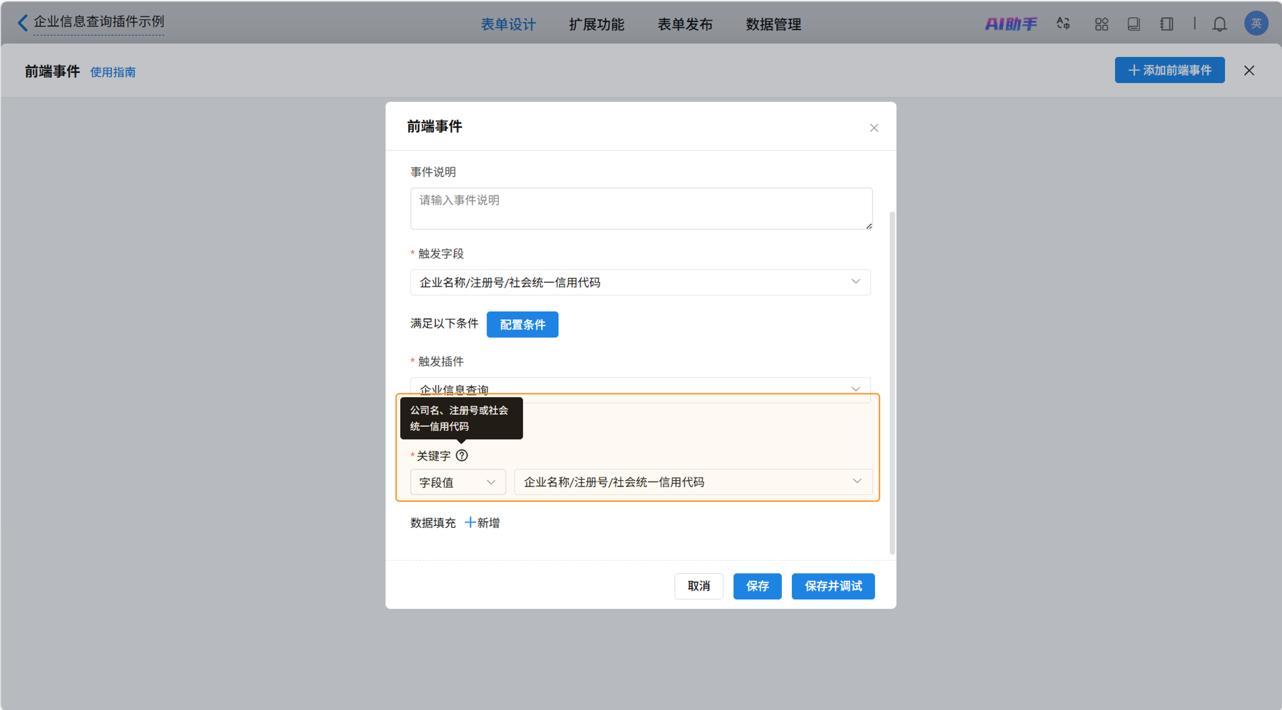 触发插件就是当前前端事件需要使用的插件。此处选择“企业信息查询”插件。