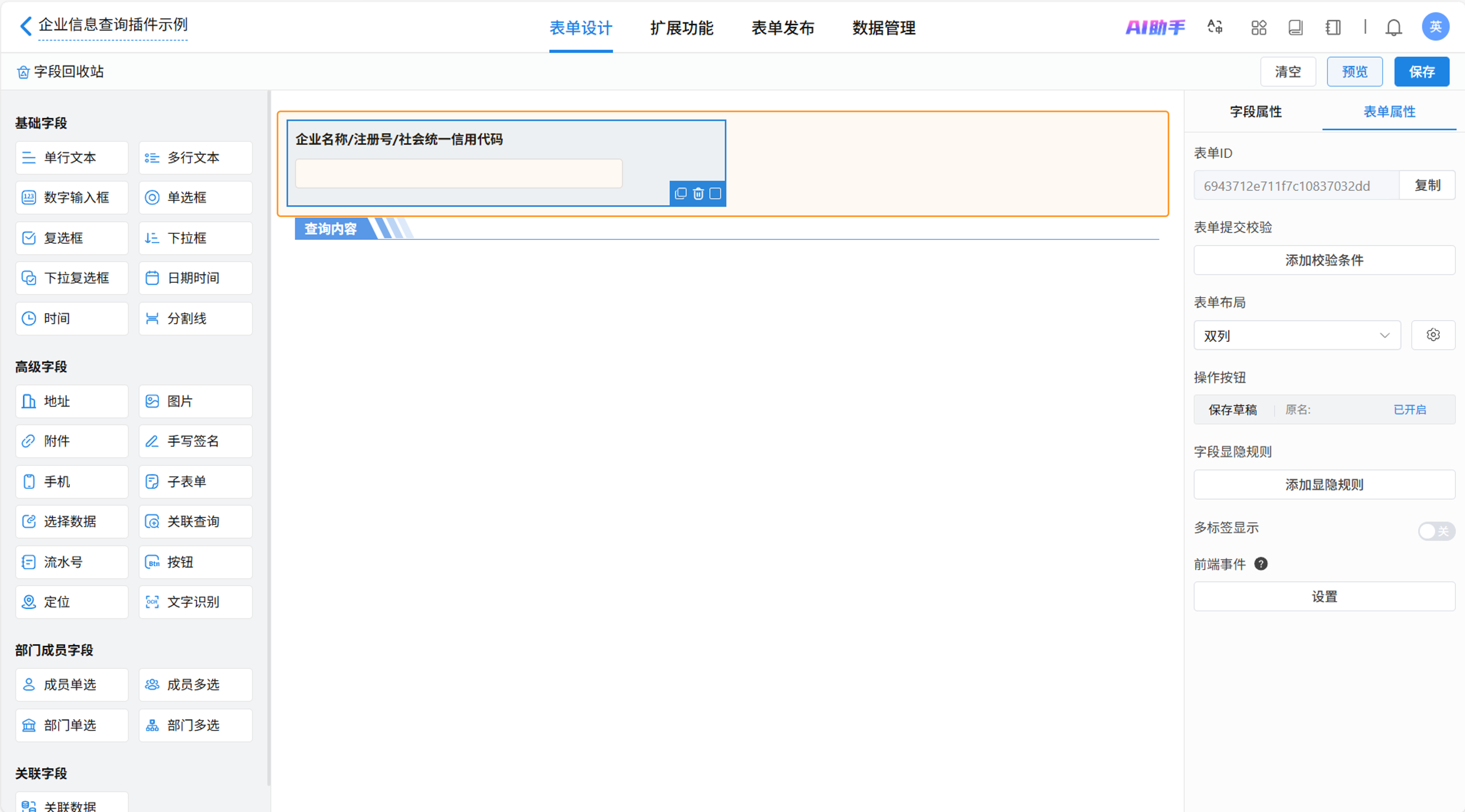 英雄云支持通过企业名称,注册号,社会统一信用代码对企业信息进行查询。添加“单行文本”字段存放上述信息。