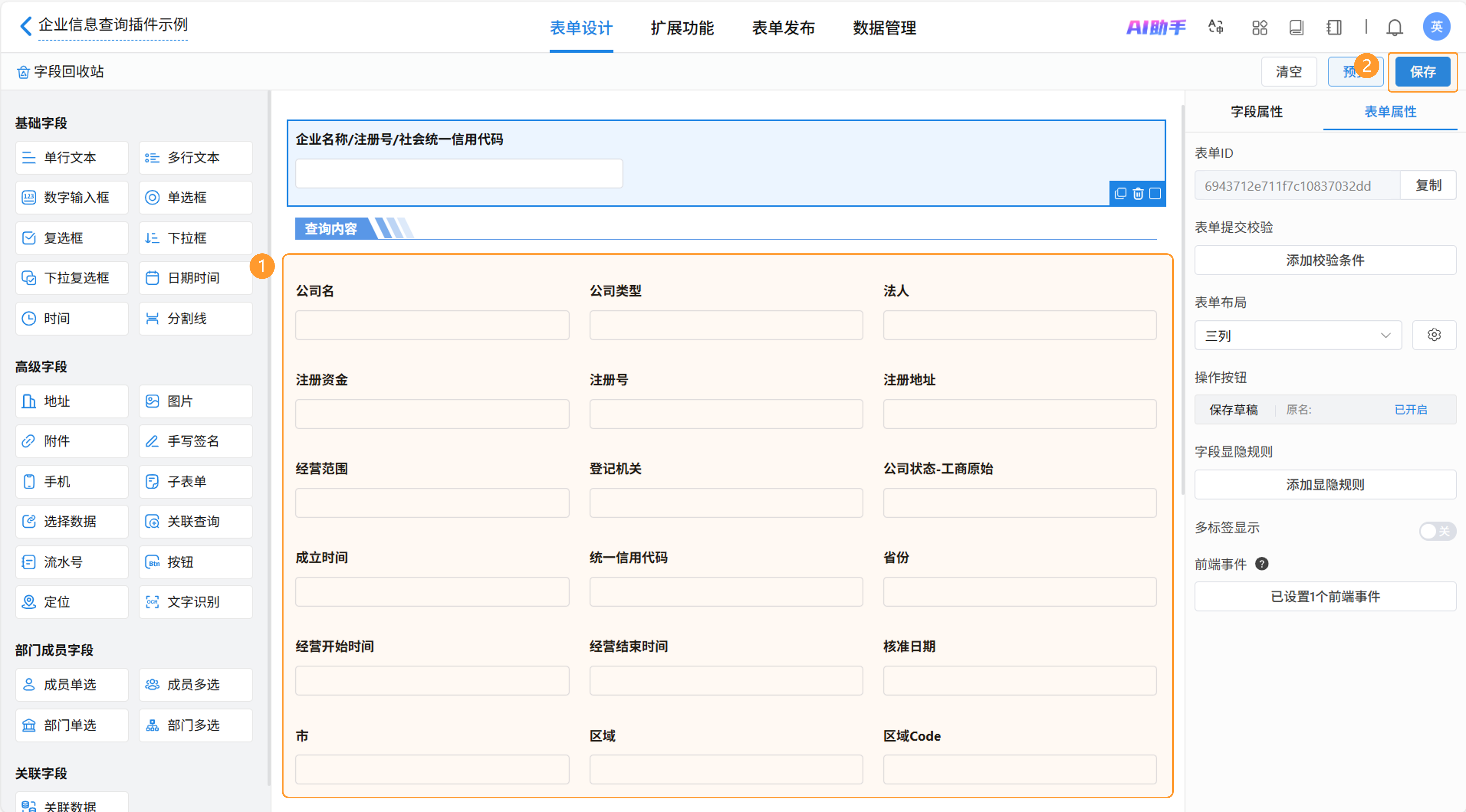 用户可以通过企业信息查询插件,实现输入企业名称、注册号或企业社会统一信用代码后,将企业的其他相关信息填入表单中的对应字段中。通过企业信息查询插件,用户可查询到的信息如下: