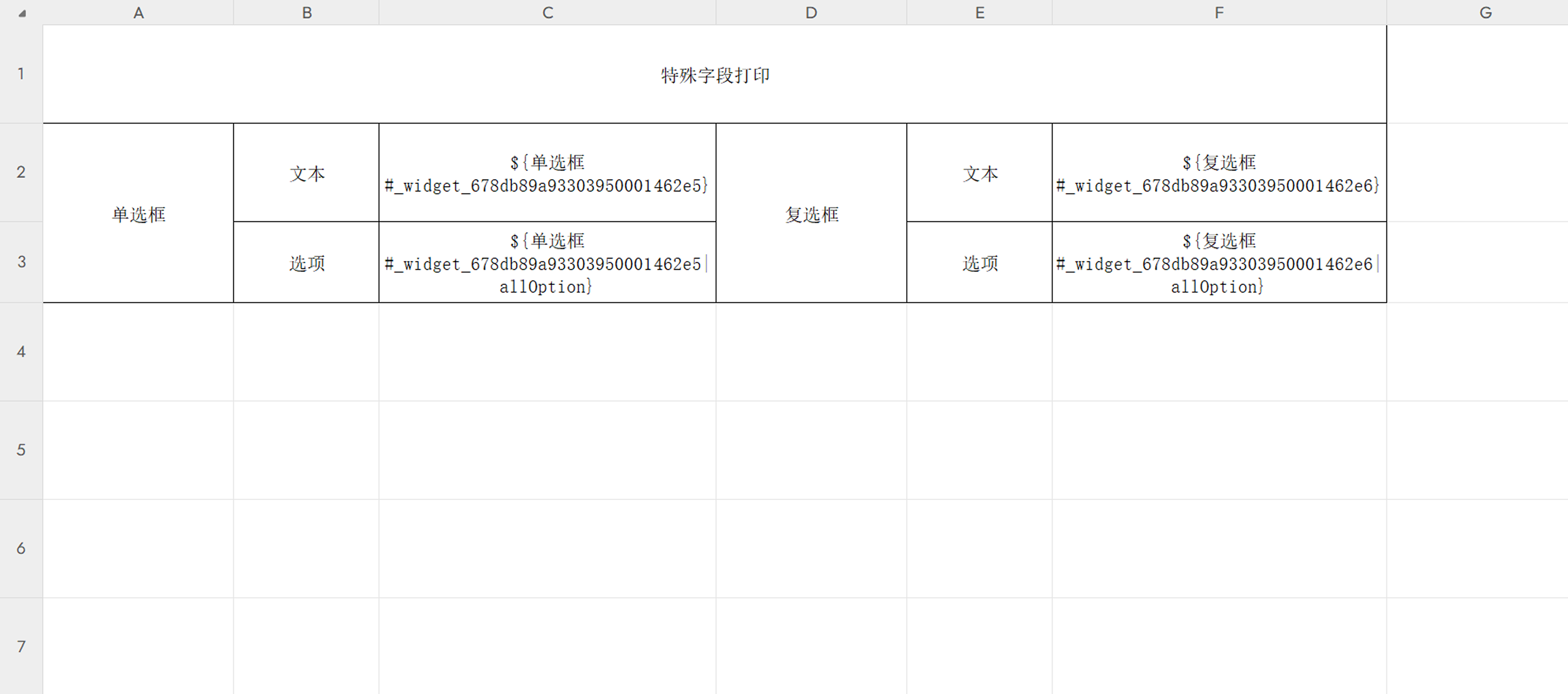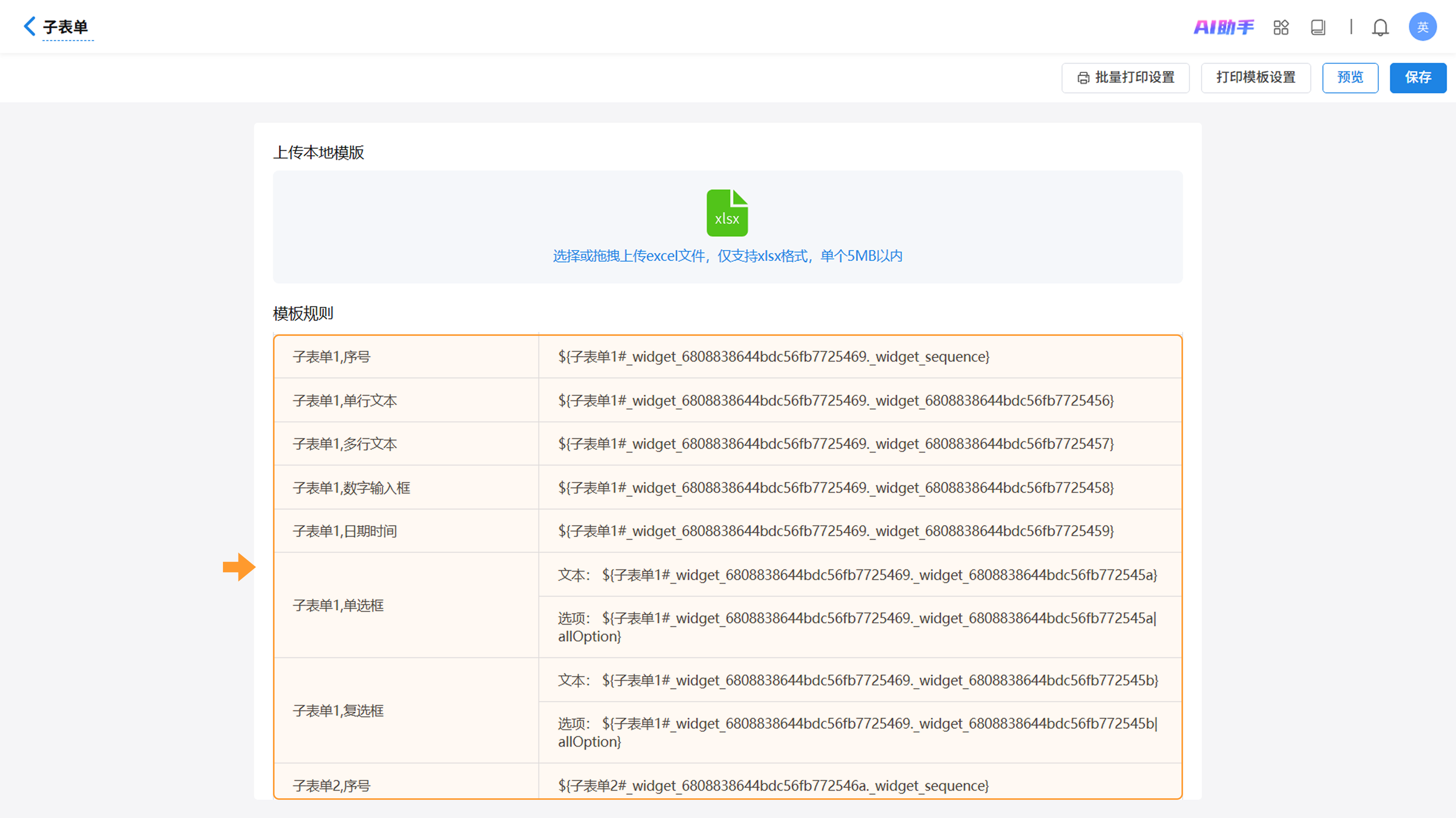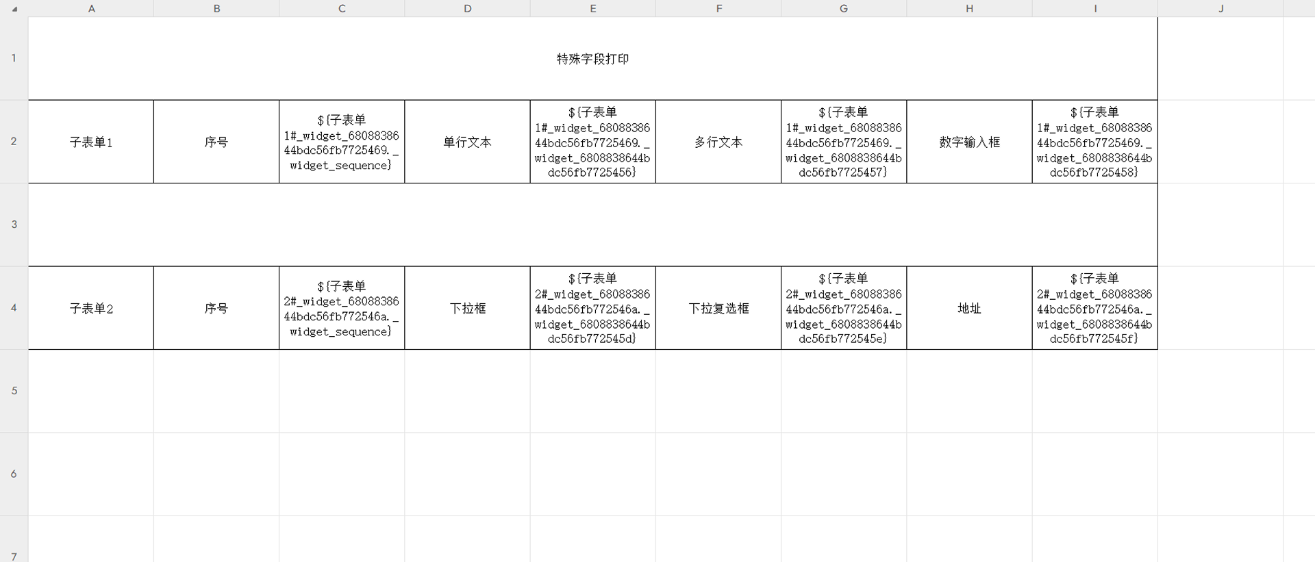 - 子表单中各字段单独提供代码。除分割线、查询、选择数据、文字识别外的字段都支持打印;