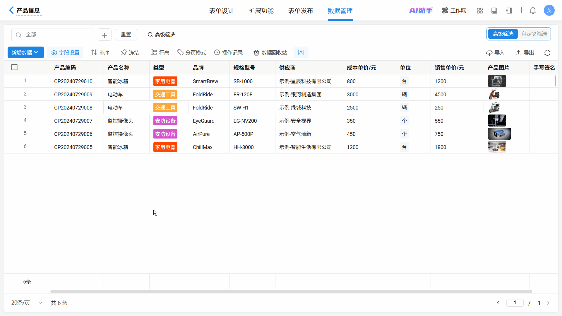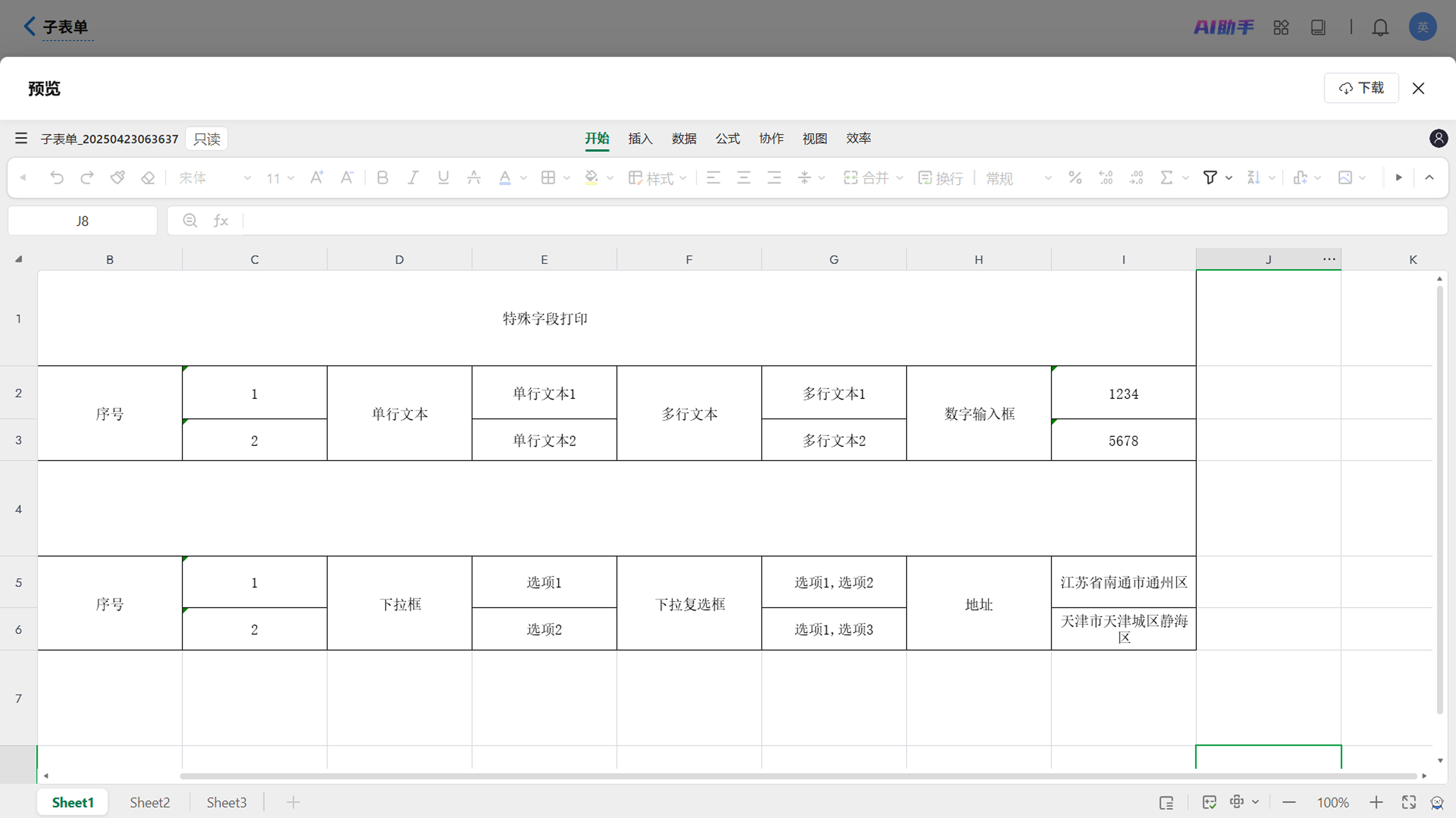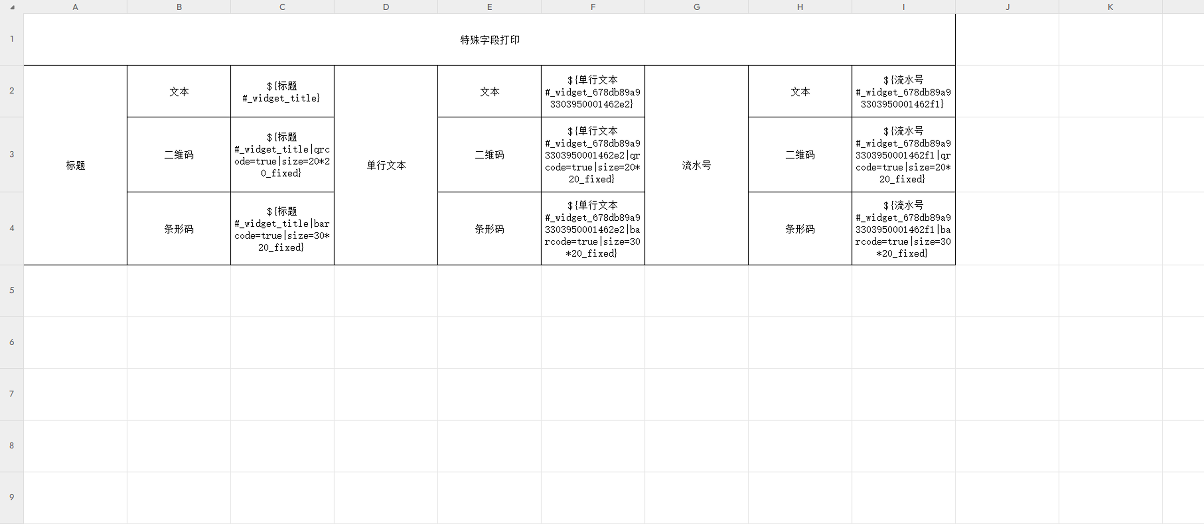- 子表单中各字段单独提供代码。除分割线、查询、选择数据、文字识别外的字段都支持打印;