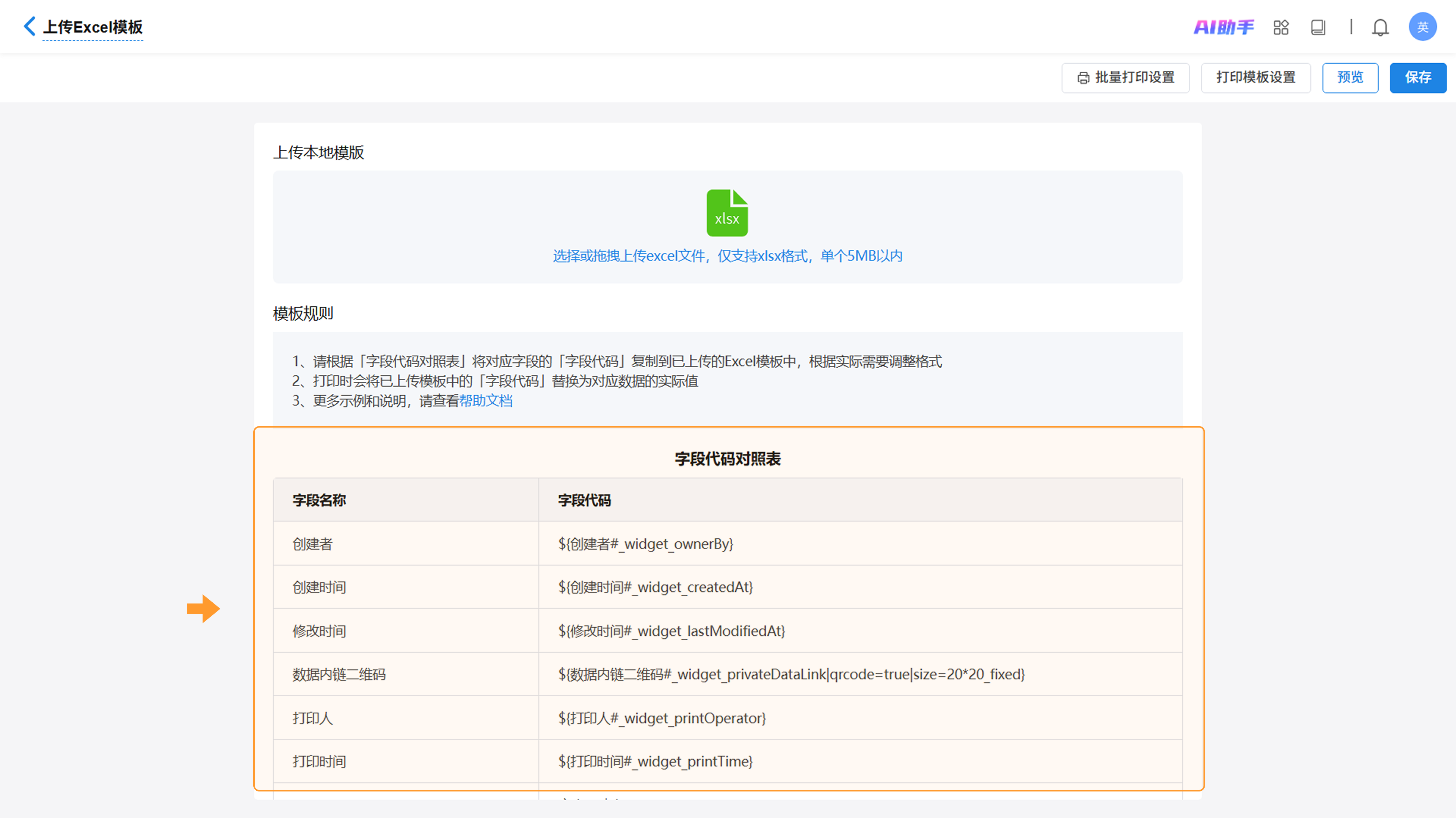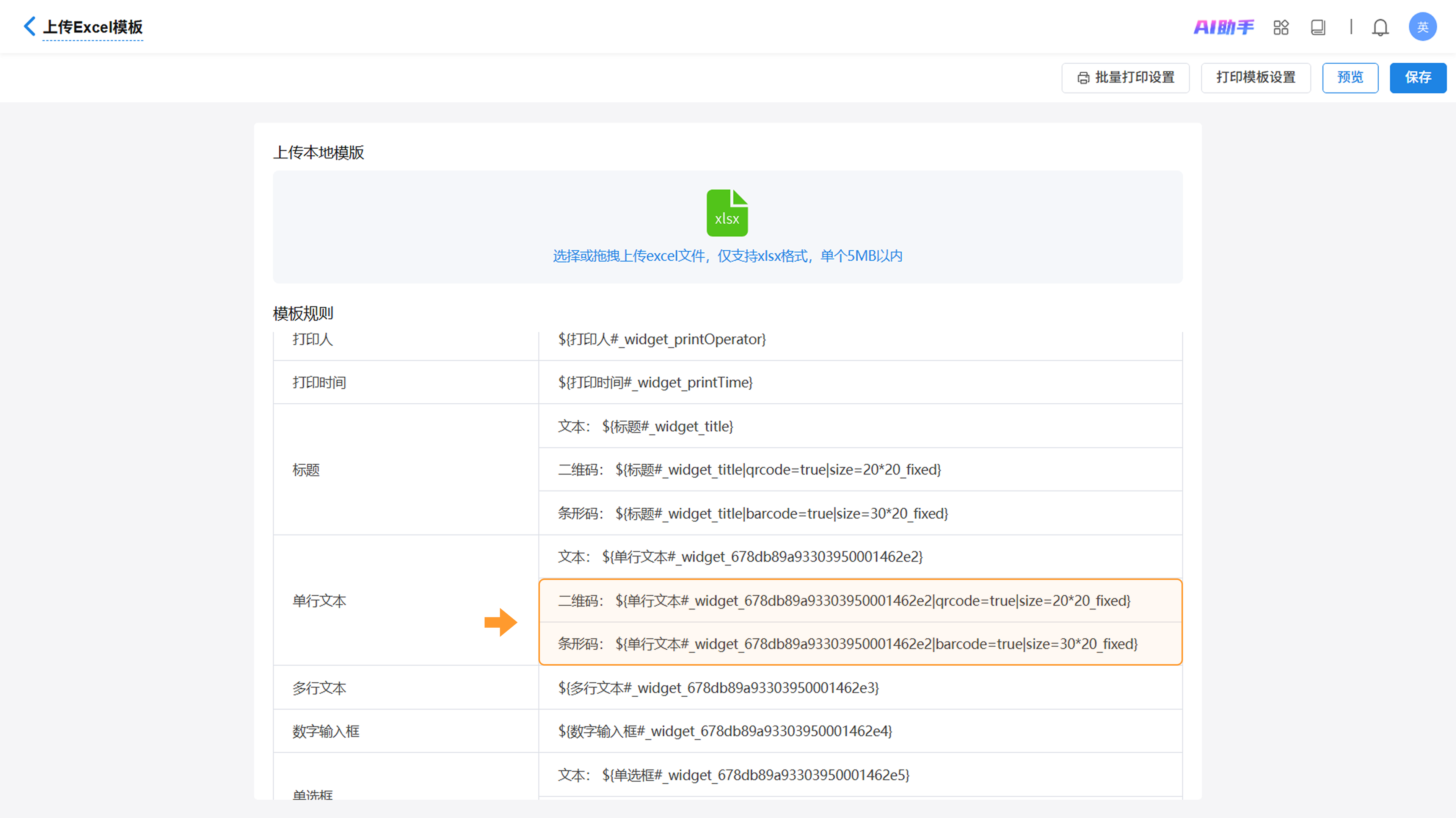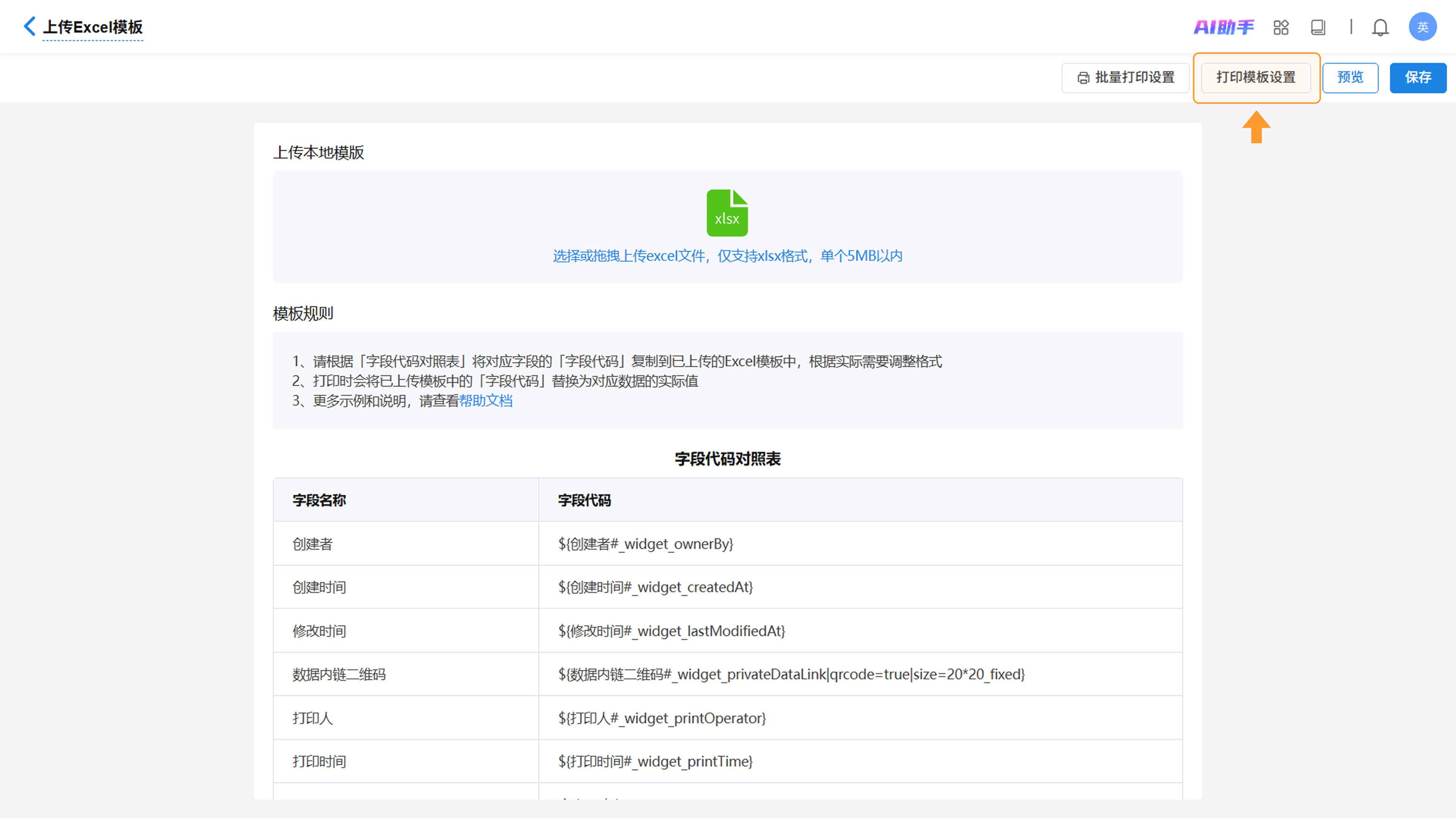 上传模板后,点击右上角“预览”按钮即可实时查看打印效果。若需调整,用户可随时修改本地Excel模板并重新上传,直至满足企业打印需求。