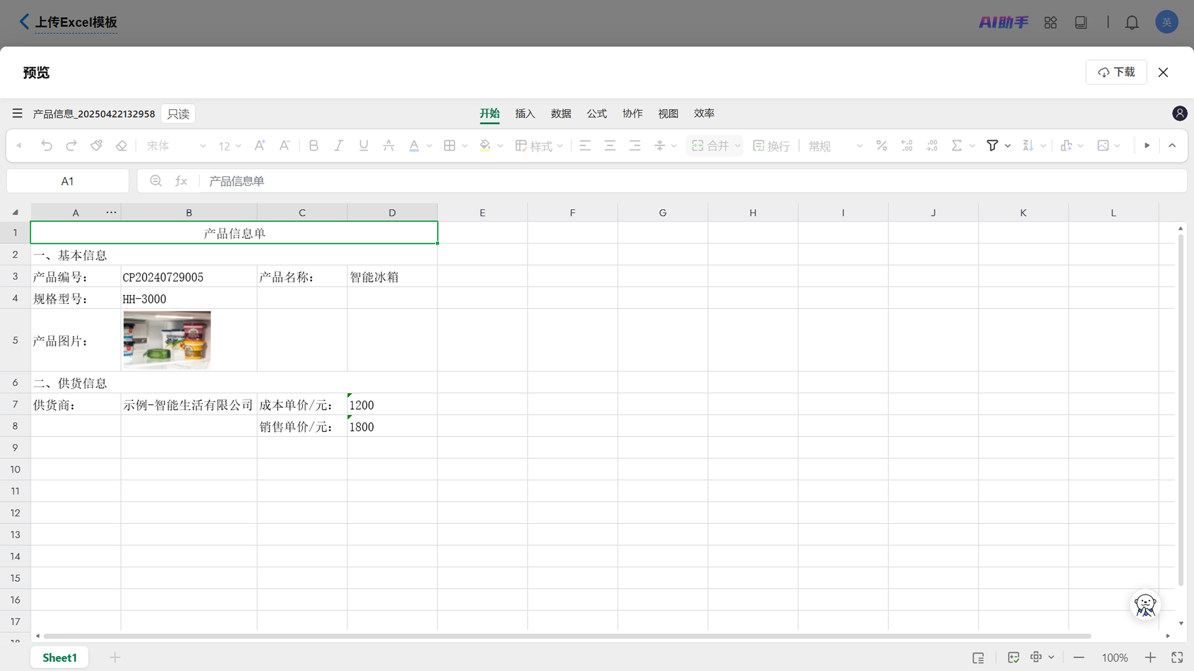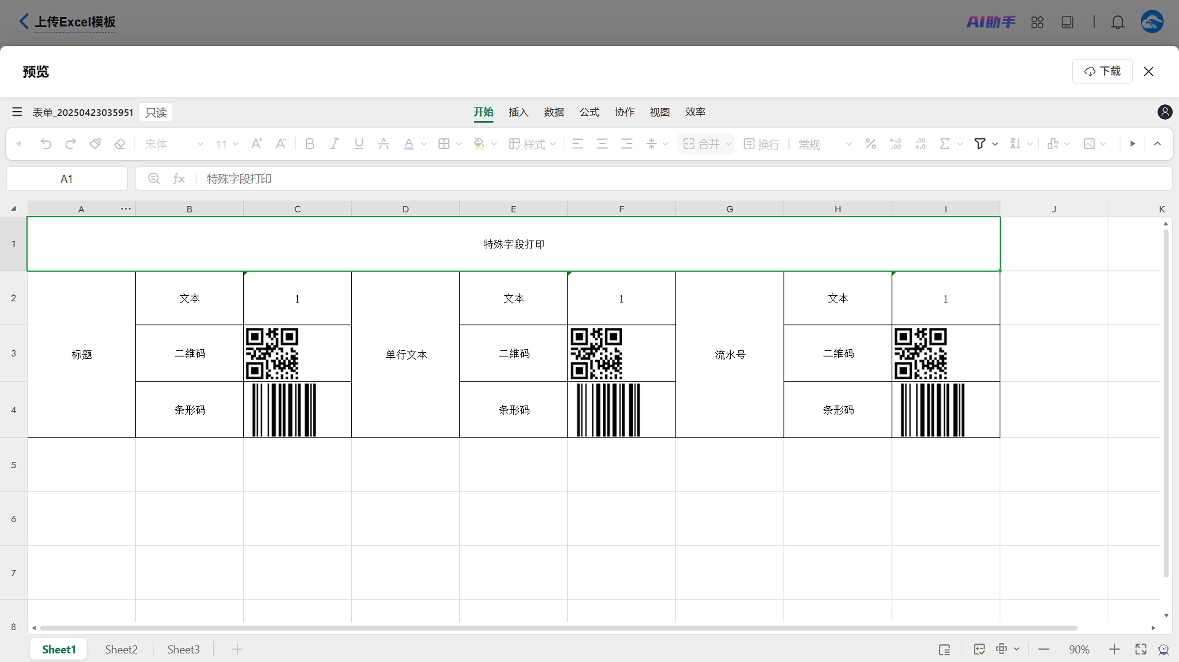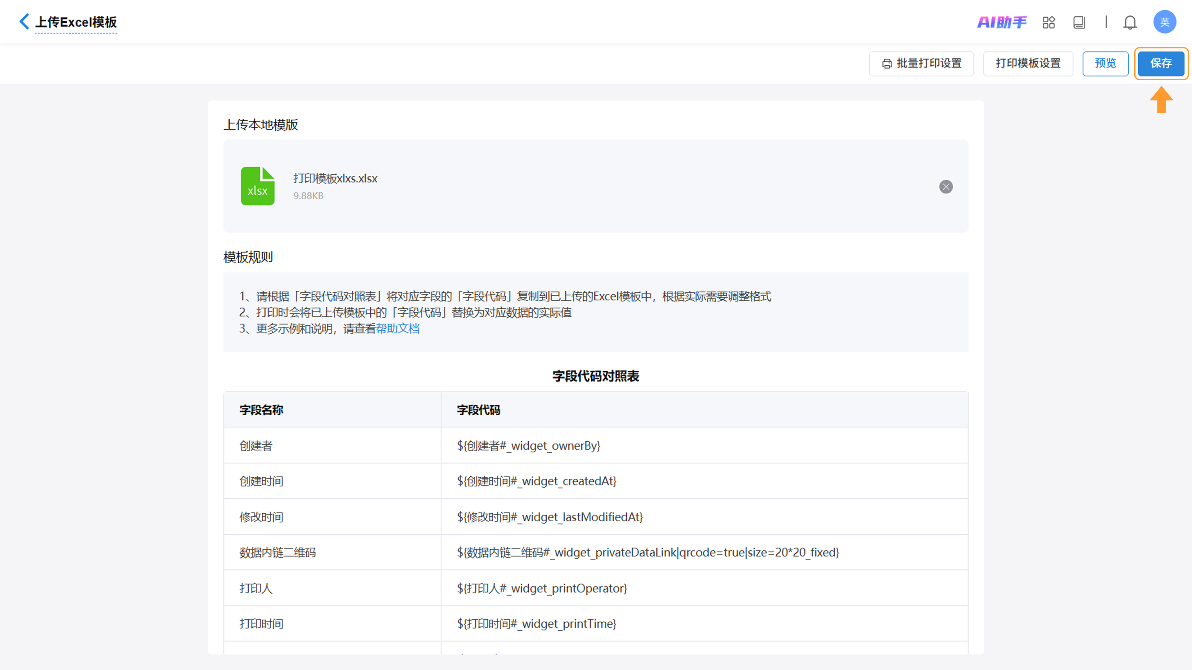 上传模板后,点击右上角“预览”按钮即可实时查看打印效果。若需调整,用户可随时修改本地Excel模板并重新上传,直至满足企业打印需求。