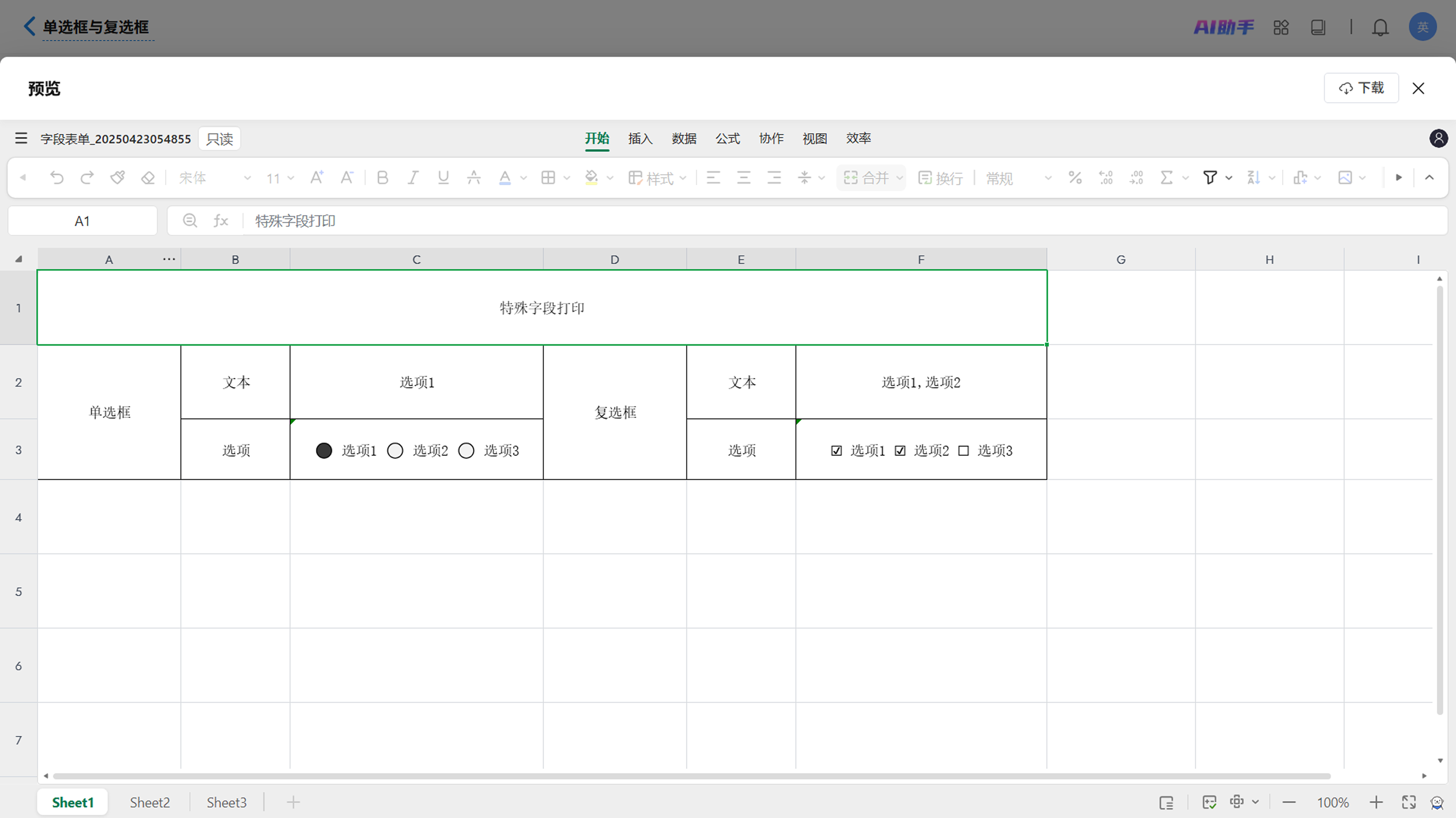 - 选项:打印所有选项文本,被选择的选项会被勾选。