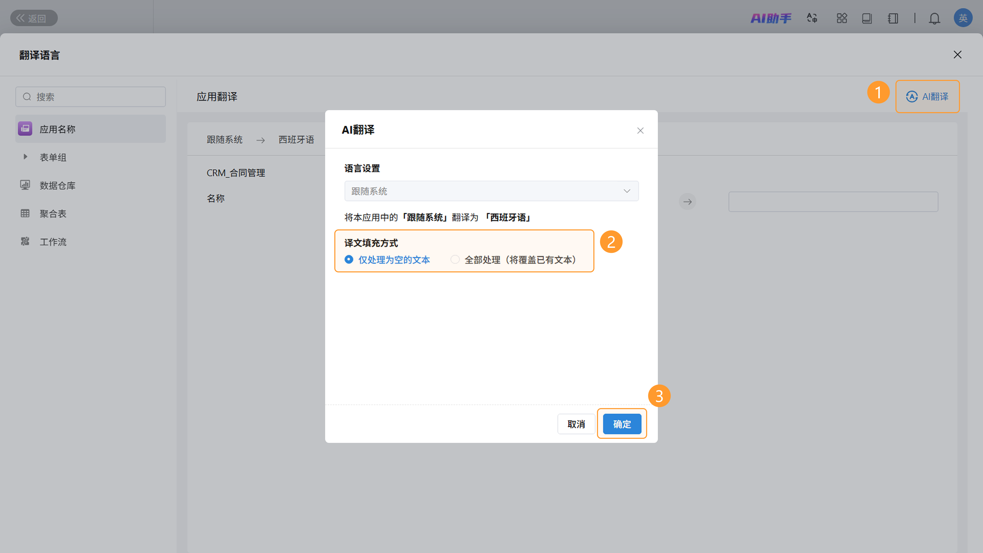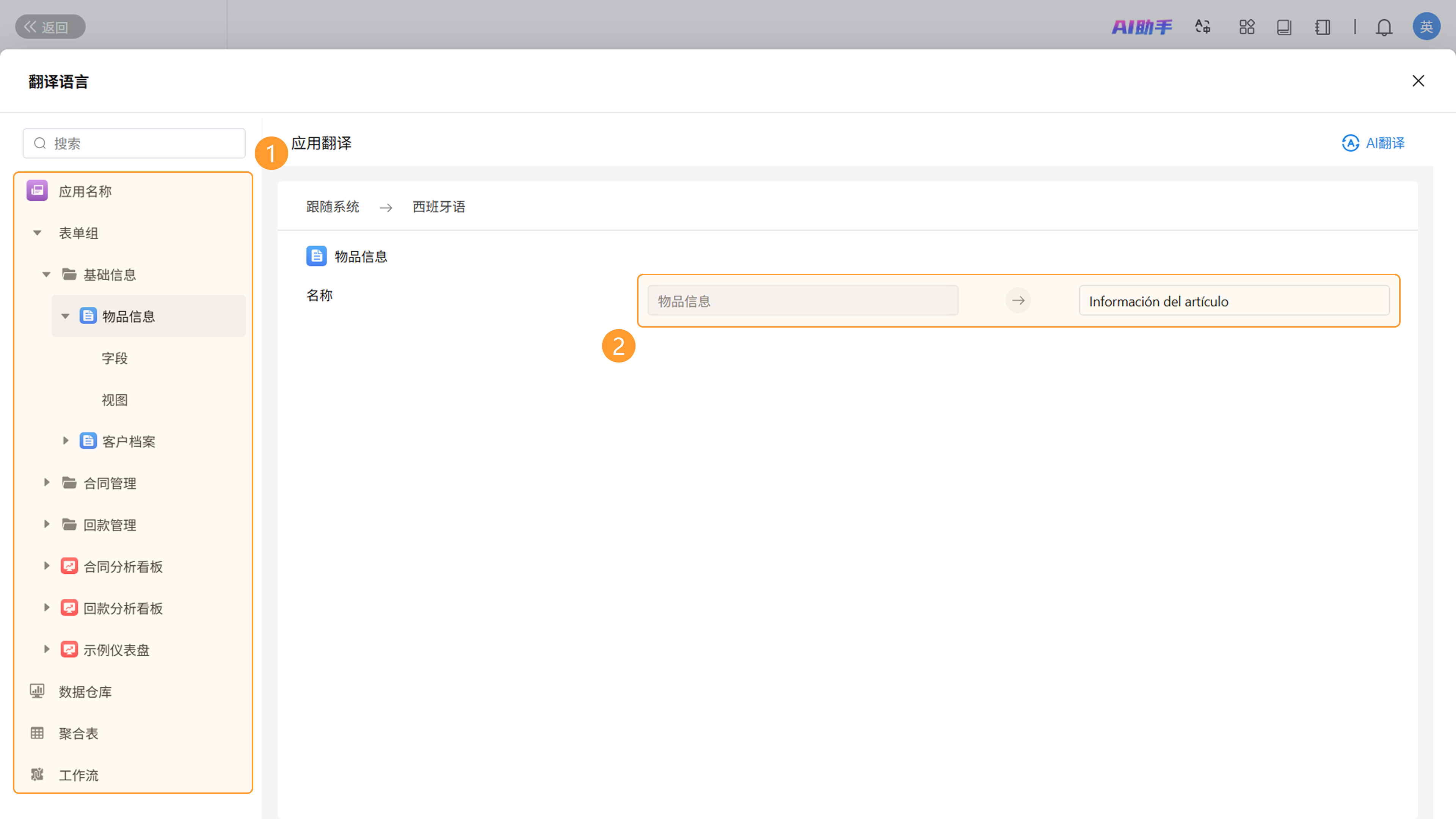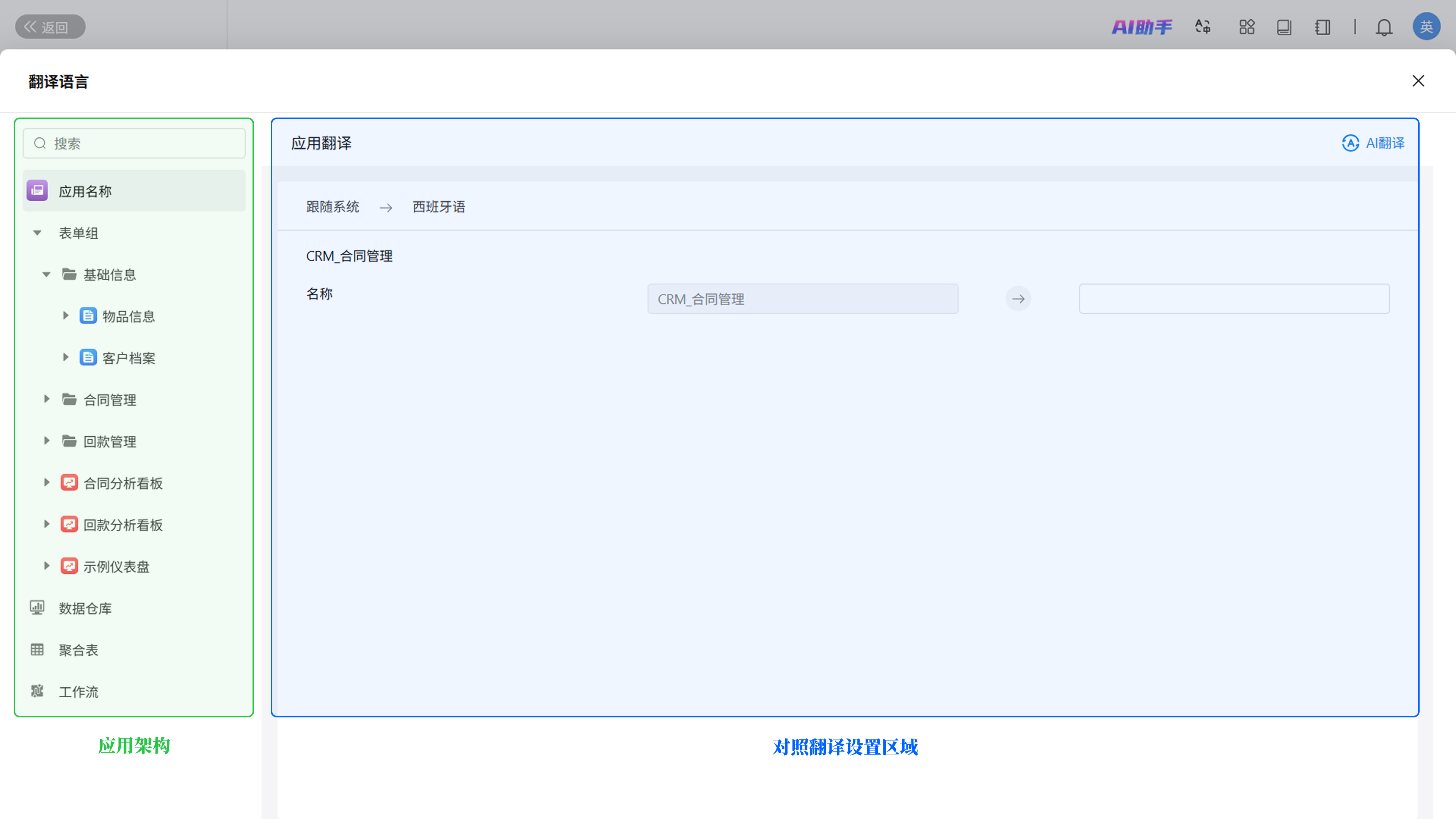 应用翻译功能基于强大的 AI 技术,能够一键实现表单、仪表盘、数据仓库等界面内容的多语言转换。同时,系统支持管理员进行人工校对与优化,以确保业务术语的专业性与准确性。