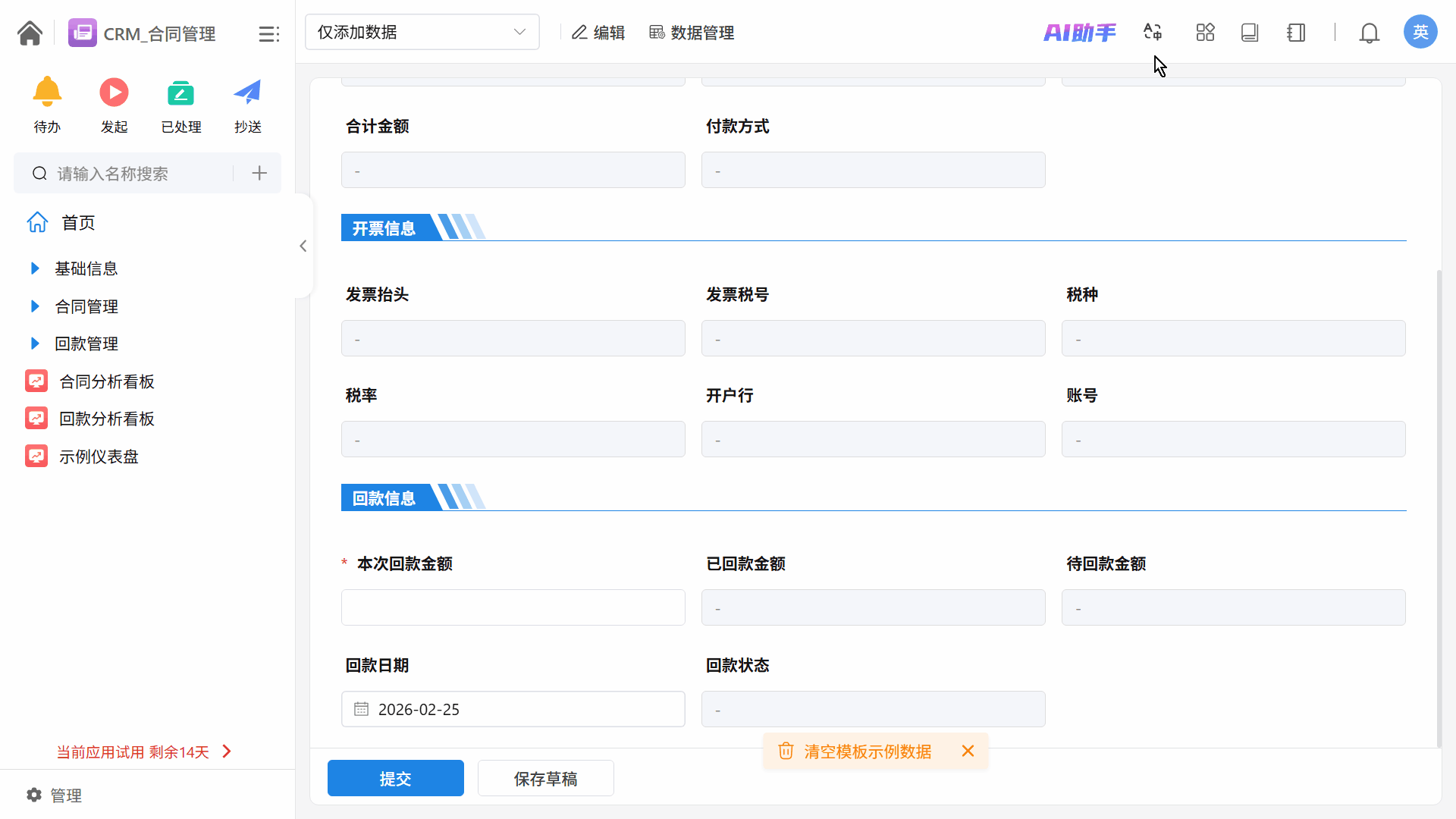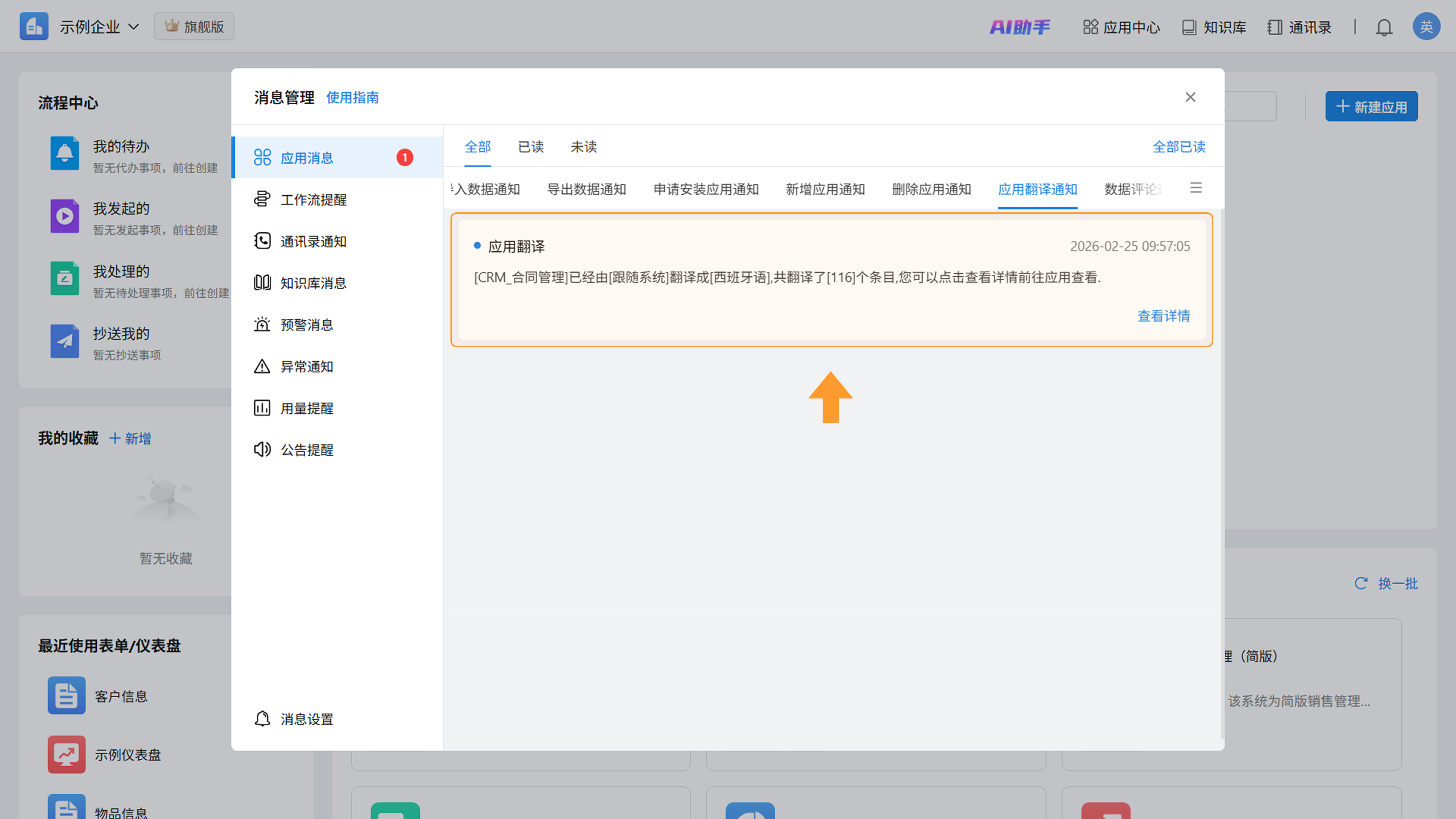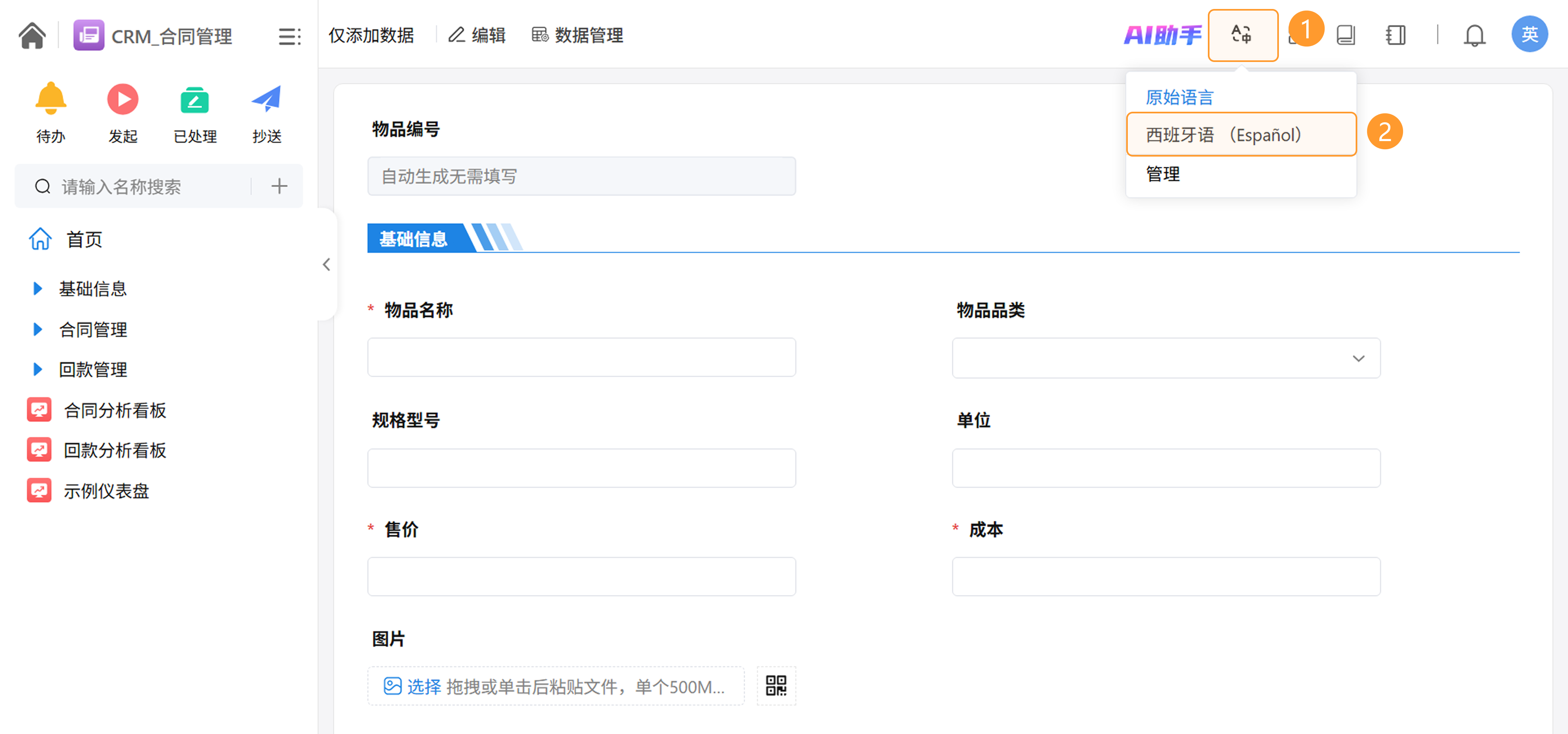 应用翻译功能基于强大的 AI 技术,能够一键实现表单、仪表盘、数据仓库等界面内容的多语言转换。同时,系统支持管理员进行人工校对与优化,以确保业务术语的专业性与准确性。