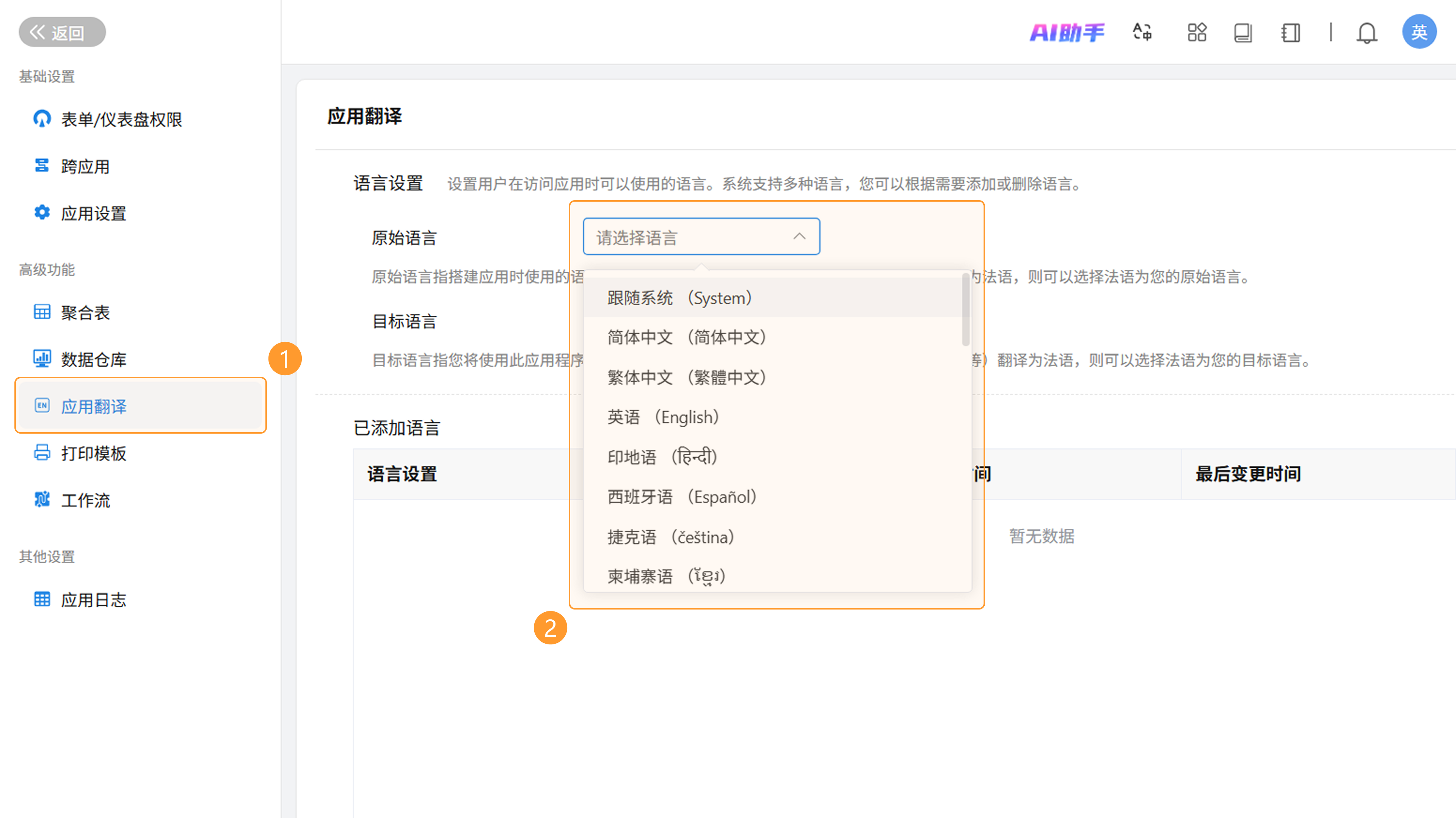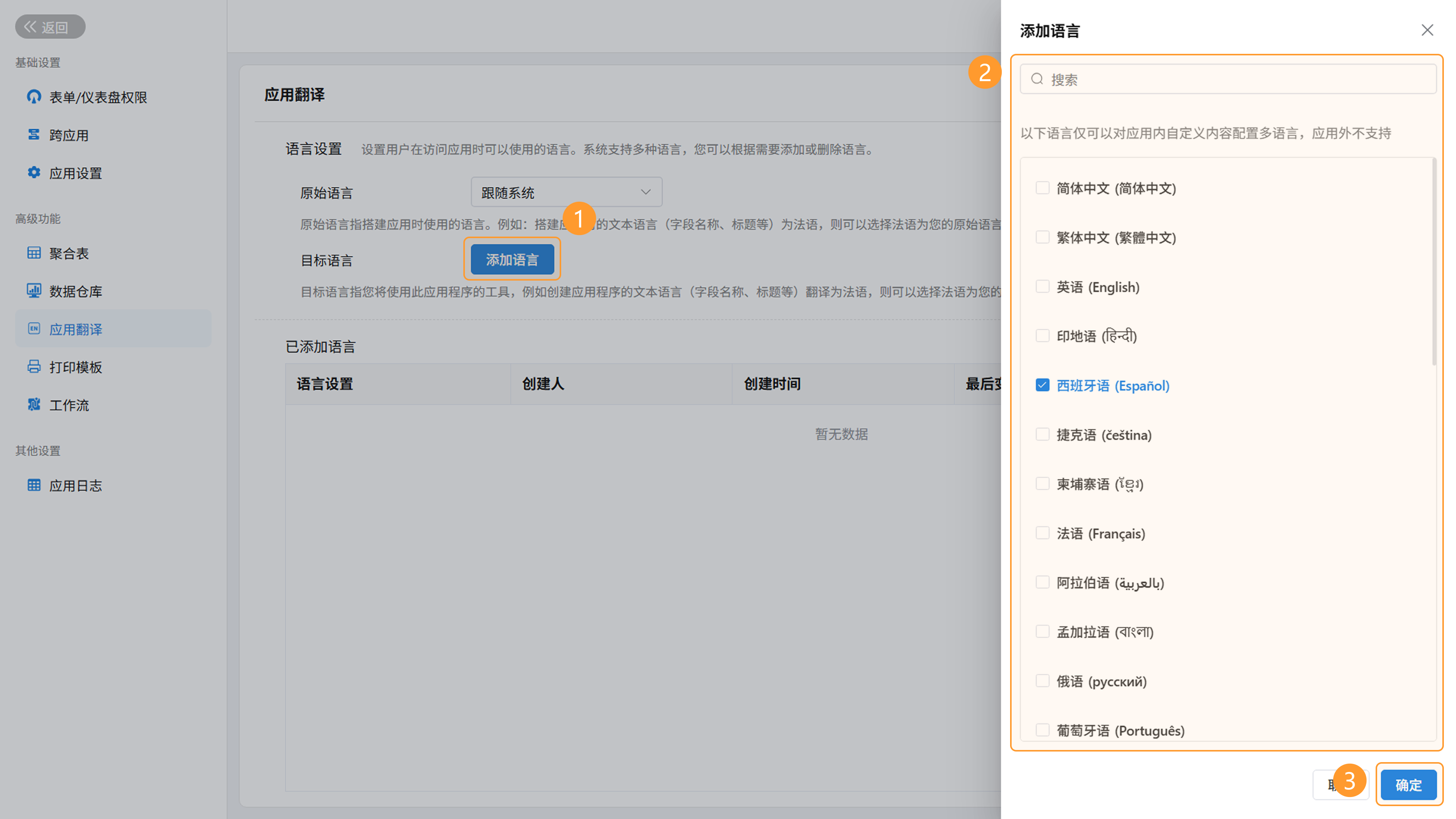 切换语言后,应用内的所有配置项(如表单字段名称、图表标题等)将即时转变为目标语种,实现多语言办公环境。