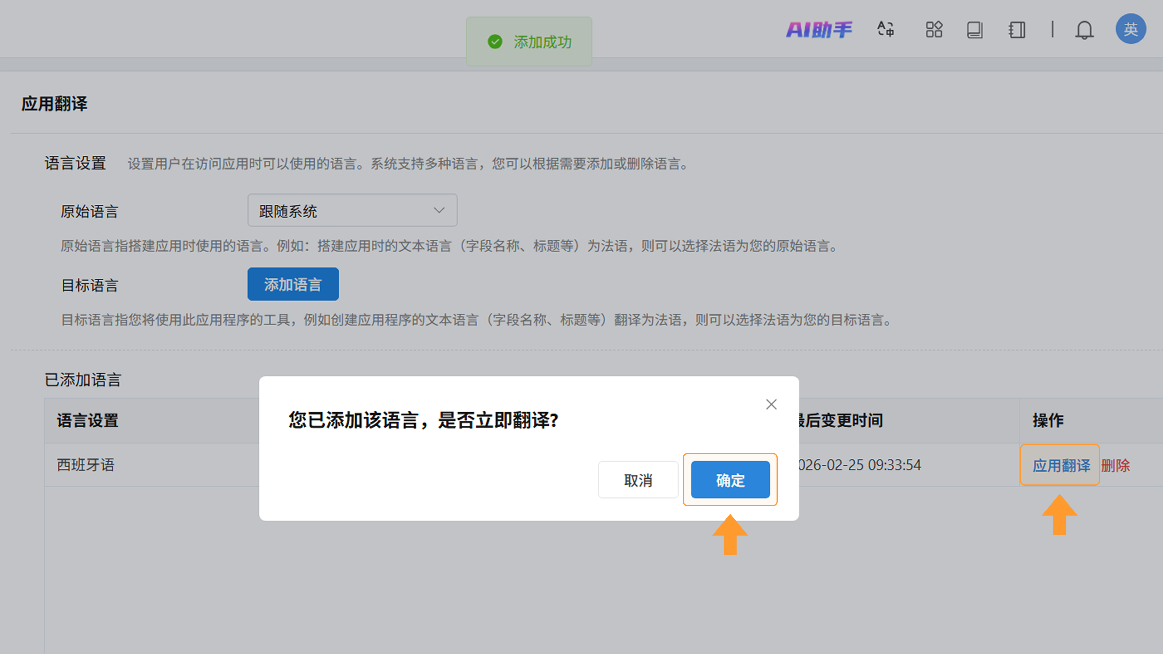 添加成功后,您可点击弹窗中的「确定」,也可在对应语言的操作栏点击「应用翻译」进入配置页面。
