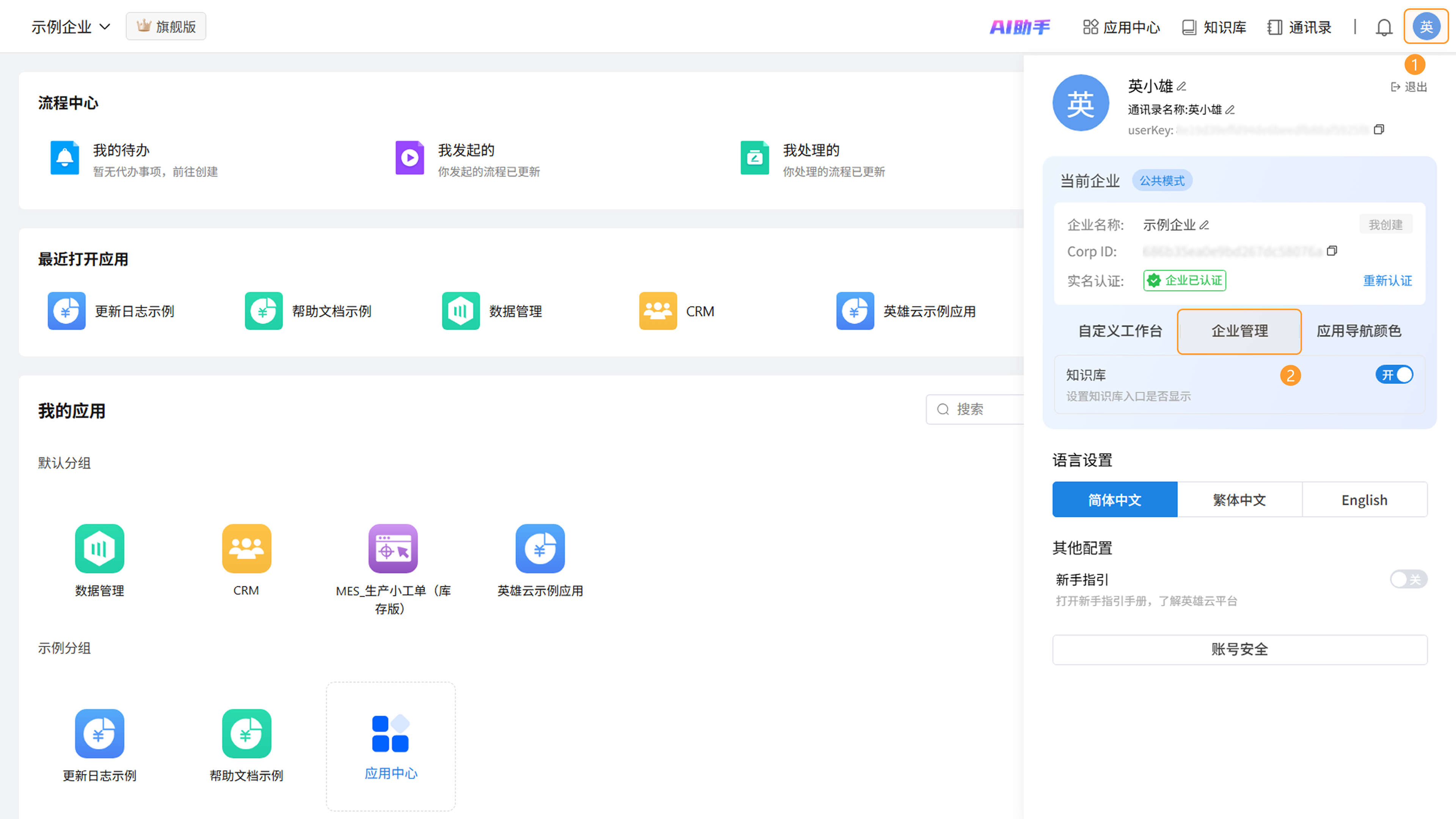 企业的创建者与系统管理员点击页面右上角头像,点击「企业设置」,进入当前企业的企业管理页面。
