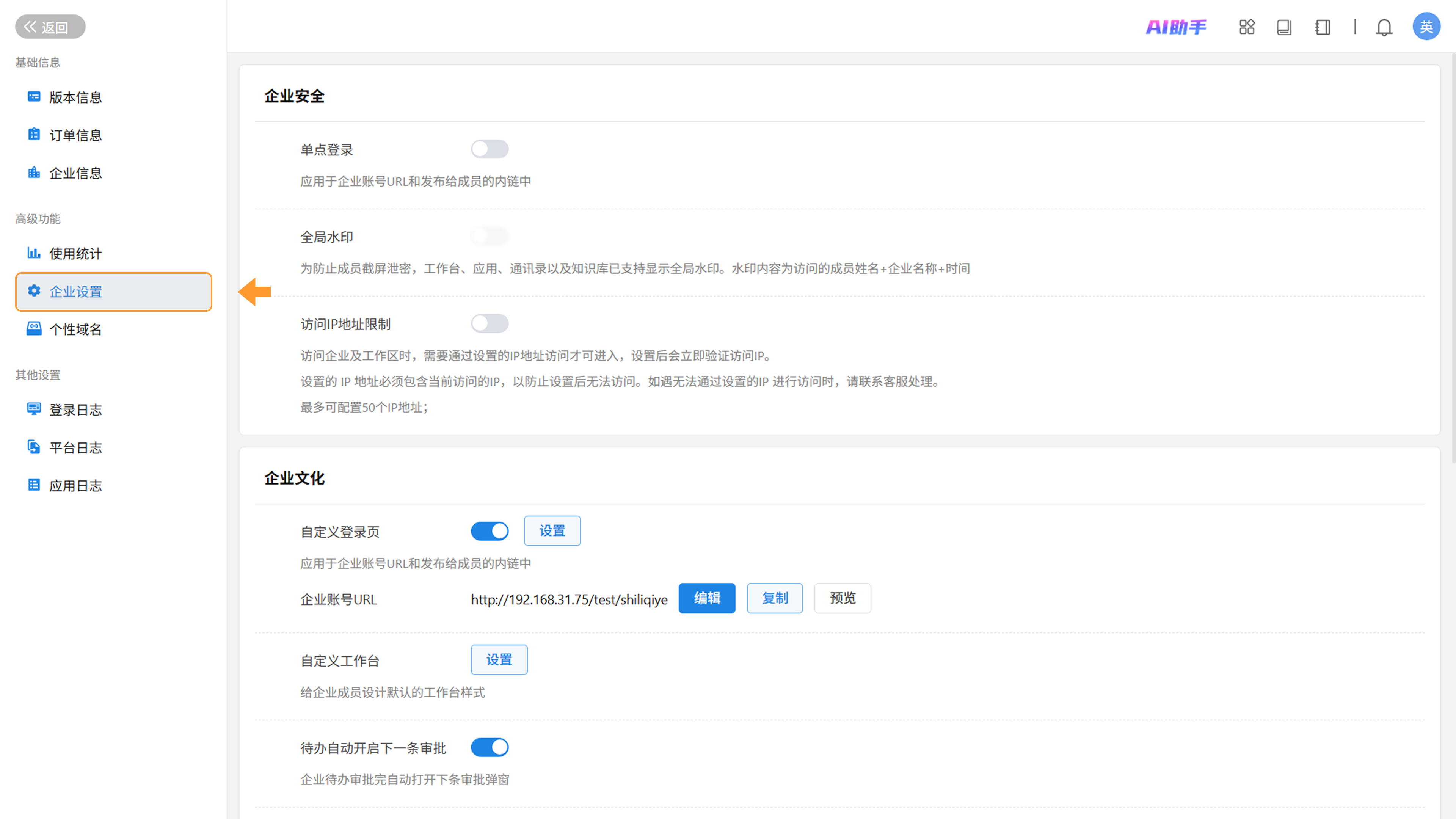 进入企业管理页面后,选择「企业设置」,即可对企业设置中内容进行配置操作。
