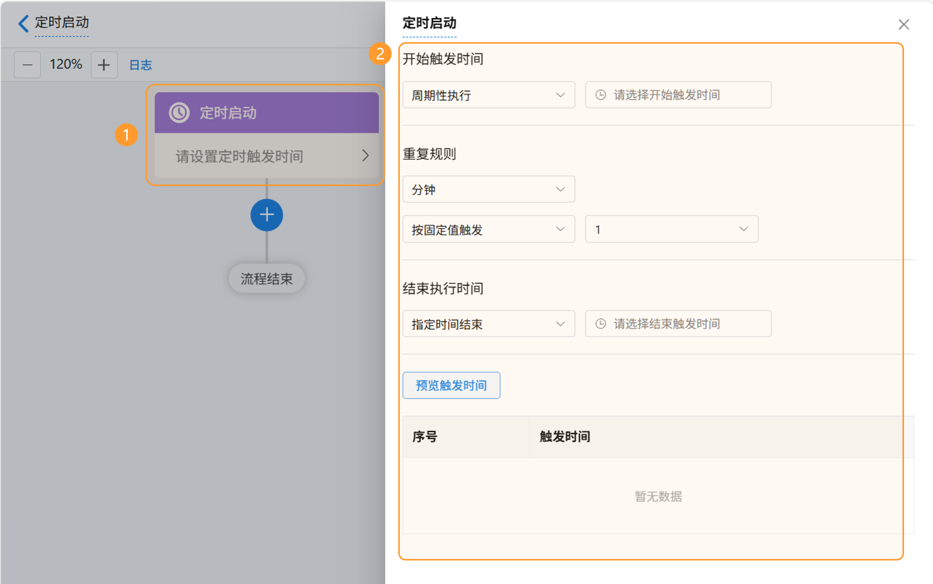 进入工作流设计页面后,通过点击定时启动节点,唤起节点配置窗口,可以对触发节点进行配置 。