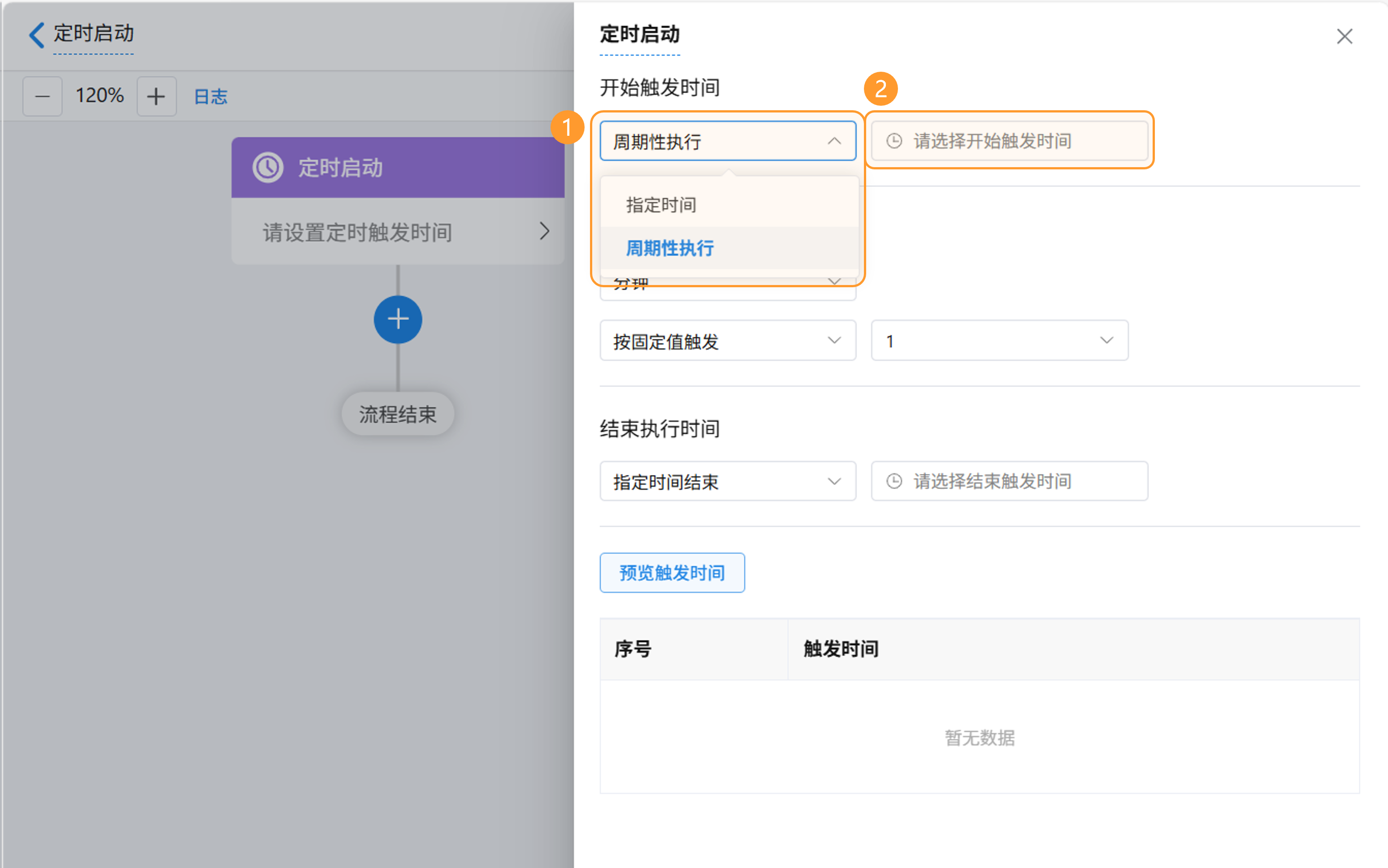在设置开始触发时间时,您可选择两种定时模式:「指定时间执行」(单次触发)或 「周期性执行」(重复触发),并在时间输入框中设置具体时间,可精确至时、分、秒。