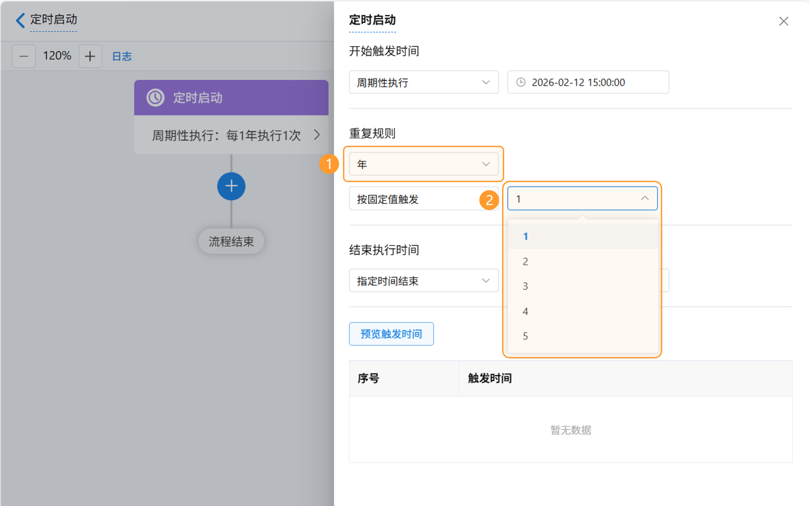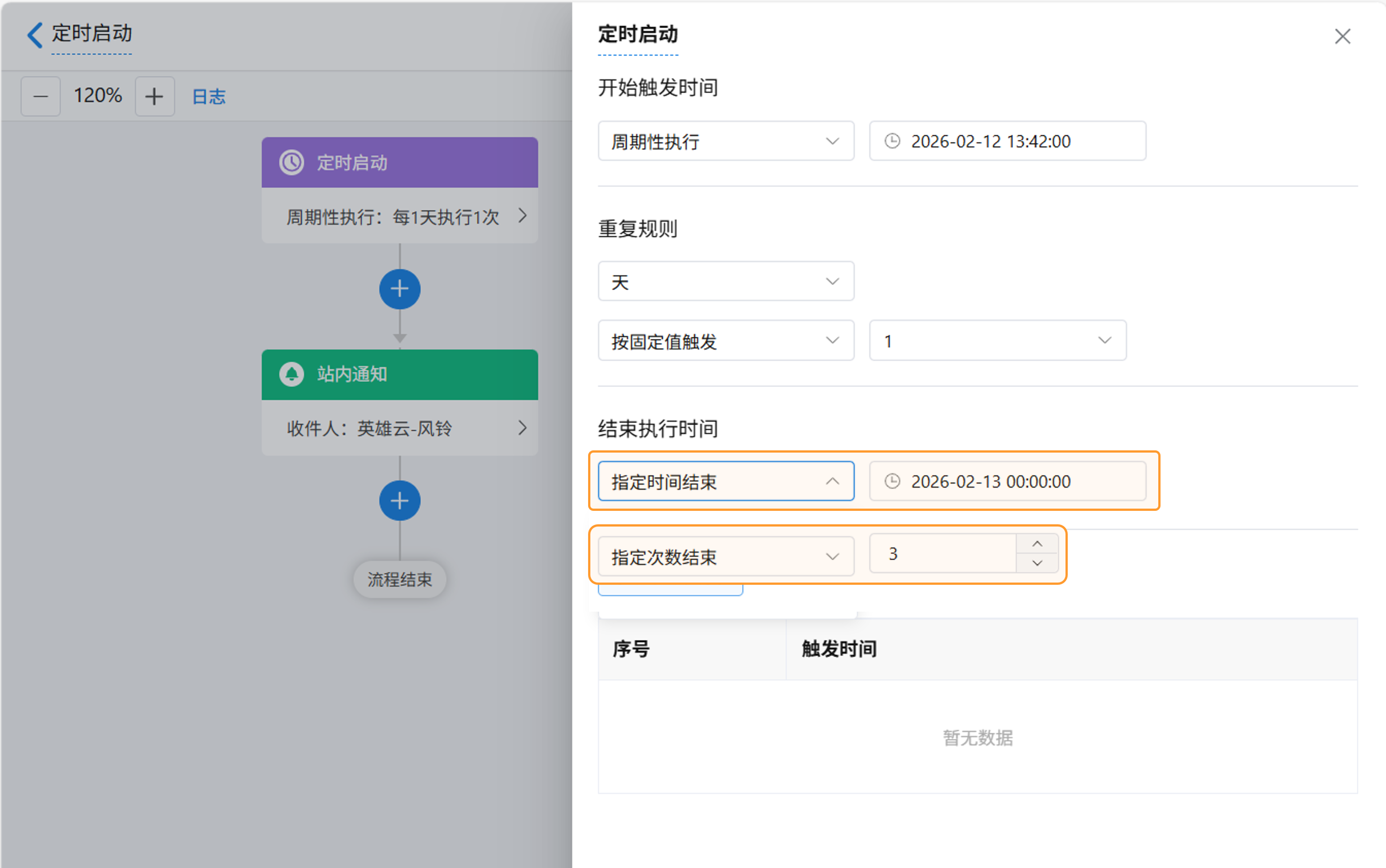 - 指定时间结束:设置具体结束时间,到期后工作流将不再触发。