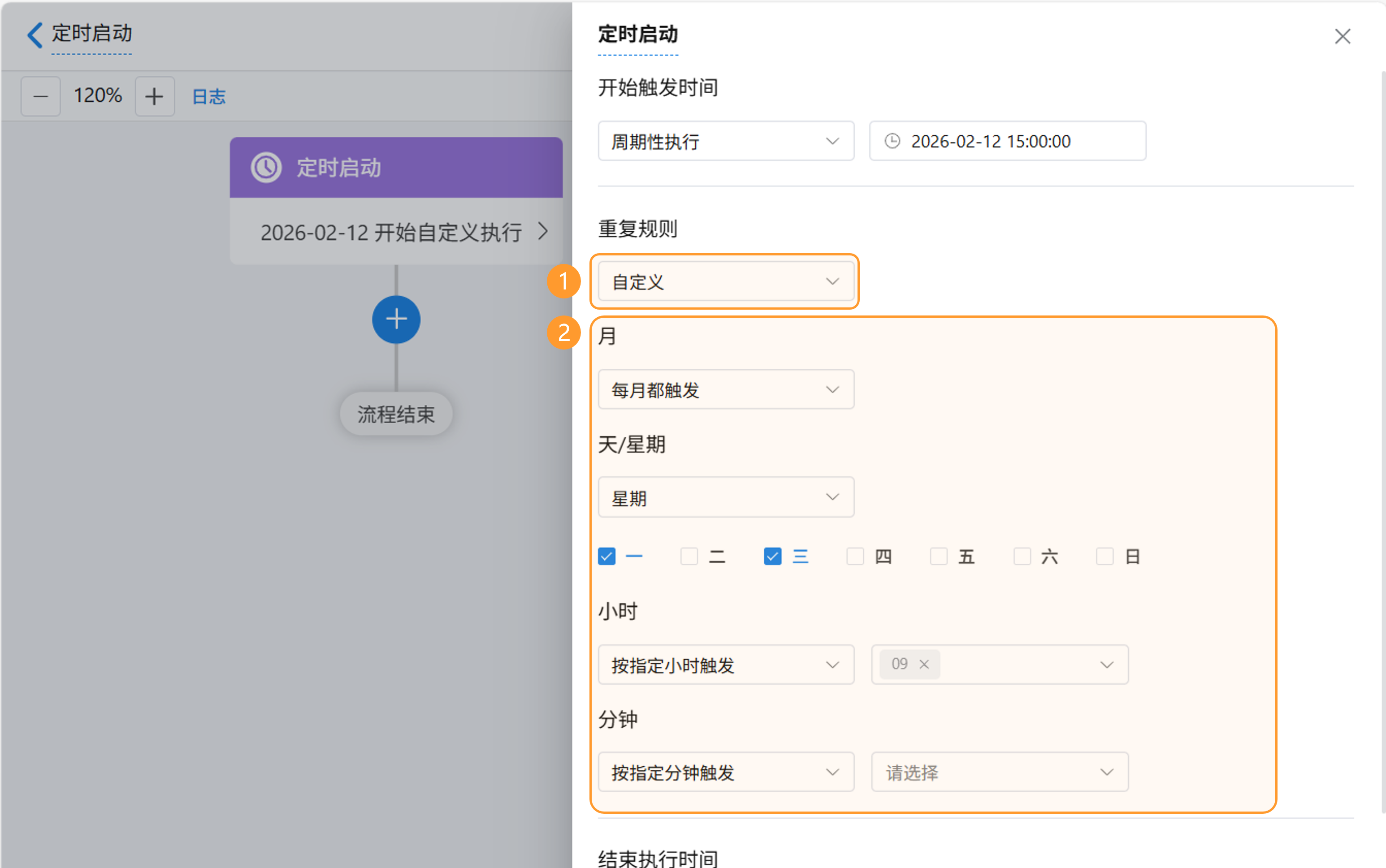 在重复规则中选择「自定义」。可以设定更复杂的重复规则,如下图示例设置为“每周一、周三上午9:00”触发当前工作流。