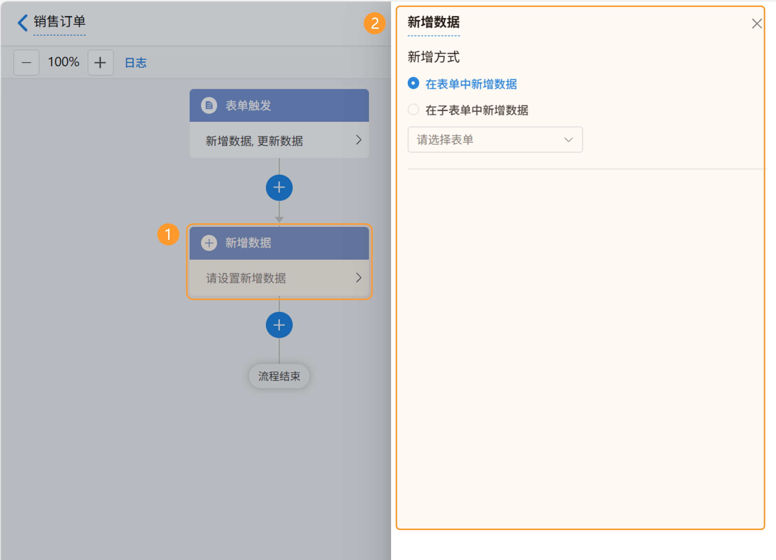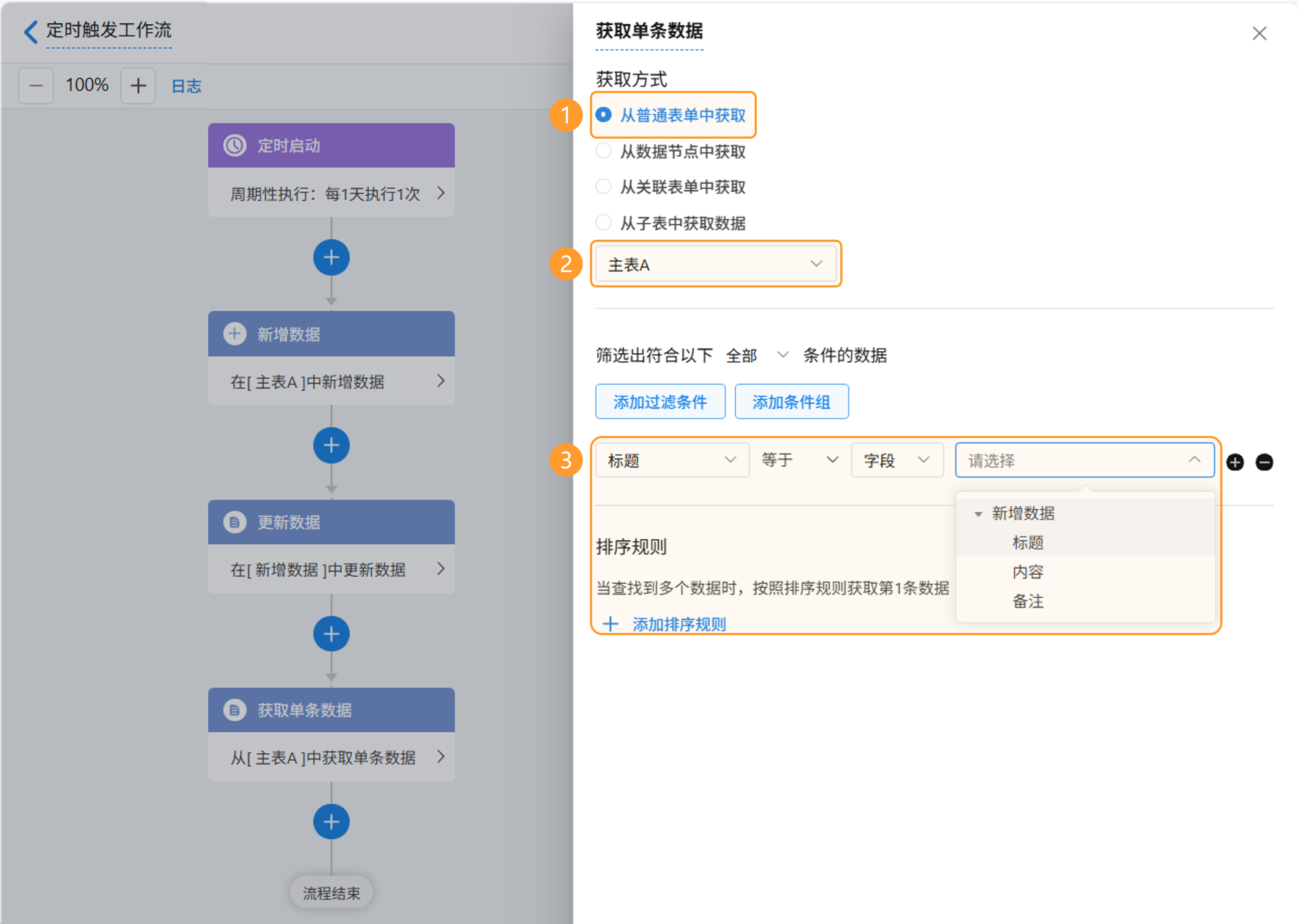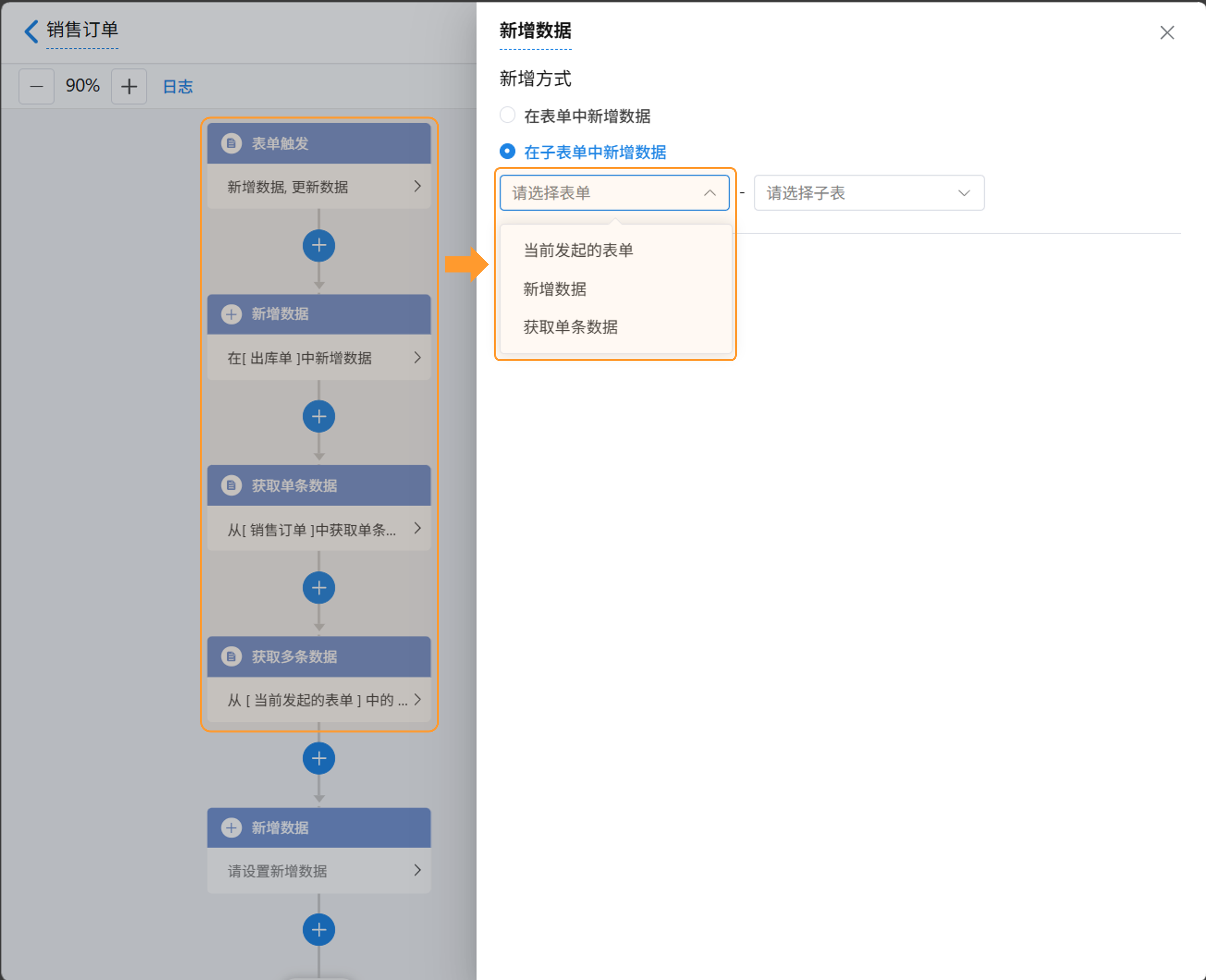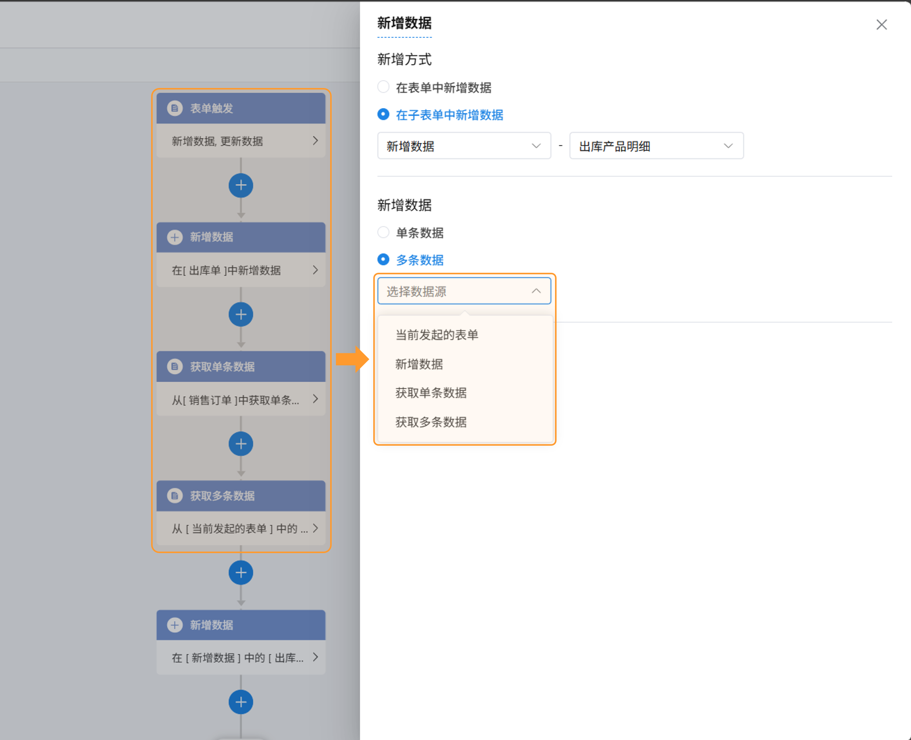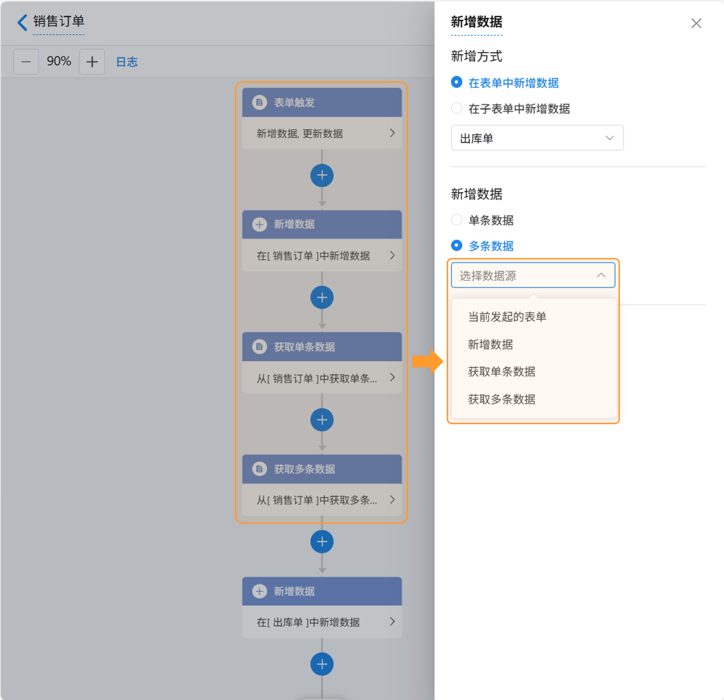 - 支持选择的节点数据源有「当前发起的表单」、「新增数据」、「获取单条数据」、「获取多条数据」。