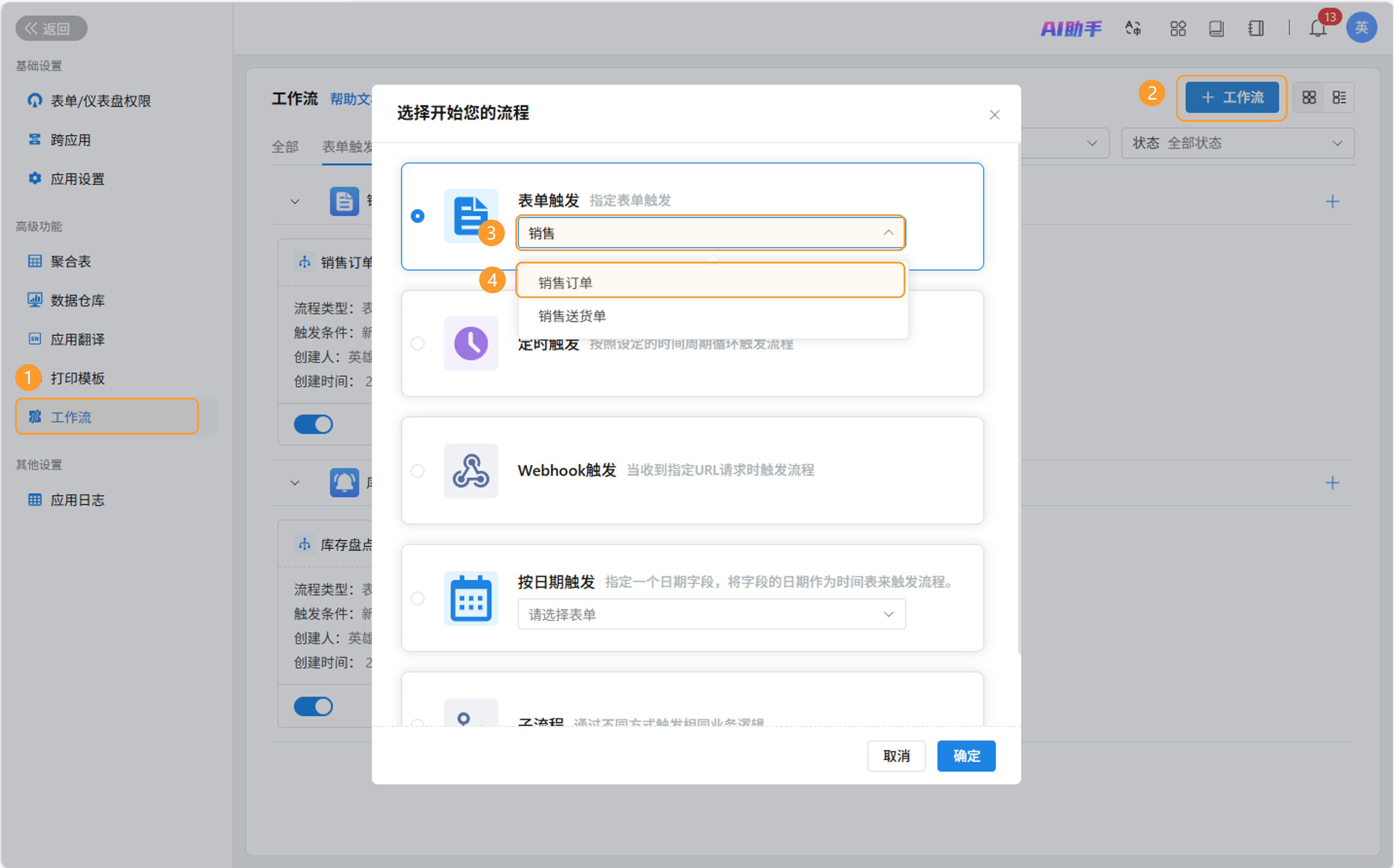 工作流中的新增数据节点支持在表单中新增单条或多条数据,既支持在主表内新增记录,也支持在子表中新增记录。
