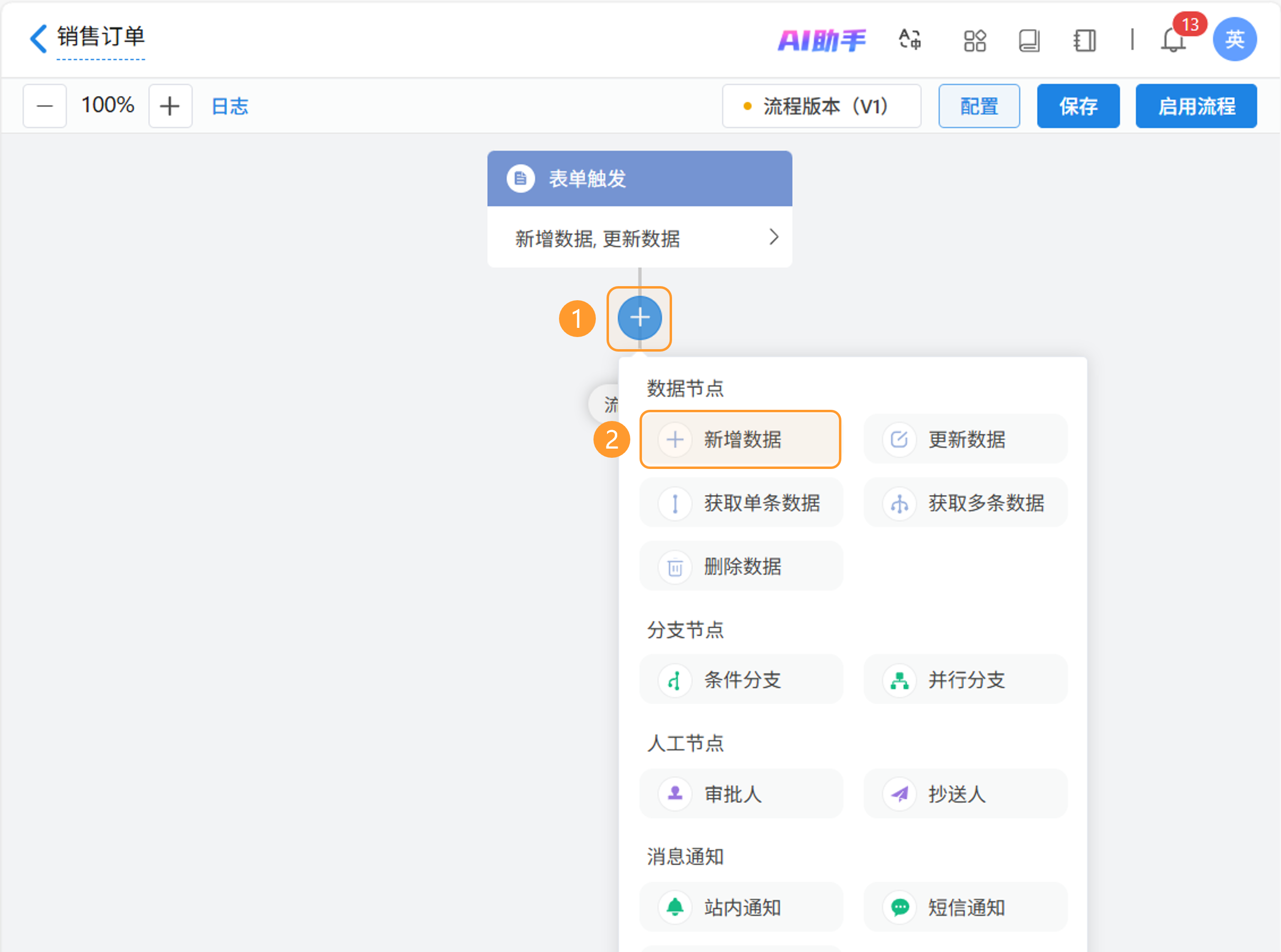 在工作流编辑页面中点击节点间「+」号新增节点,选择「新增数据」节点添加到当前工作流。