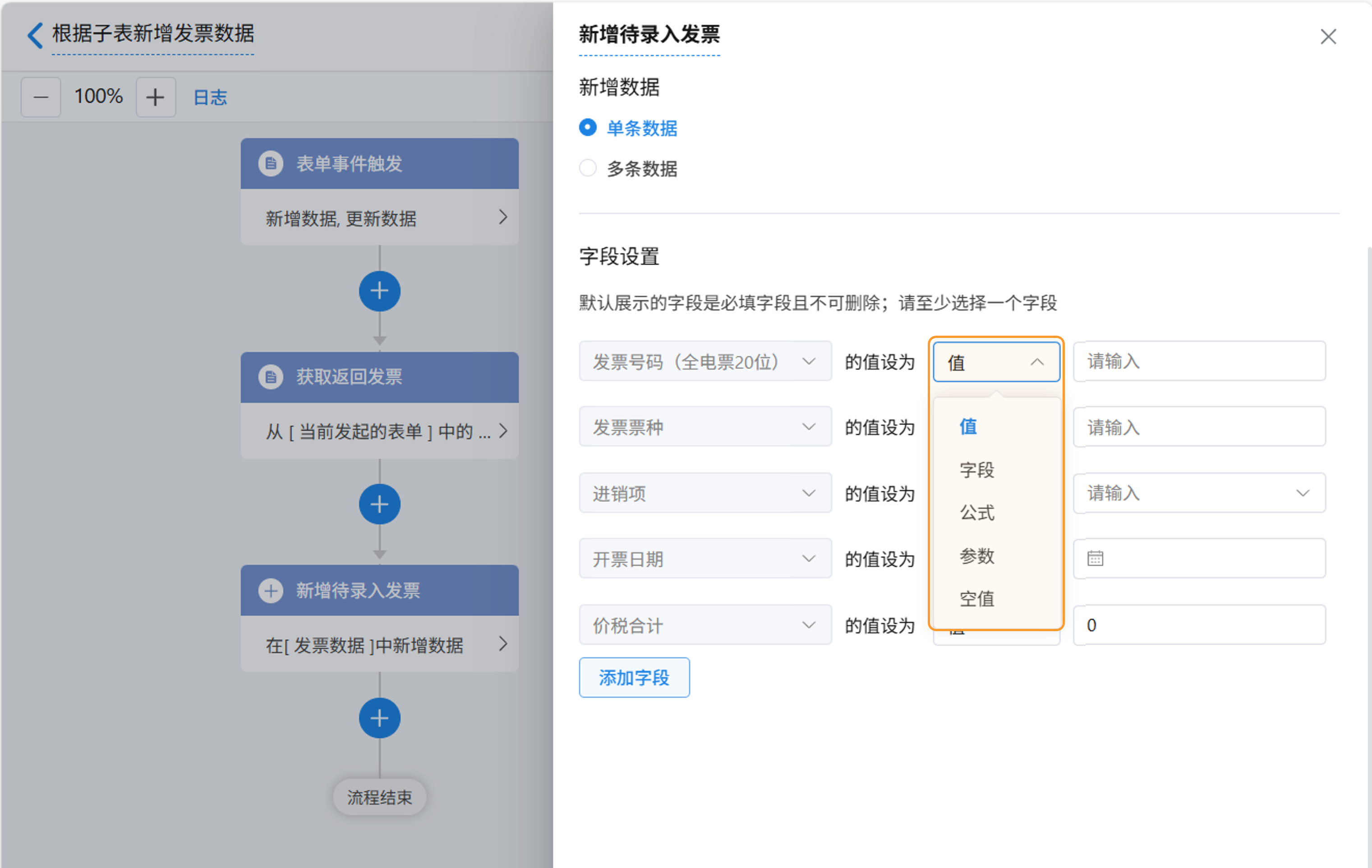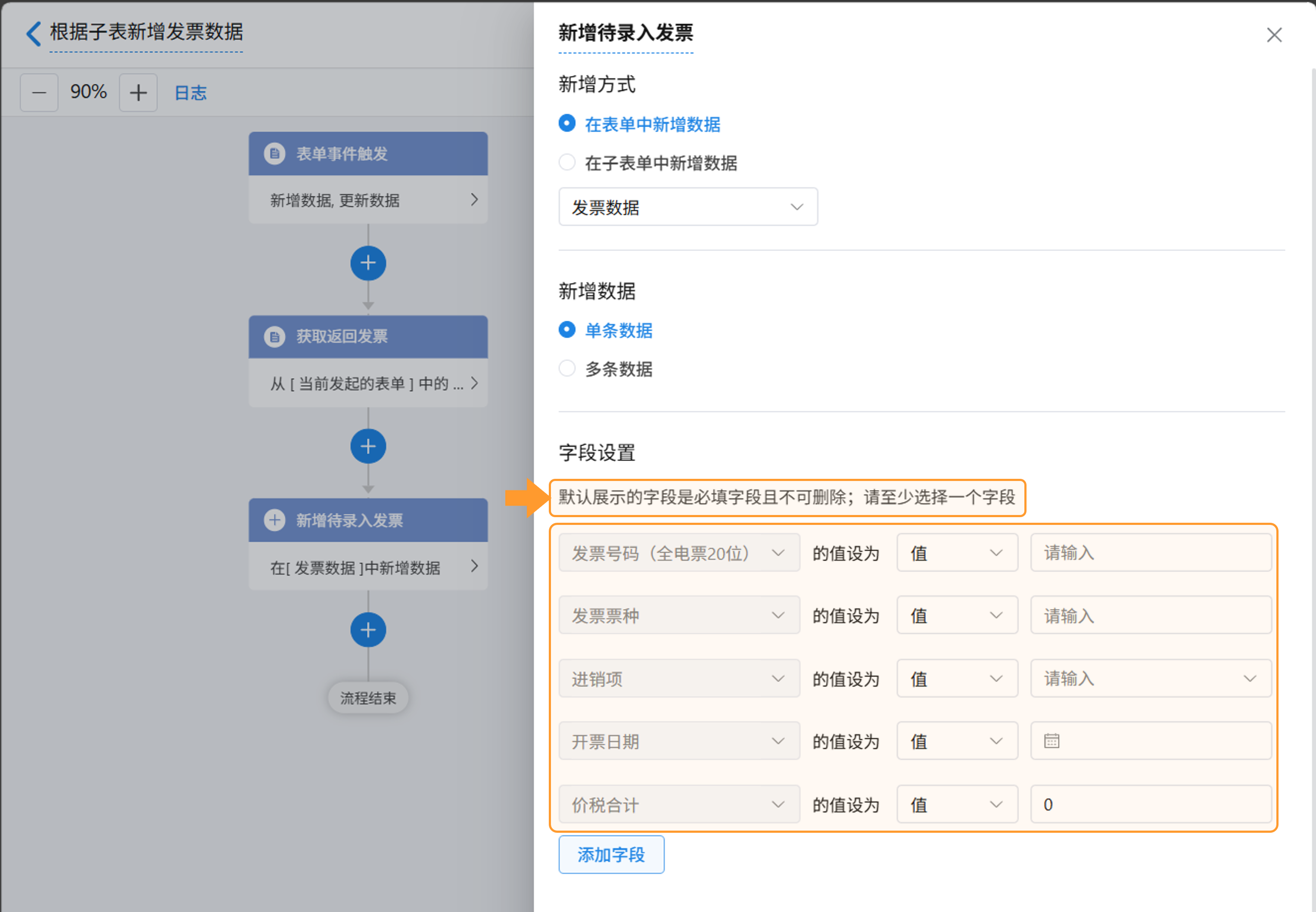 选好要添加的表单和数据后,您可以对新增记录的字段进行设置。