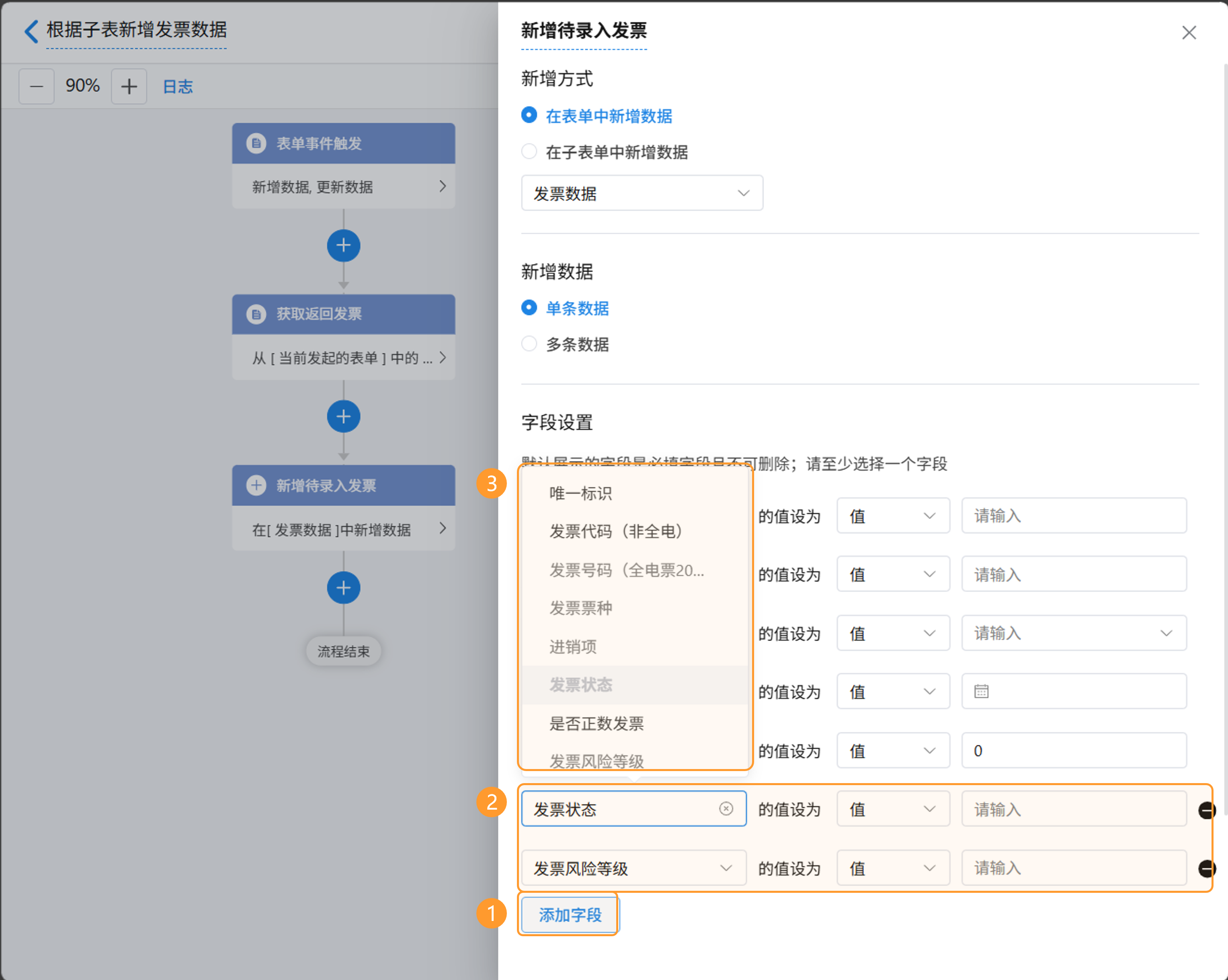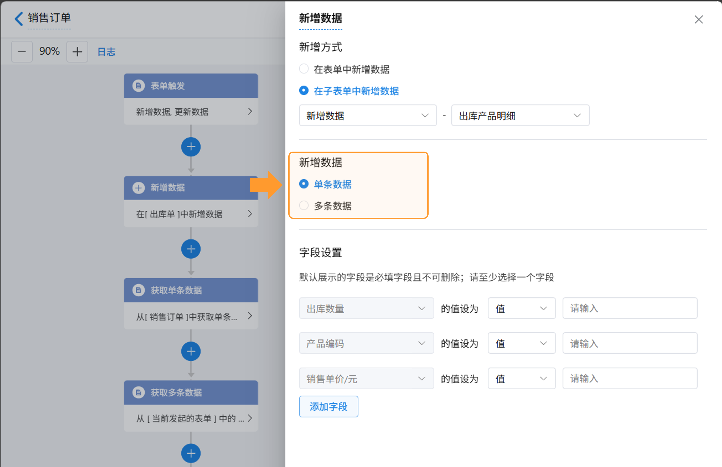 - 选择新增多条数据时,只能选择2.4.3节中选择数据源节点中的同类型表单字段。