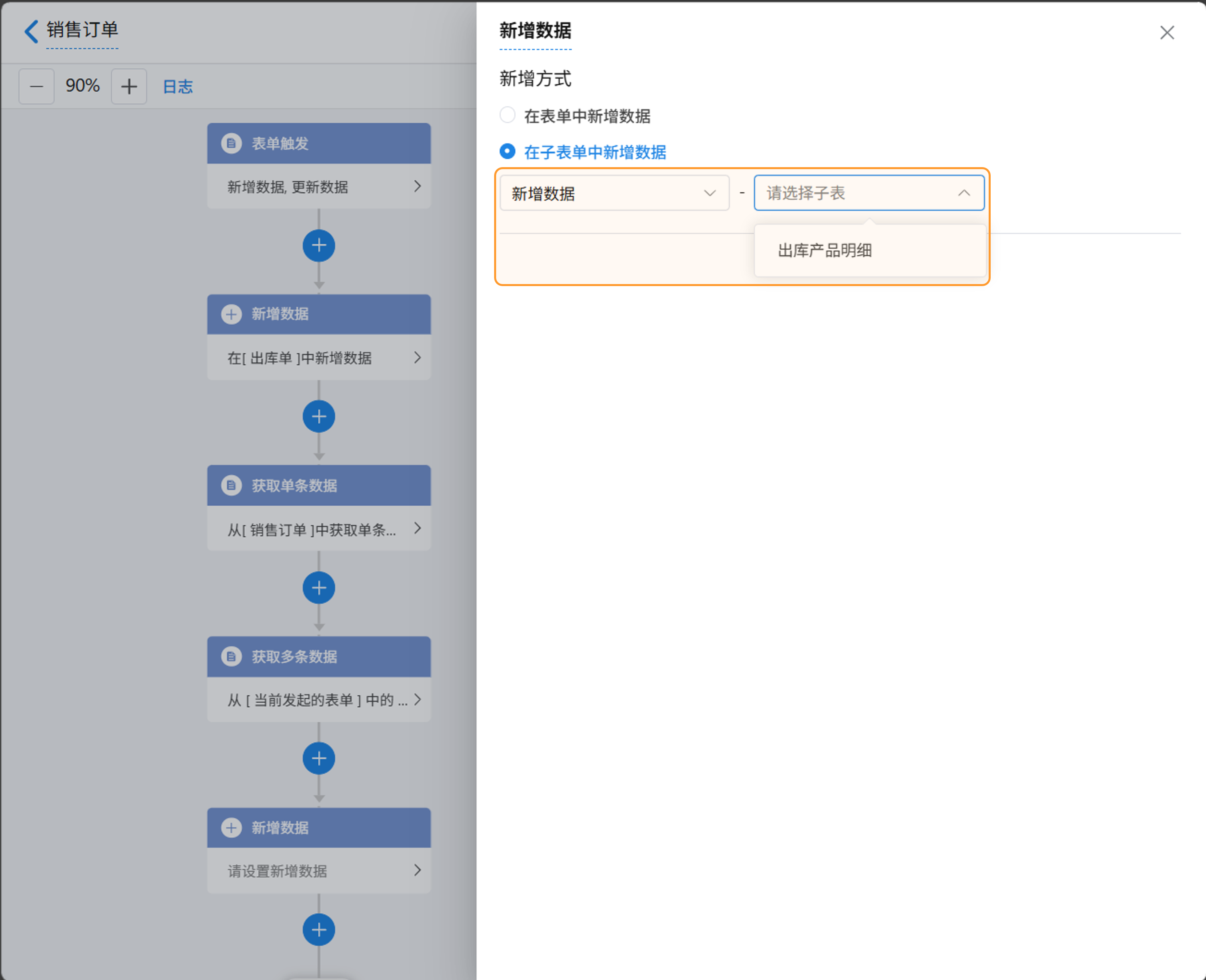 在新增数据节点中选择「在子表单中新增数据」时,可以在指定记录的子表内新增记录。