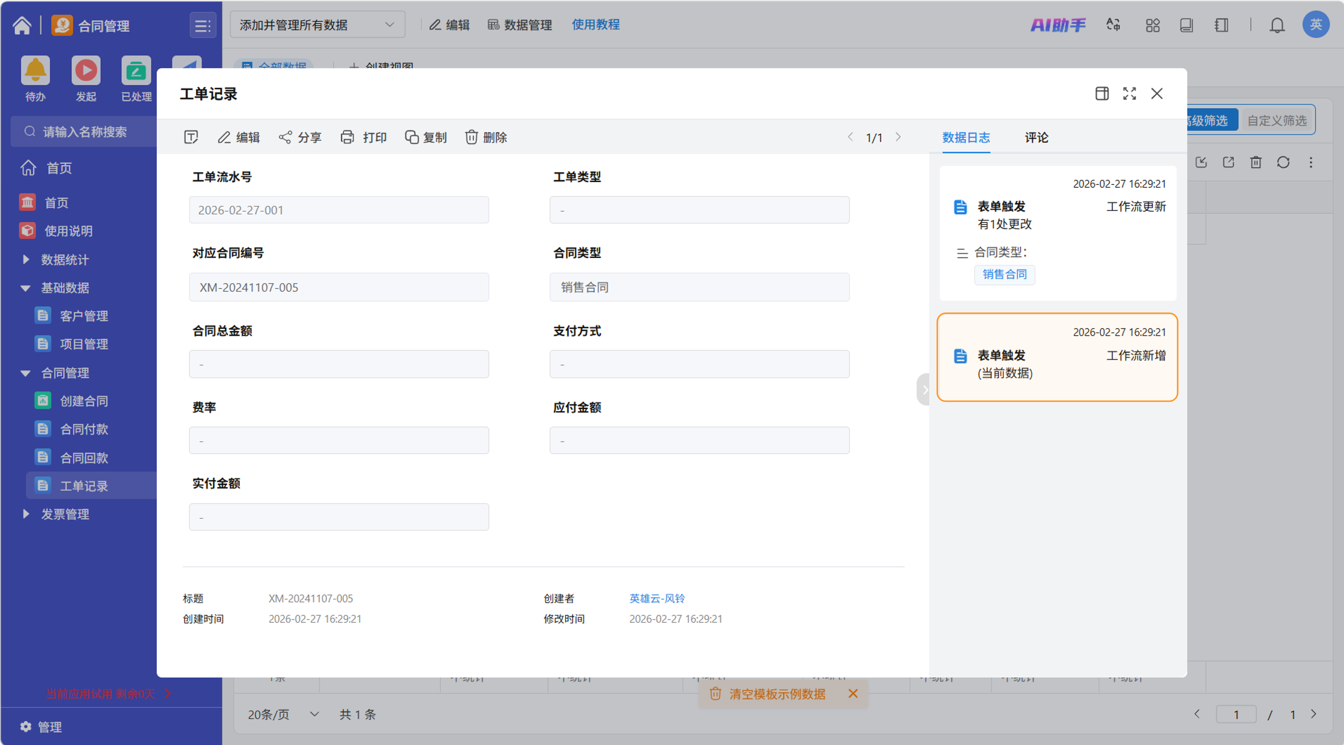 工作流保存启用后,当工作流触发并符合执行条件时,执行到新增数据节点时,会自动在对应表单中新增记录。如图,在记录的数据日志中可以看到,该记录是通过工作流新增的。