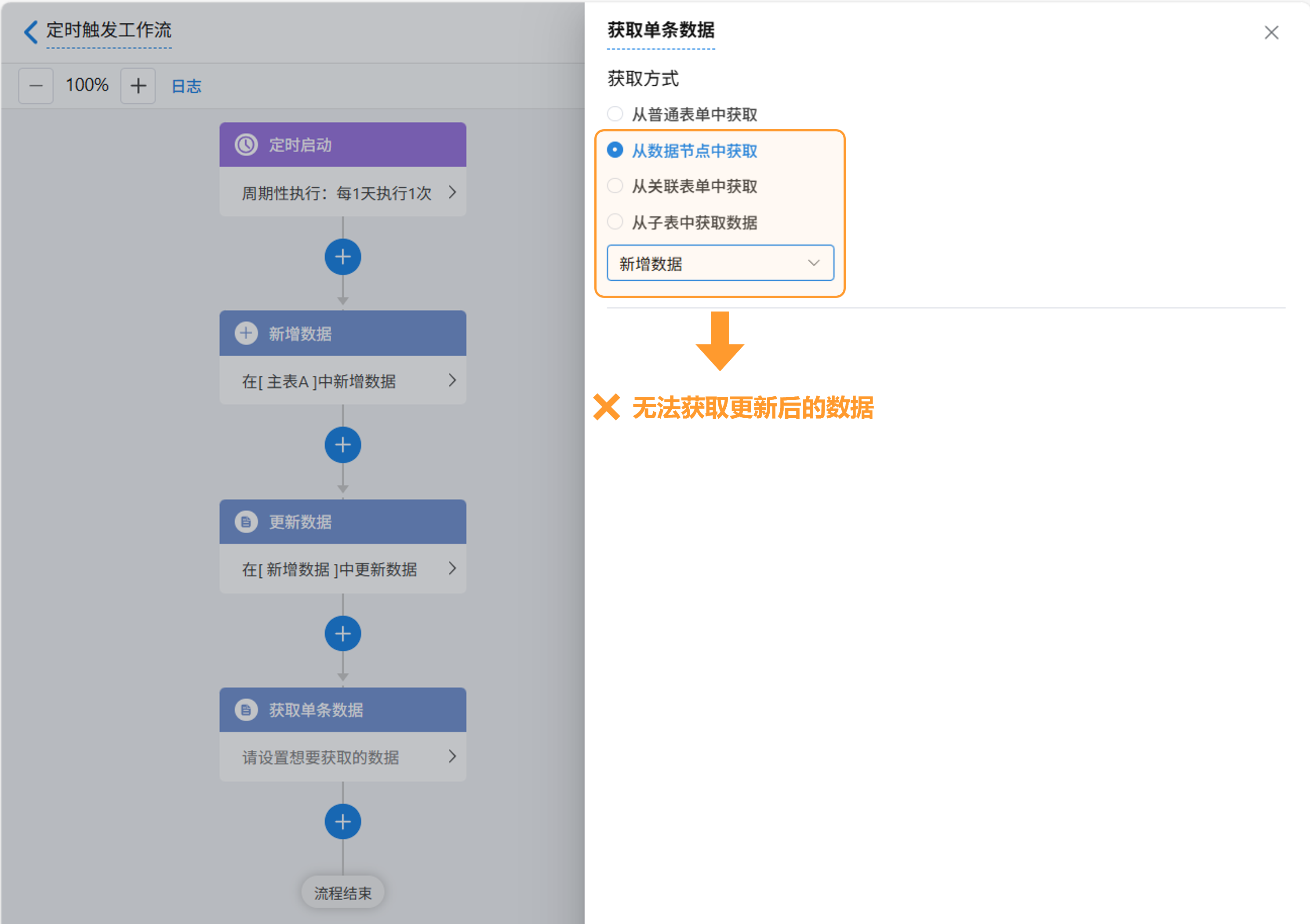 隐藏当新增节点的数据发生了改变或执行了更新操作时,后续节点需要时用获取数据节点从表单中获取该记录,才能确保获取的是最新的数据。