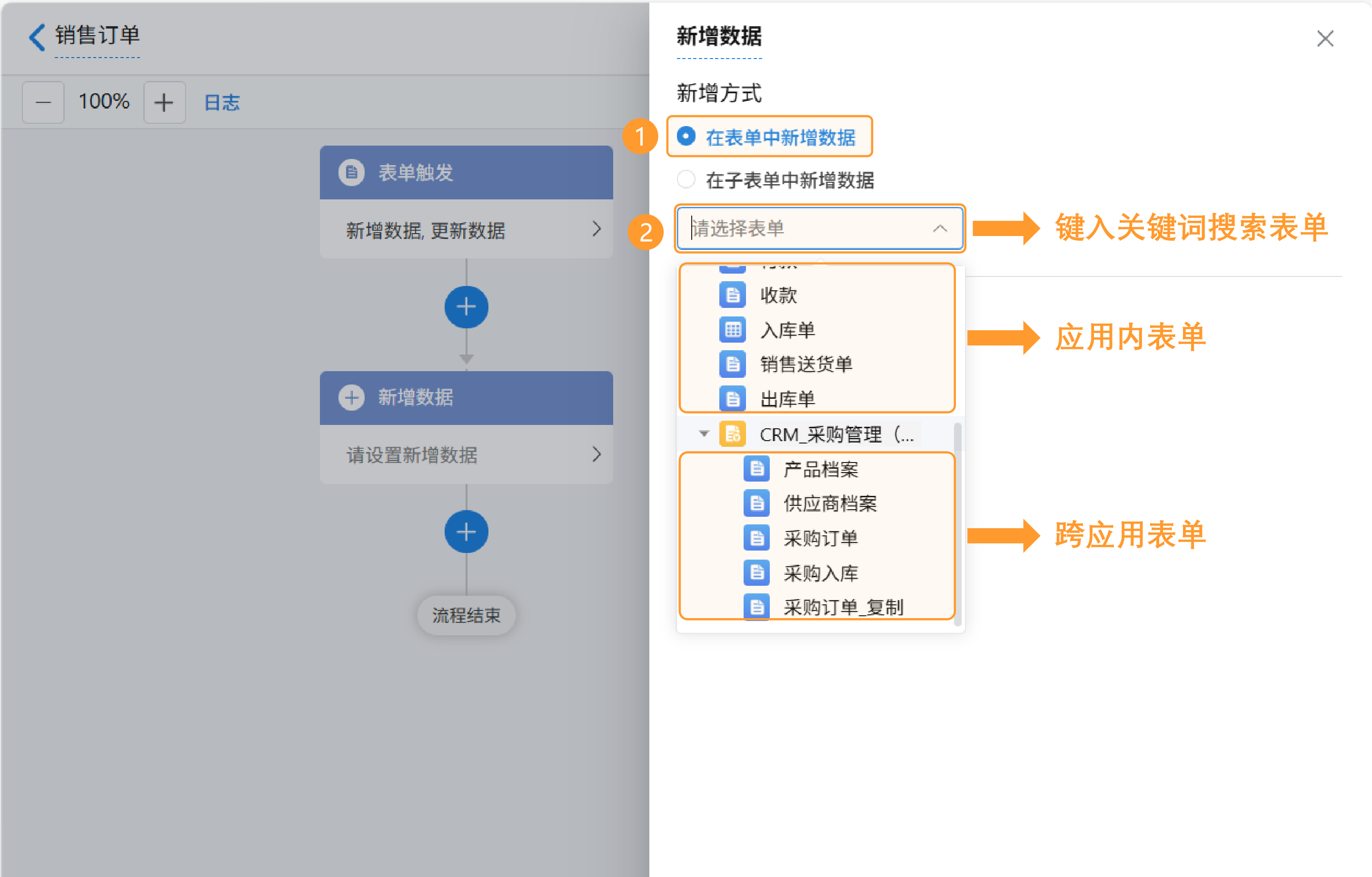 在新增数据节点中选择「在表单中新增数据」,点击下方下拉框,可以选择 应用内 及 跨应用 的表单,支持在输入框中输入关键词搜索相关表单。