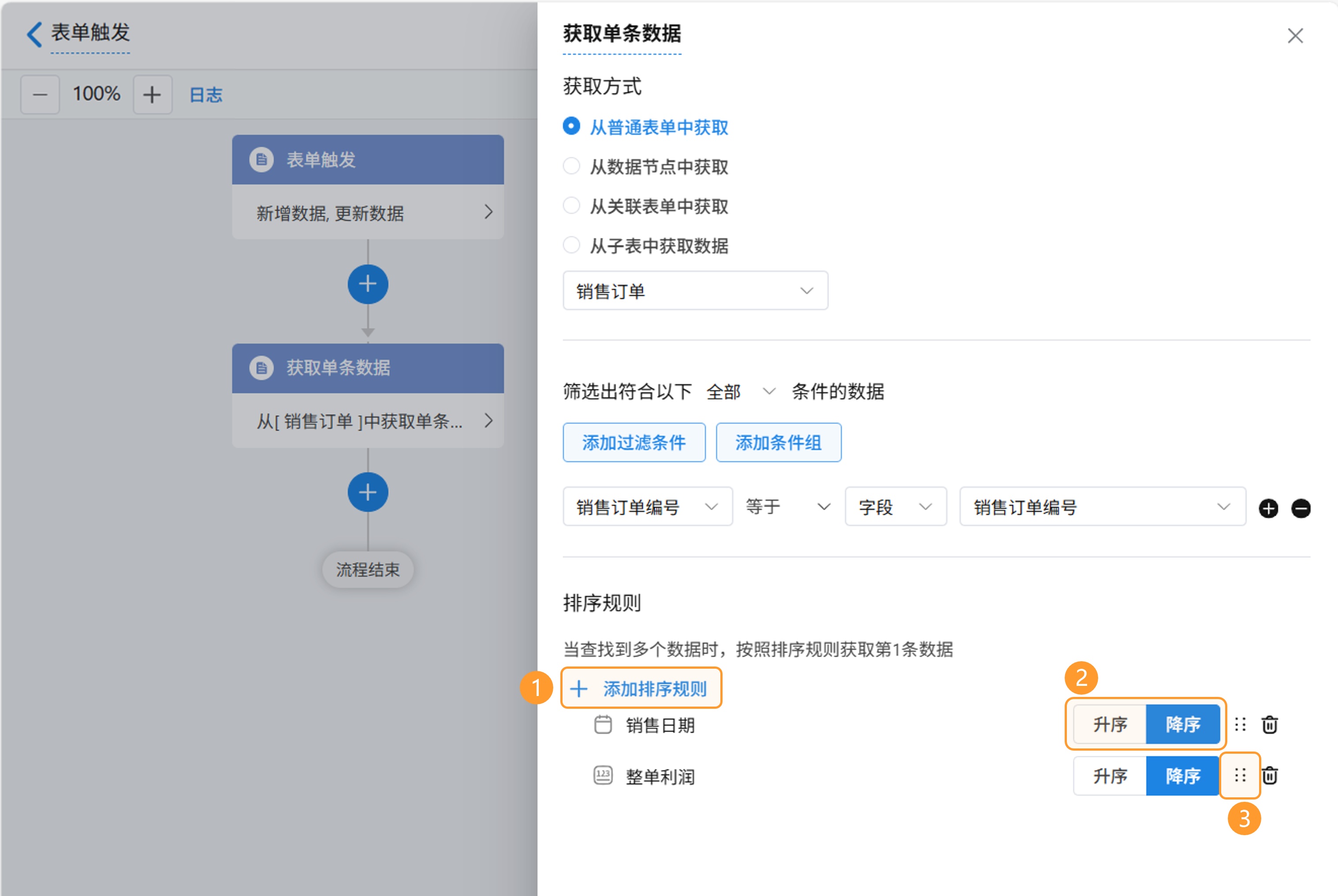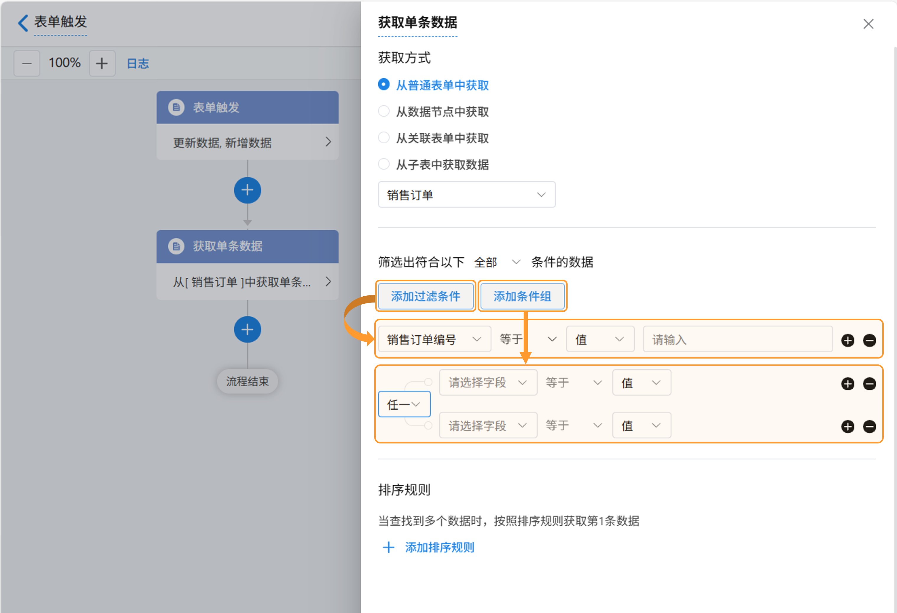 若设置筛选后仍有多条满足条件的记录,节点会按设置好的排序规则获取第一条数据。