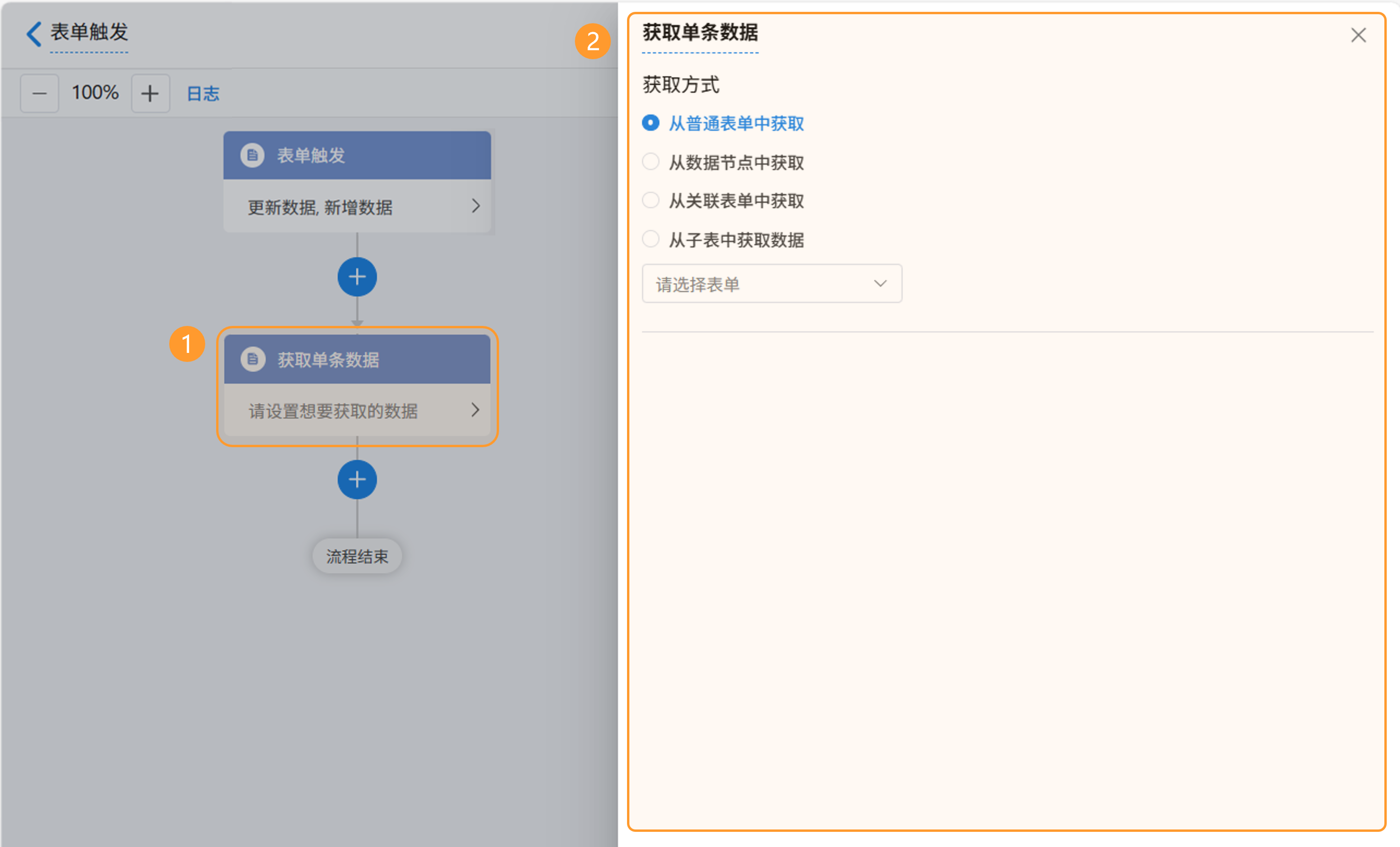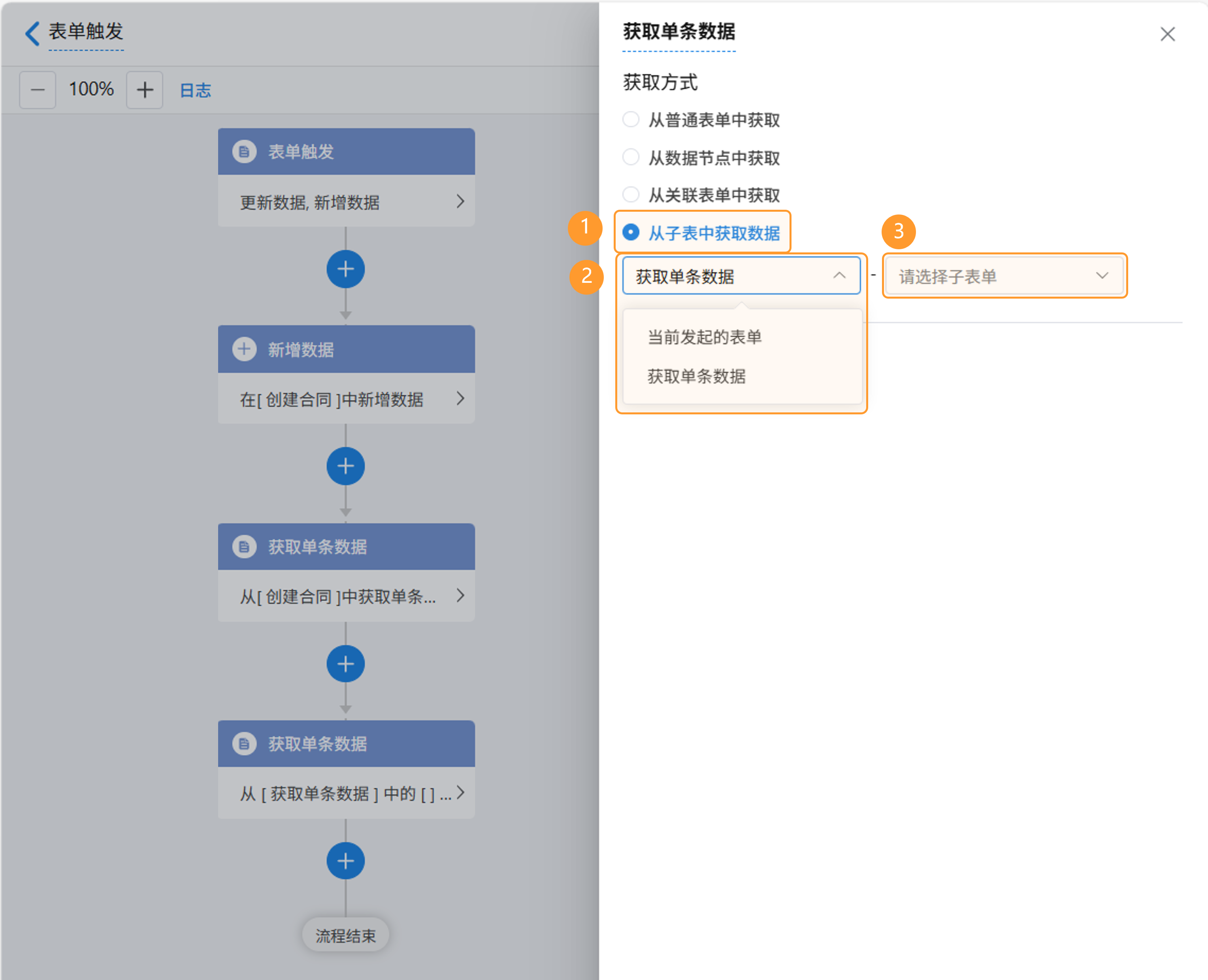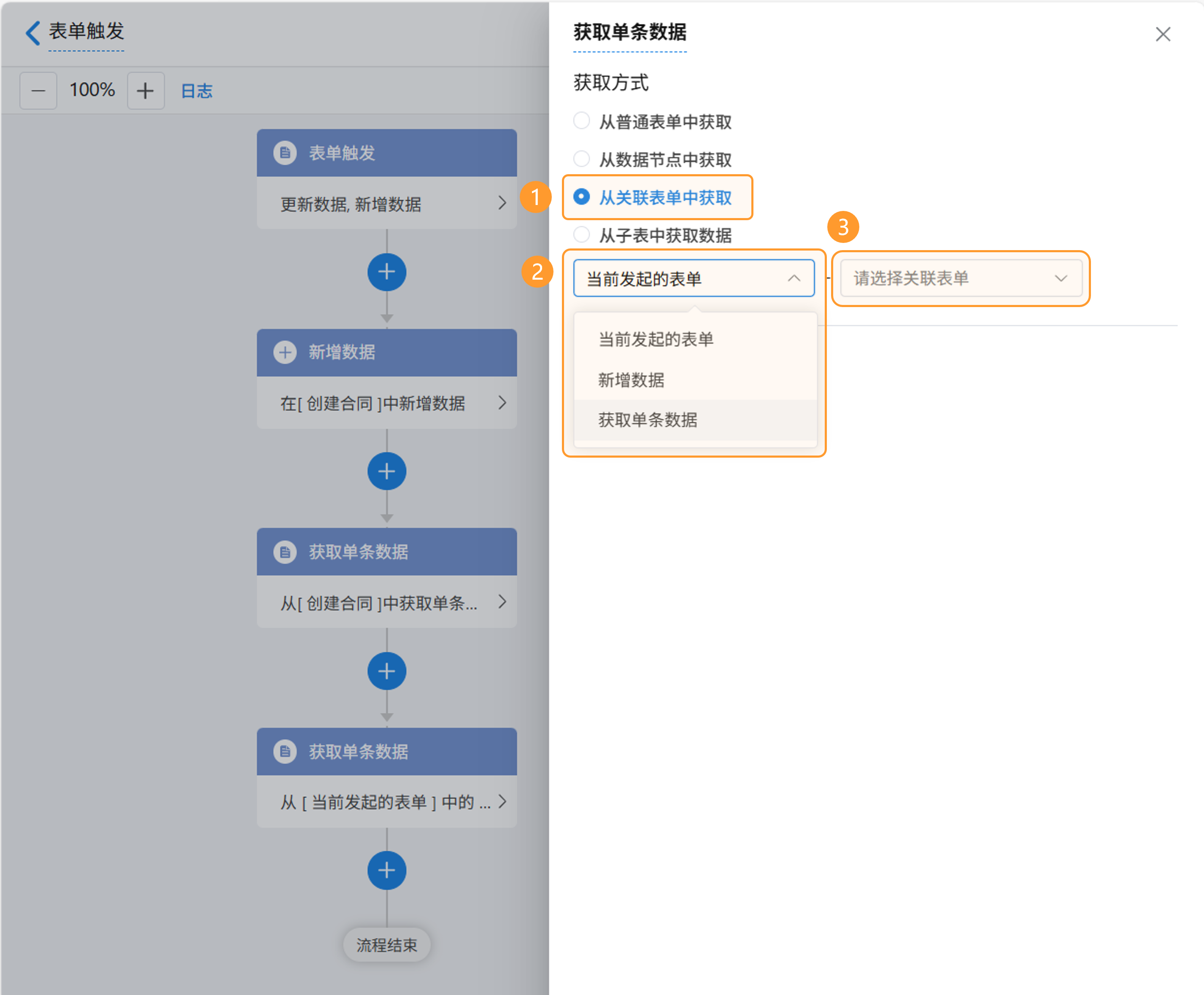 在获取单条数据节点中首先需要选择数据的获取方式,这决定数据的获取来源。可选方式有「从普通表单中获取」、「从数据节点中获取」、「从关联表单中获取」、「从子表中获取」。