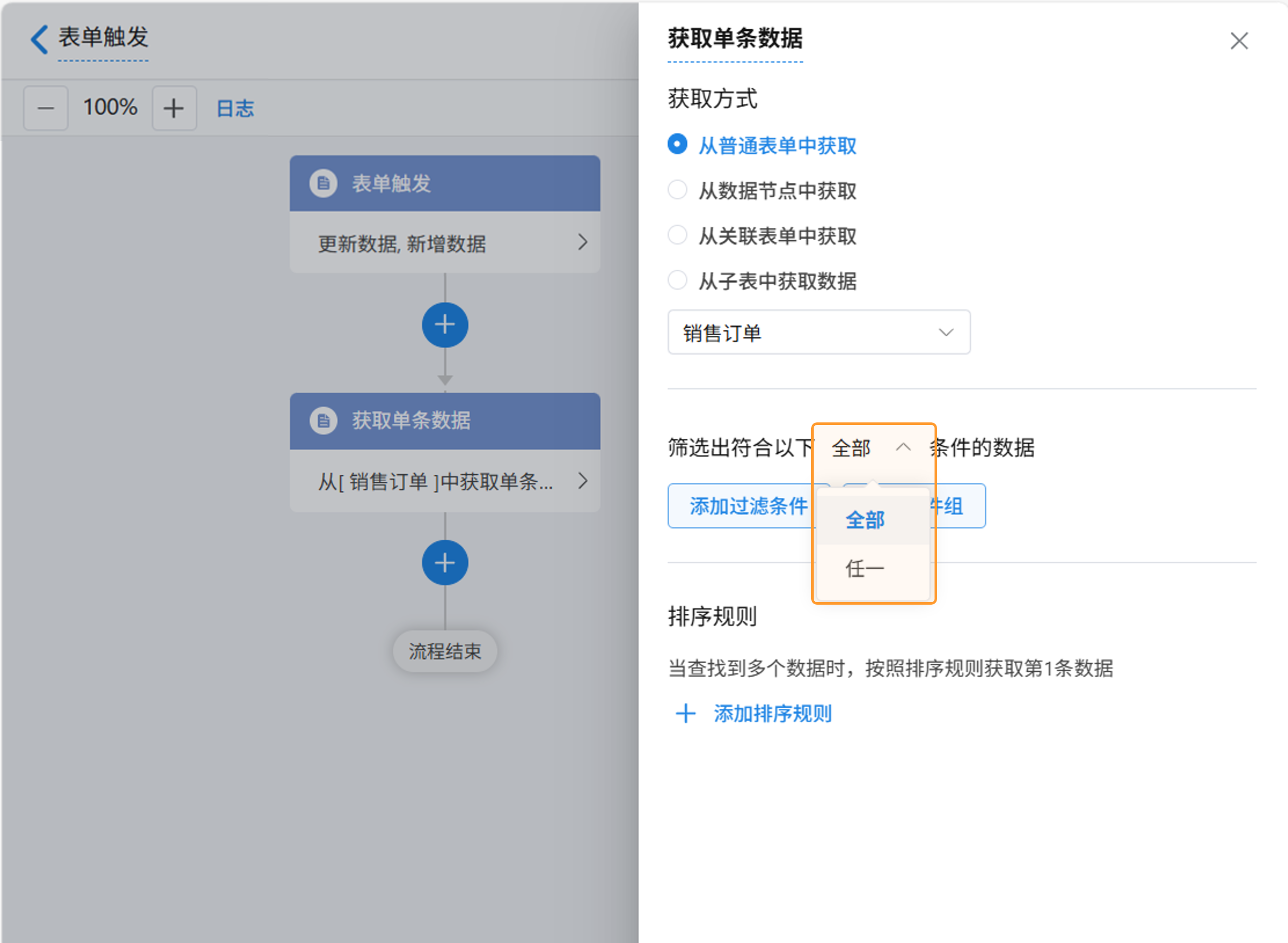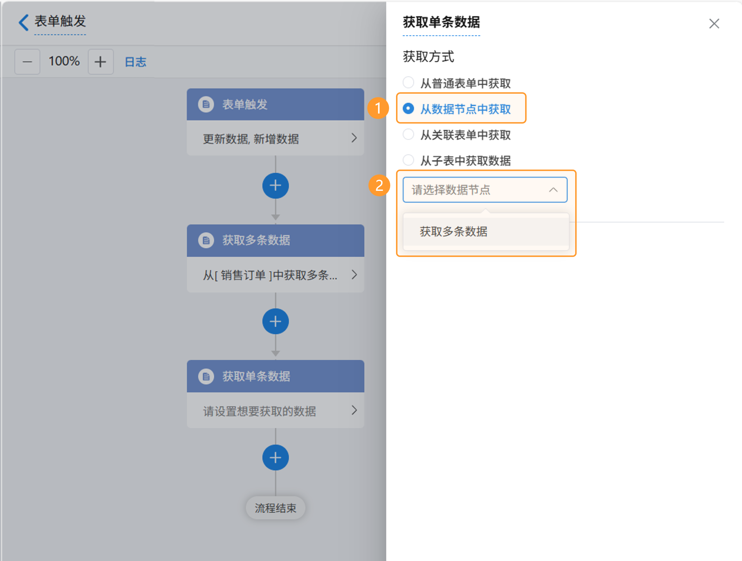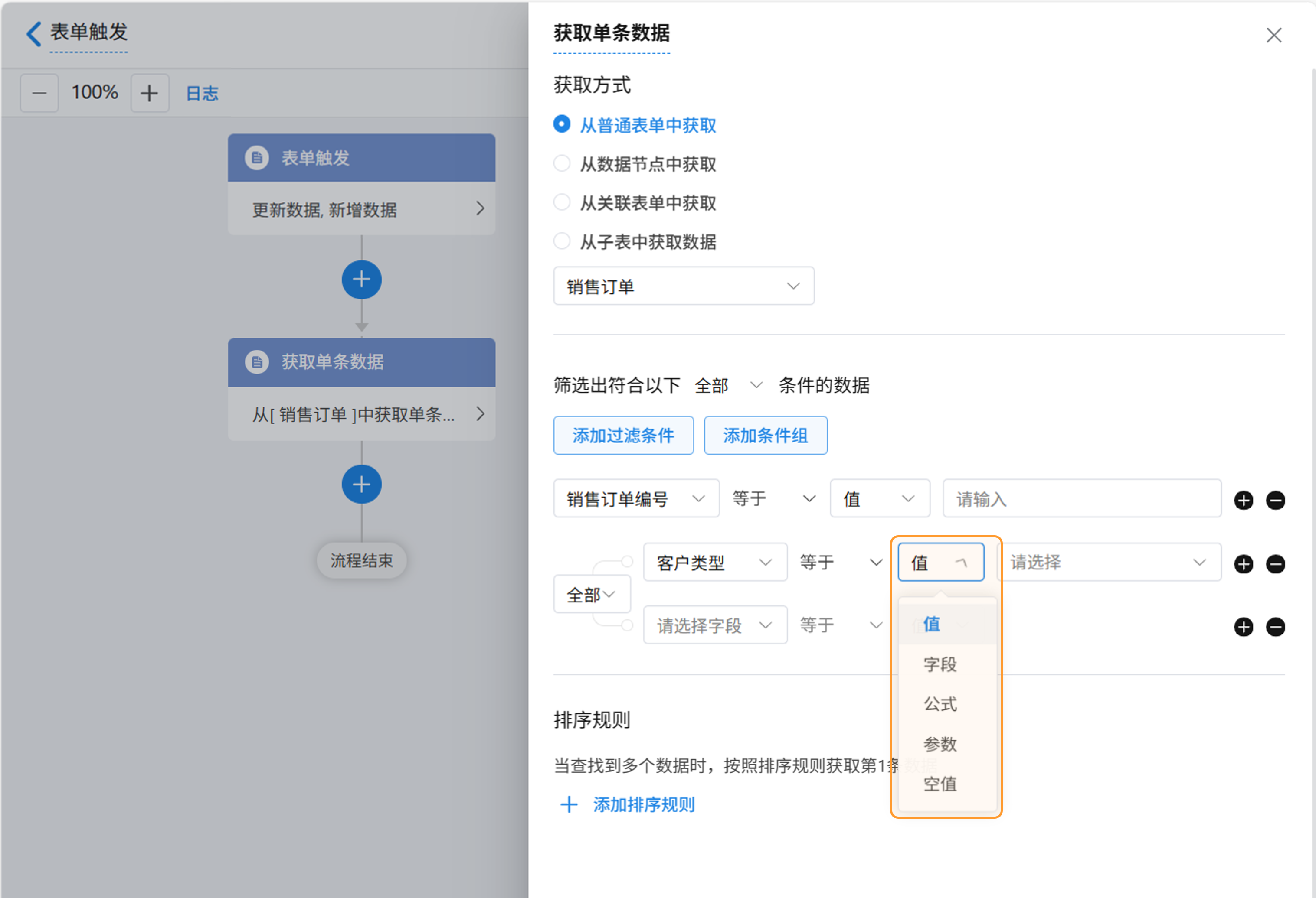 在获取单条数据节点中首先需要选择数据的获取方式,这决定数据的获取来源。可选方式有「从普通表单中获取」、「从数据节点中获取」、「从关联表单中获取」、「从子表中获取」。