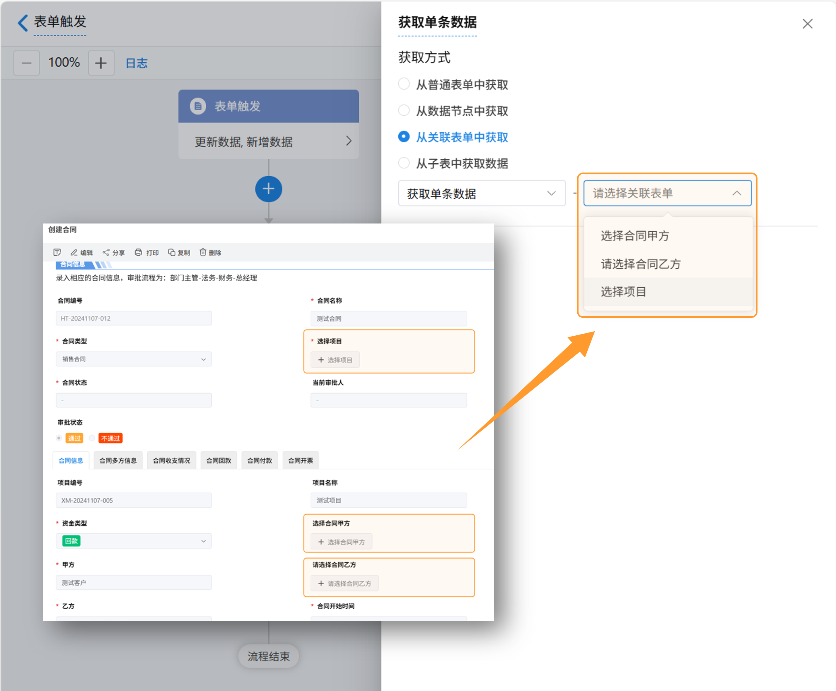 工作流中关联表单关系主要通过「选择数据」字段建立。因此,当选择“从关联表单中获取”时,实际是依靠表单中的「选择数据」字段,获取其指向的表单记录。具体设置如下: