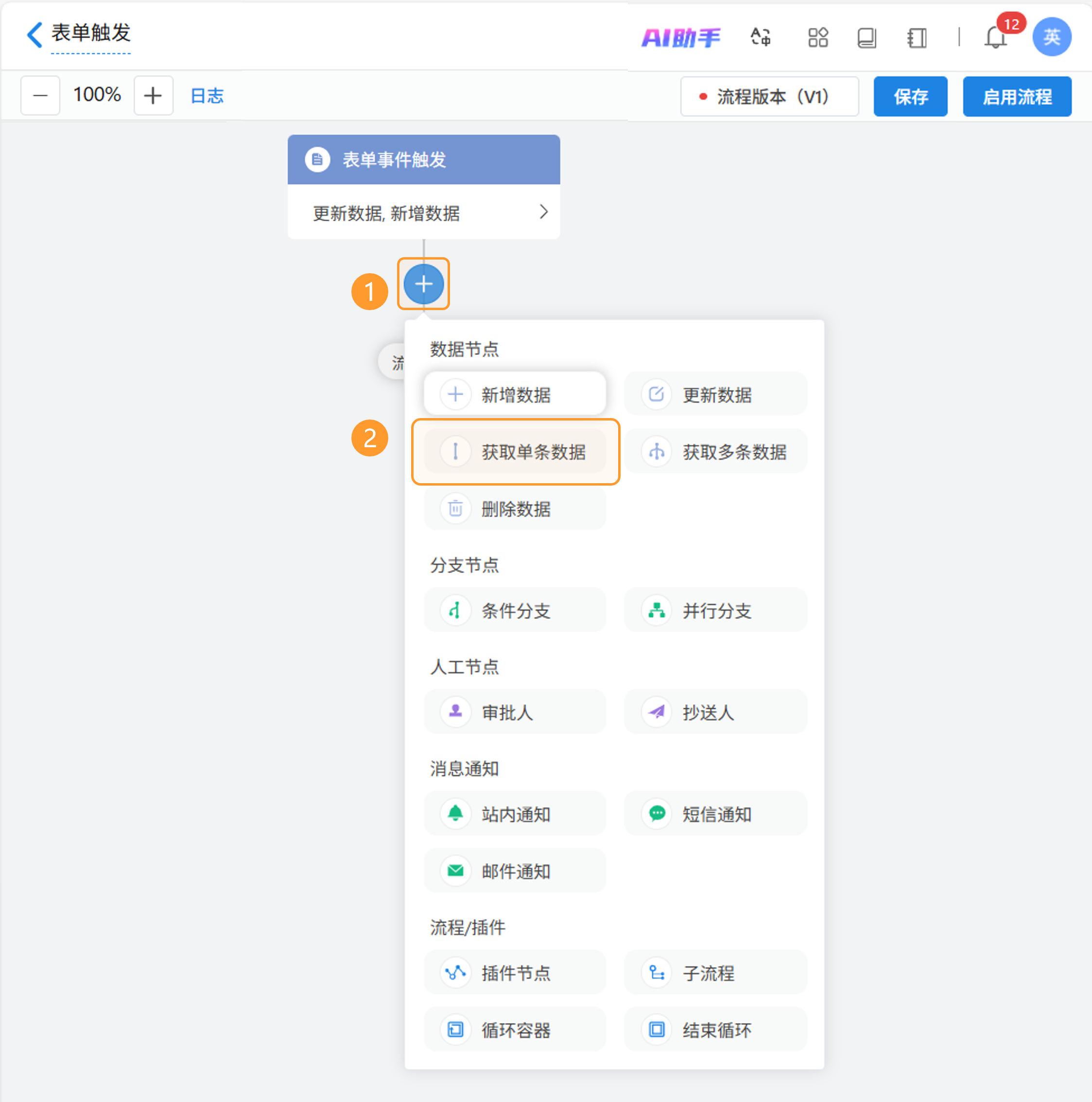 在工作流中点击节点间「+」号新增节点,选择「获取单条数据」节点添加到当前工作流。