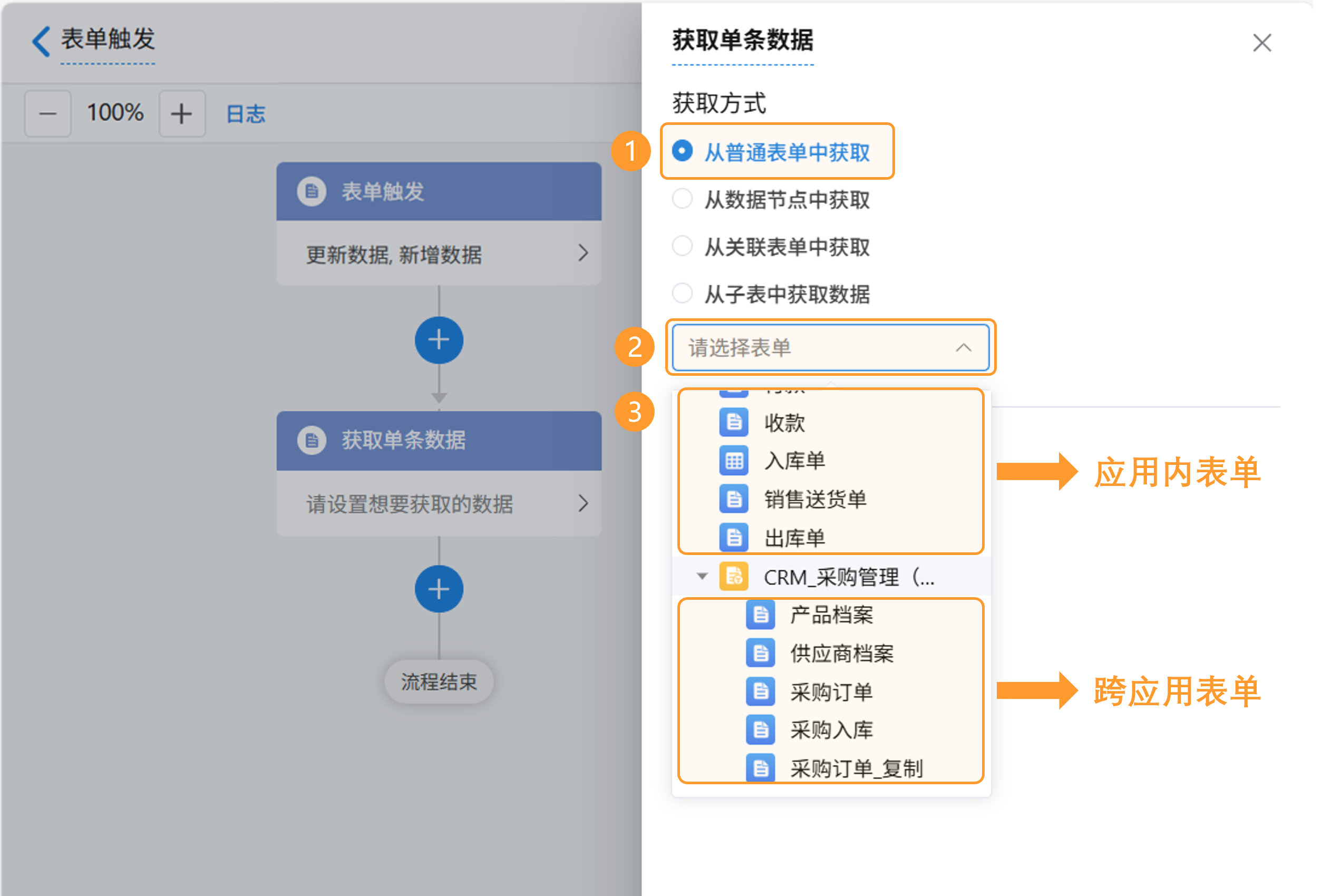 当选择「从普通表单中获取」时,点击下方下拉框,可以浏览 应用内 及 跨应用 的表单,支持在文本框中输入关键词搜索表单。