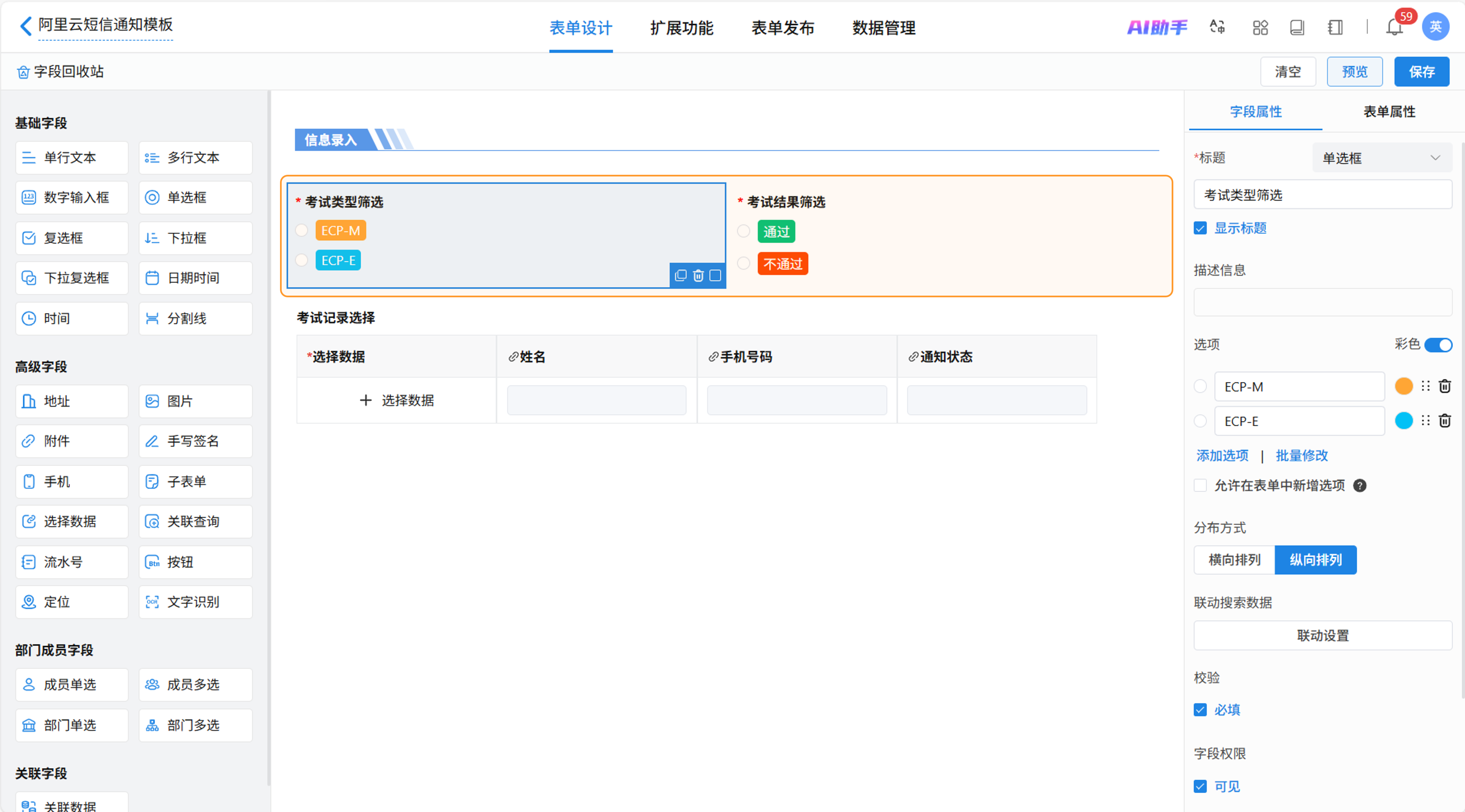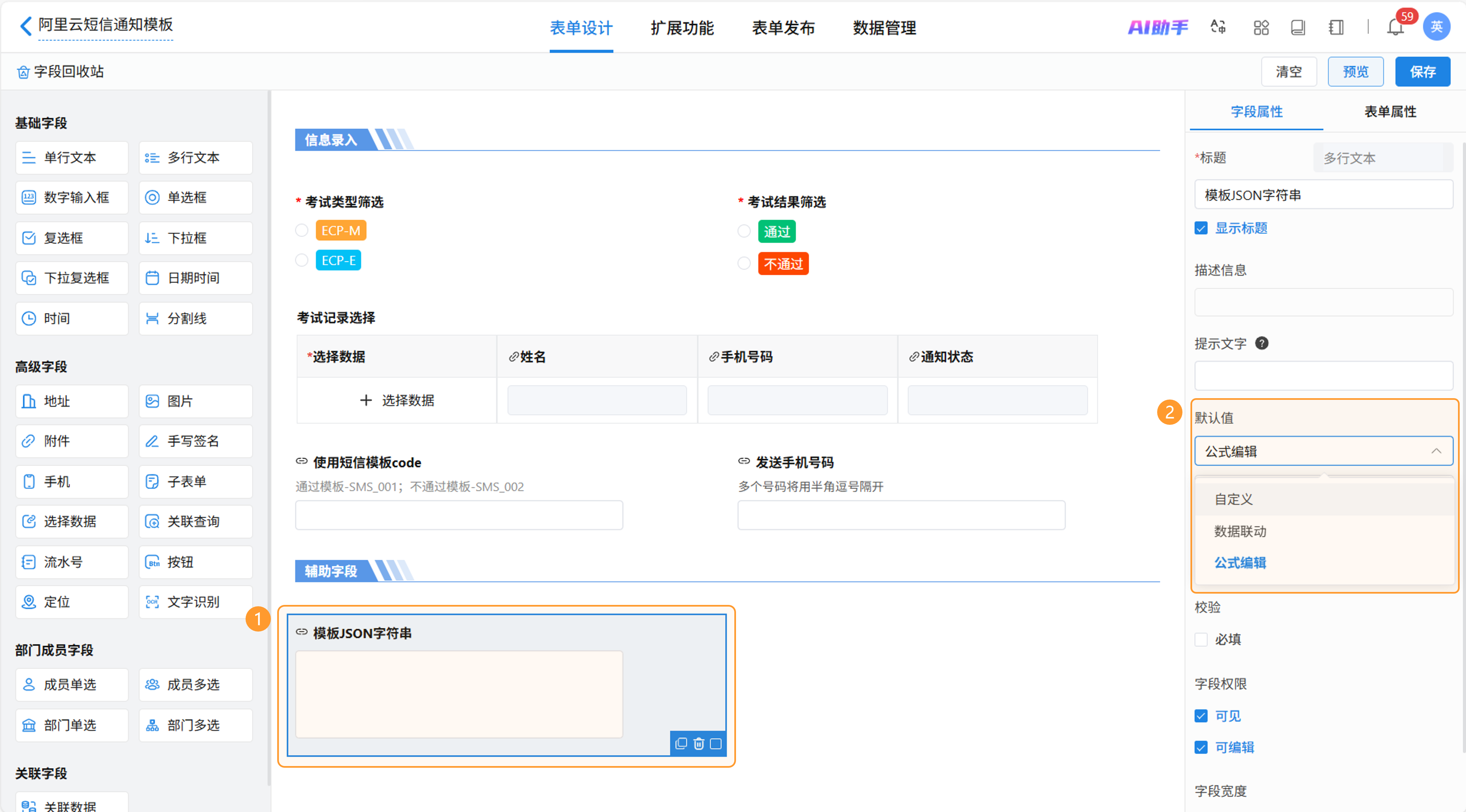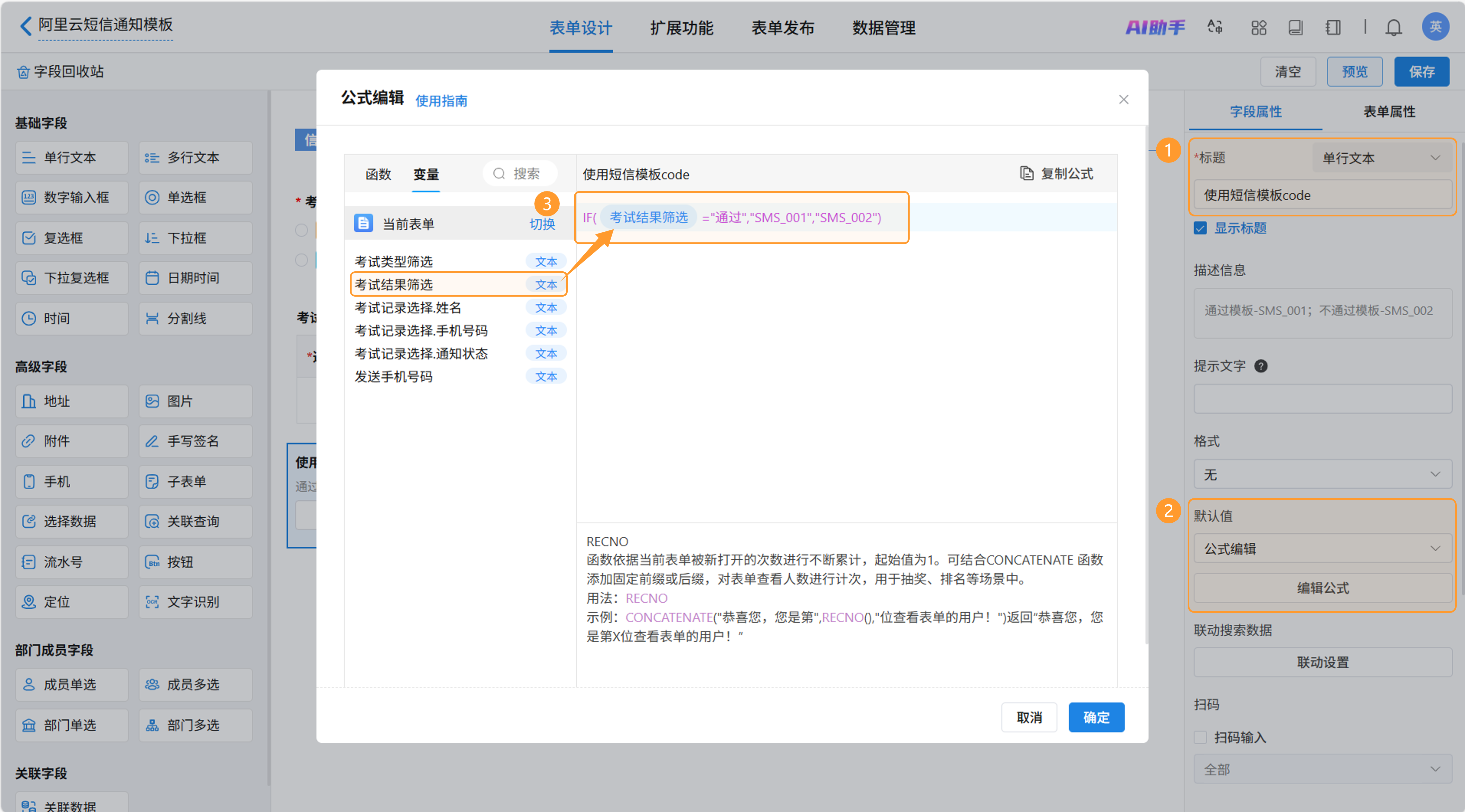 此处我们使用单行文本,并设置条件公式:IF( 考试结果筛选 =“通过",“SMS_001","SMS_002"),使得当考试结果筛选为通过时使用通过模板,否则使用不通过模板。