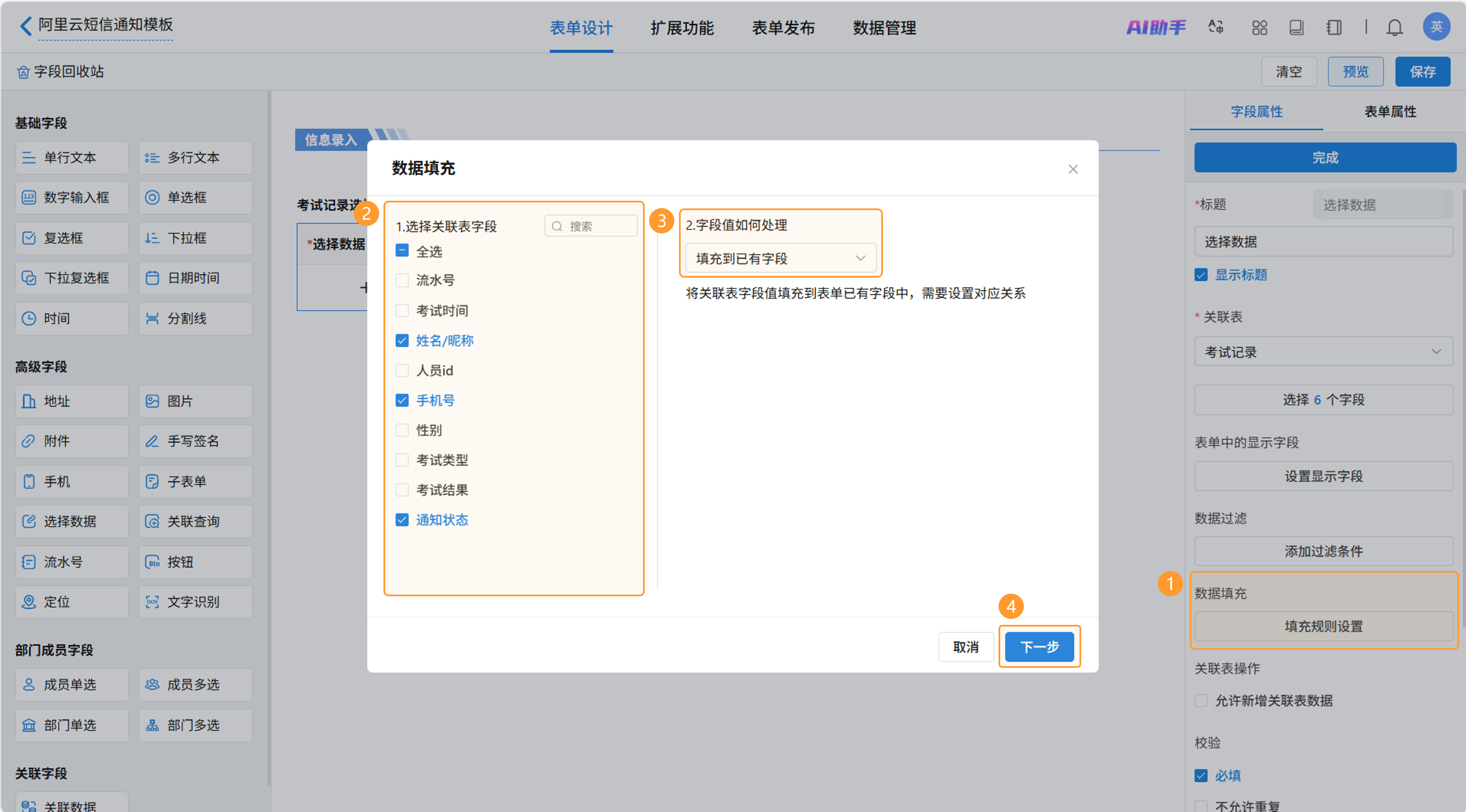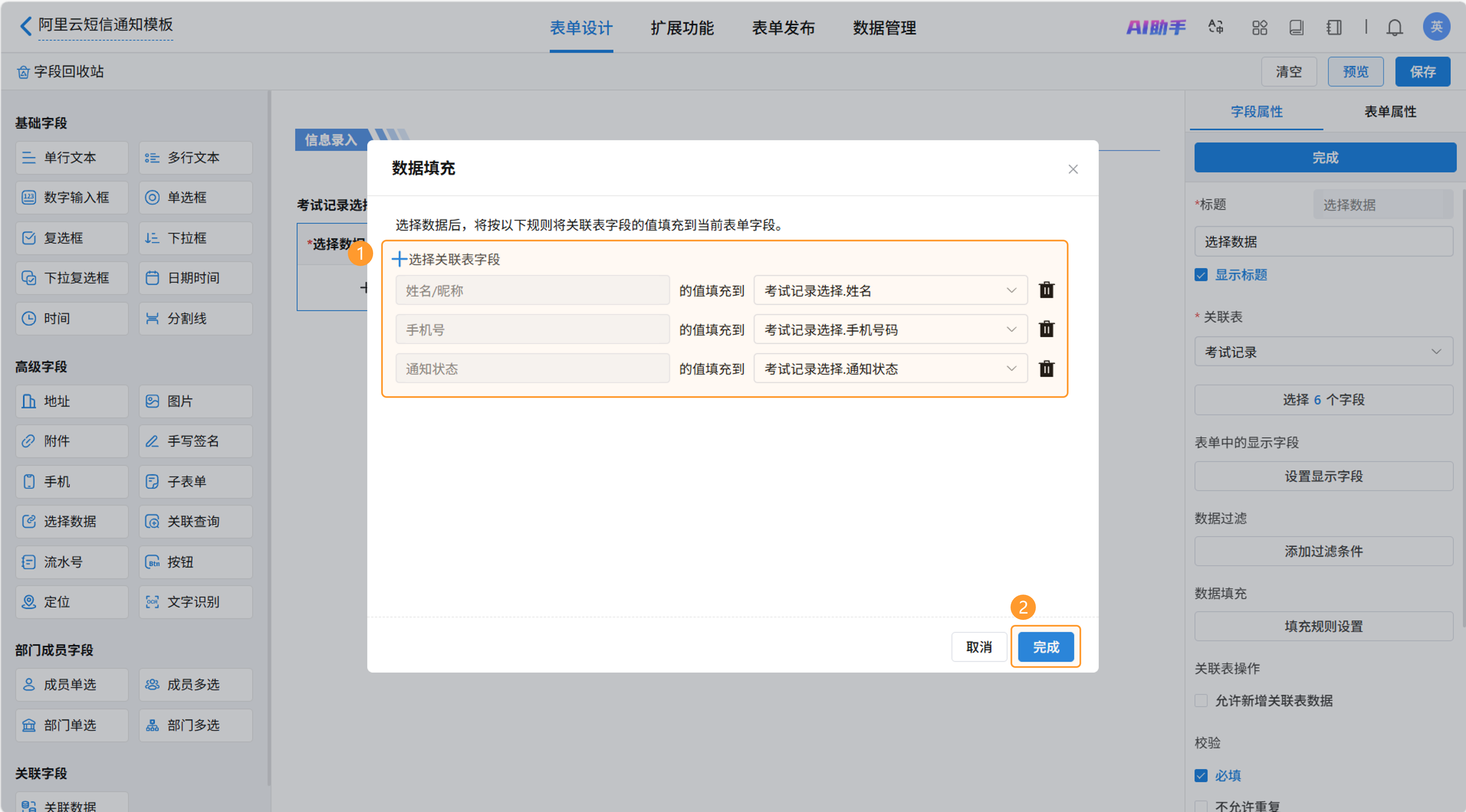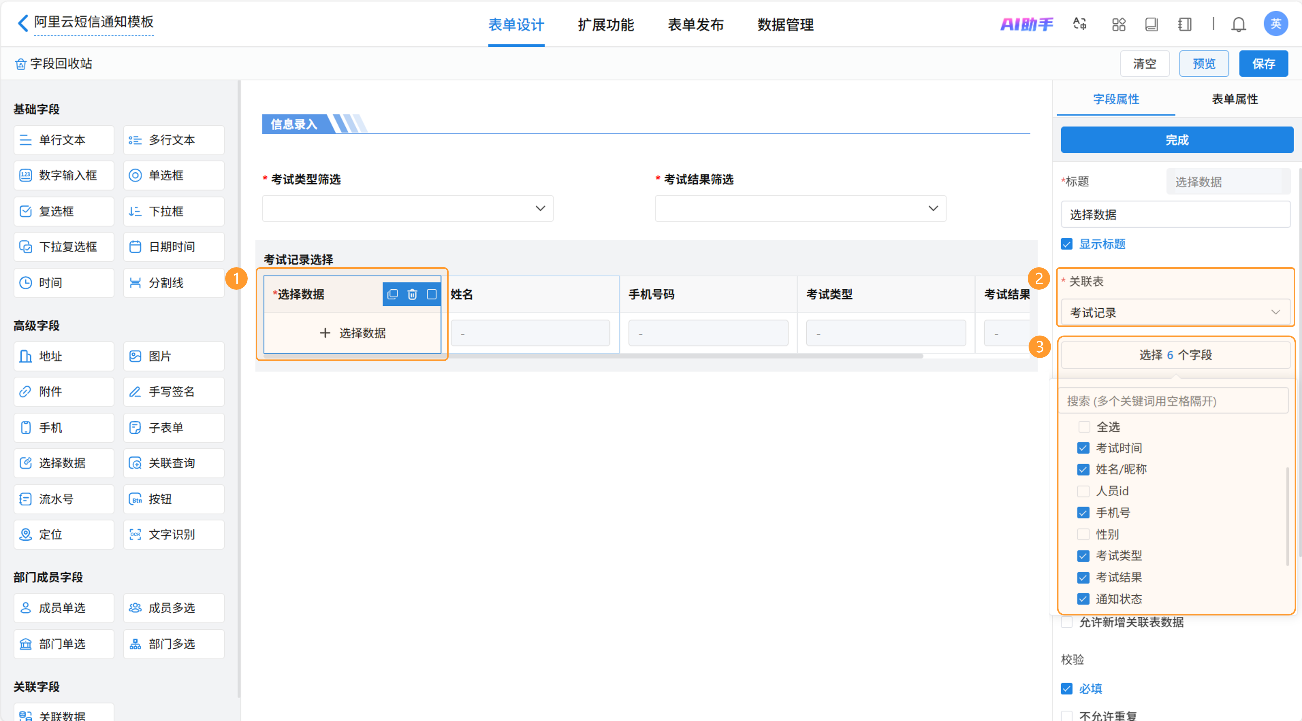 设置好“考试记录选择”子表单后,添加短信发送的相关字段。