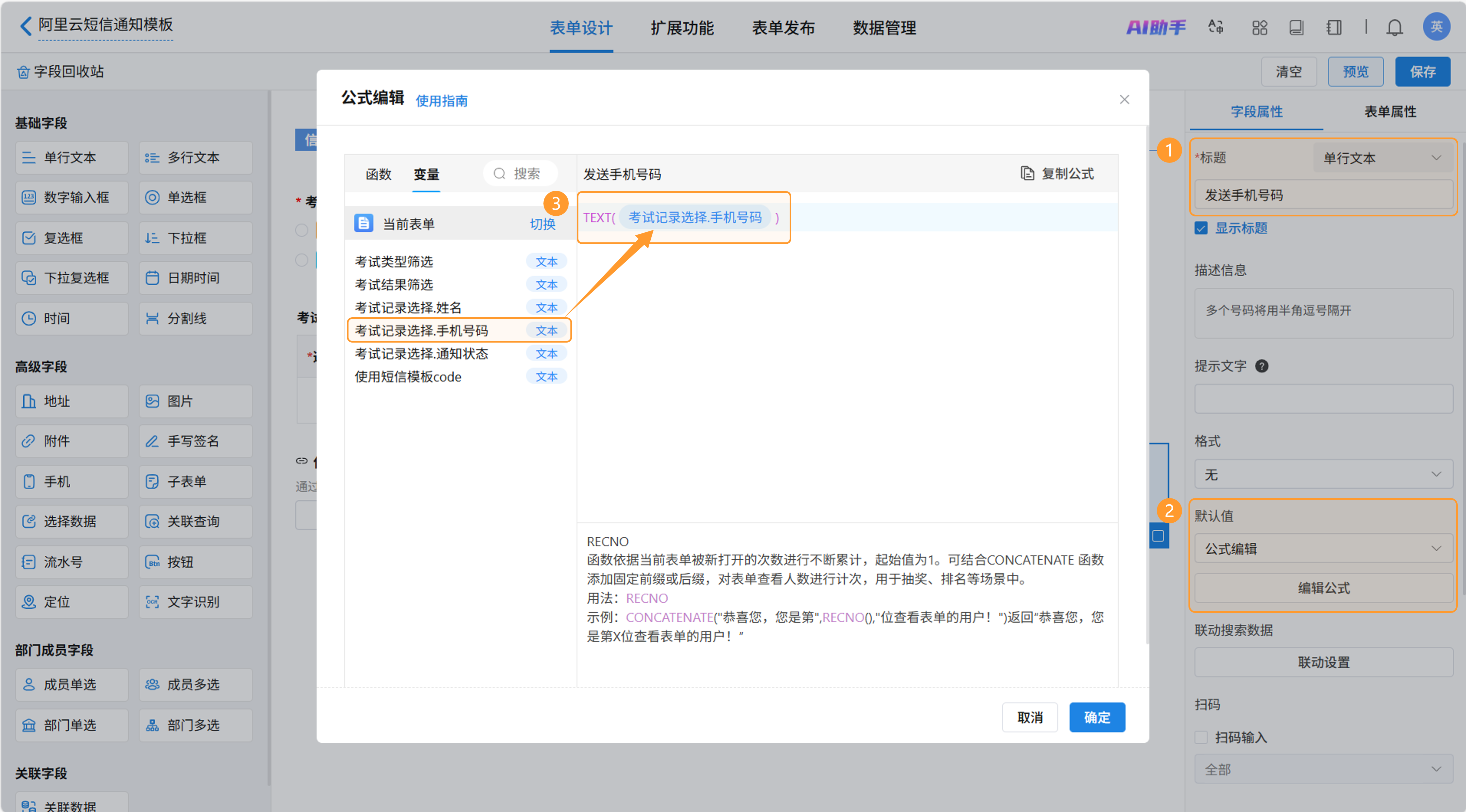 添加“发送手机号码”,设置公式:TEXT(考试记录选择.手机号码),存放子表单中手机号码列数组,使用半角符号分隔手机号。
