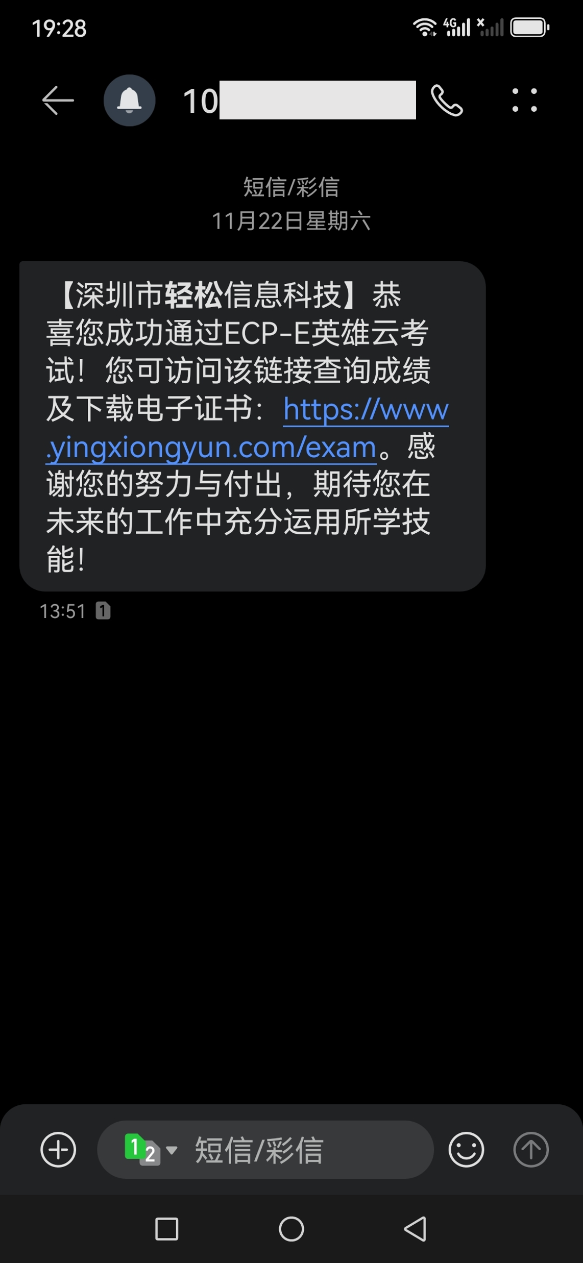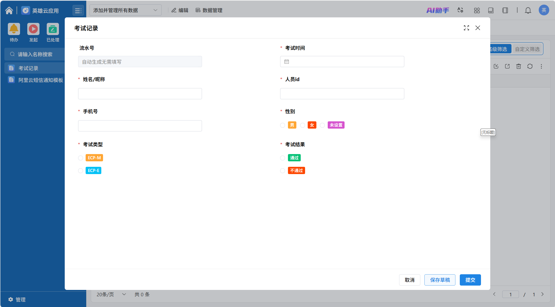 这里使用英雄云考试结果通知短信模板进行演示,使用一个考试记录表单放置考试的学员信息。表单设计如下图所示: