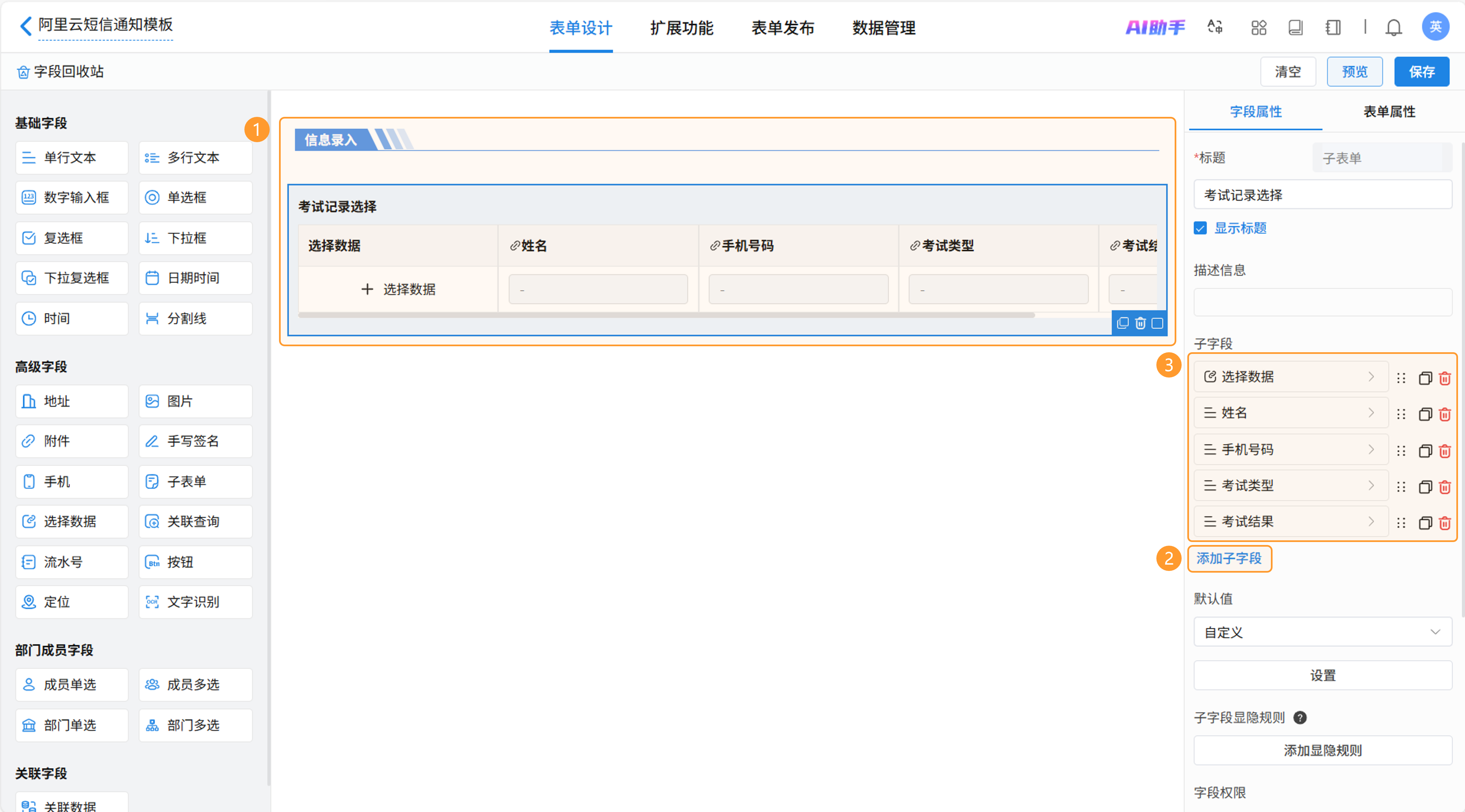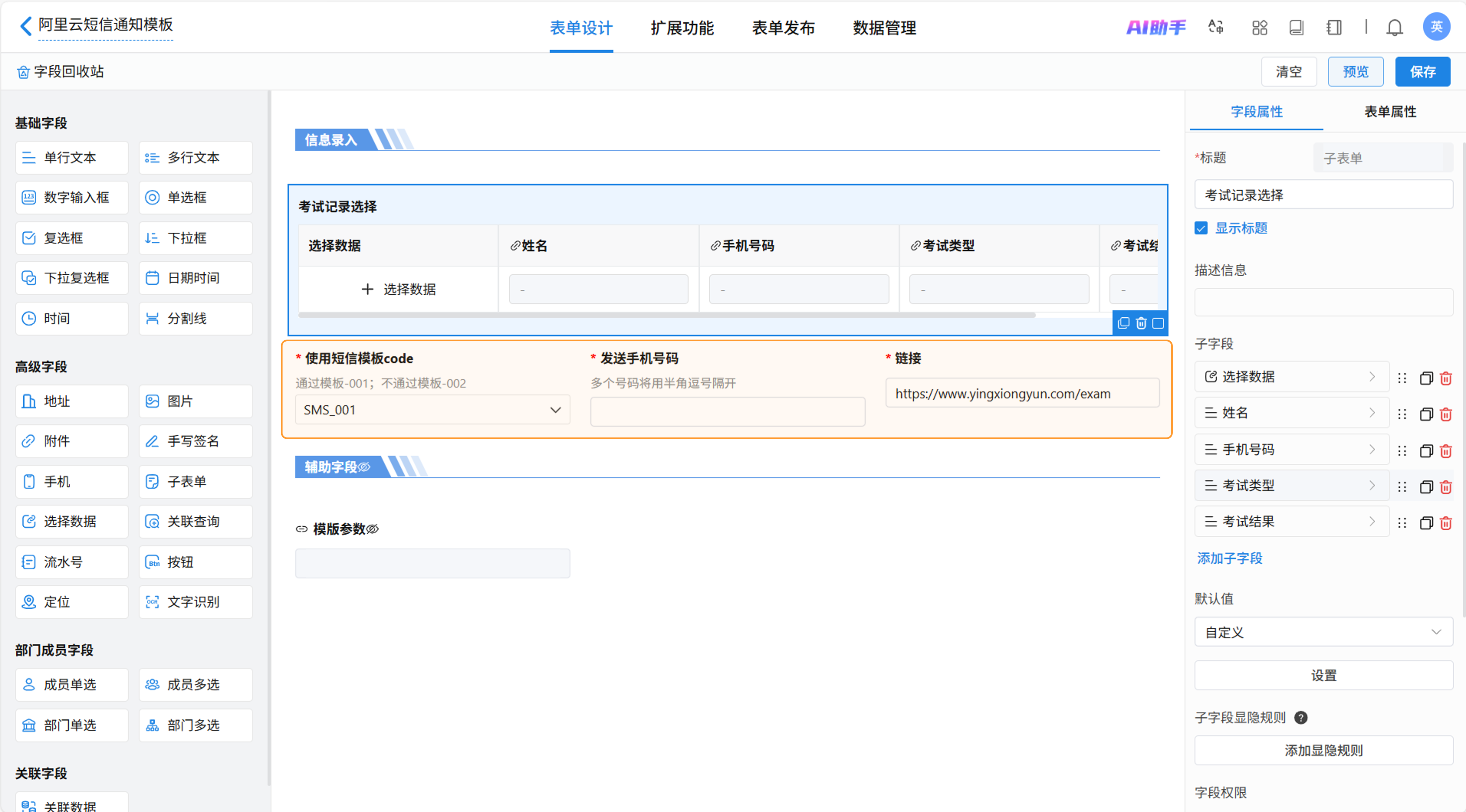 新建表单【阿里云短信通知模板】用于发送短信。添加“子表单”字段用于存放考试记录相关信息,在子表单中点击“添加子字段”添加“选择数据”字段和考试信息等相关字段。