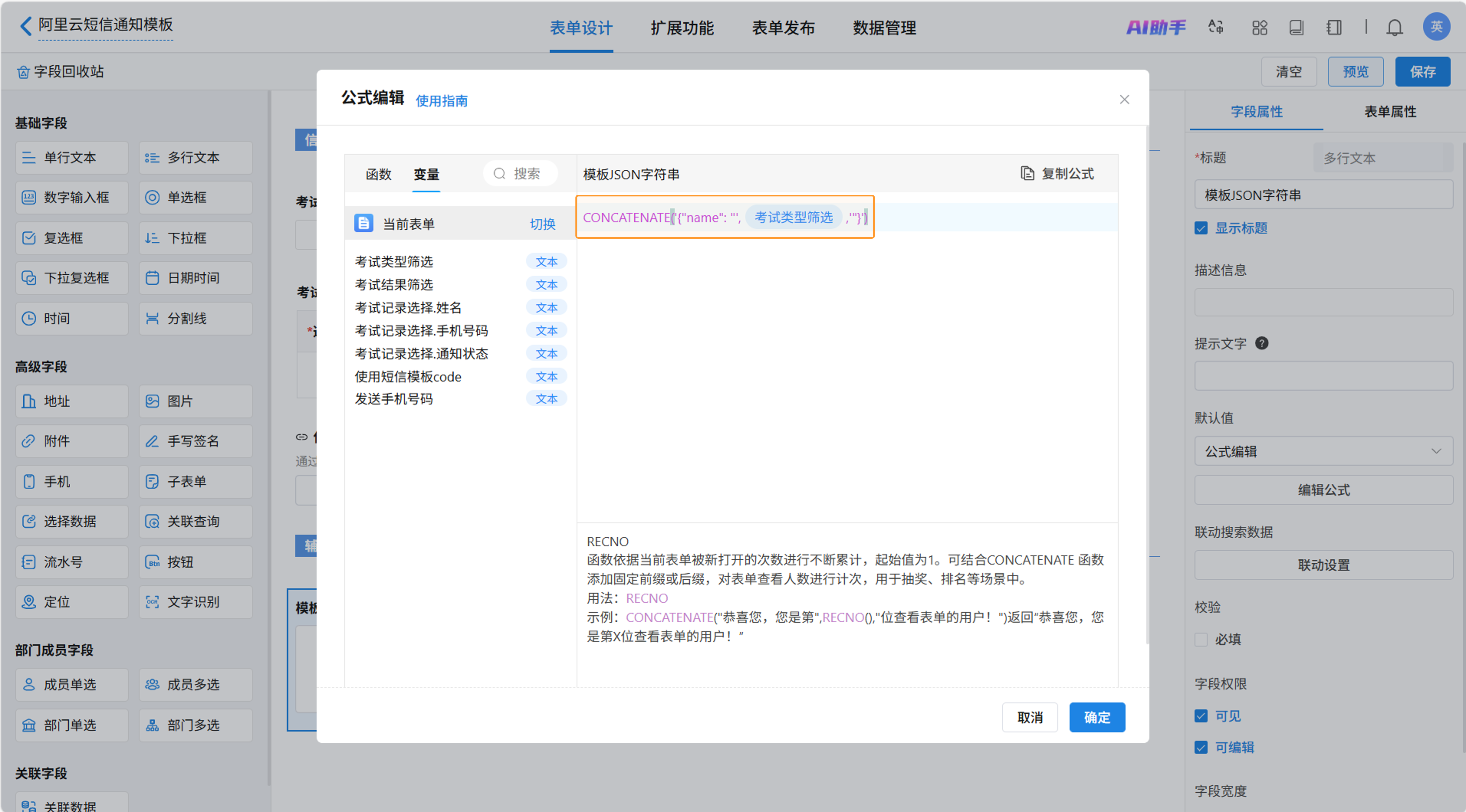 添加标题为“模版JSON字符串”的不可见字段,该字段用于传入短信模板变量对应的实际值,需要以JSON 字符串形式写入,我们的考试通知模板涉及变量有考试类型一个。对应的输入格式为‘{"name": "[考试类型]"}’。这里对该字段设置公式为:'{"name": "'+[考试类型]+'"}' 。由于公式中包含双引号,建议使用单引号包裹字符串。