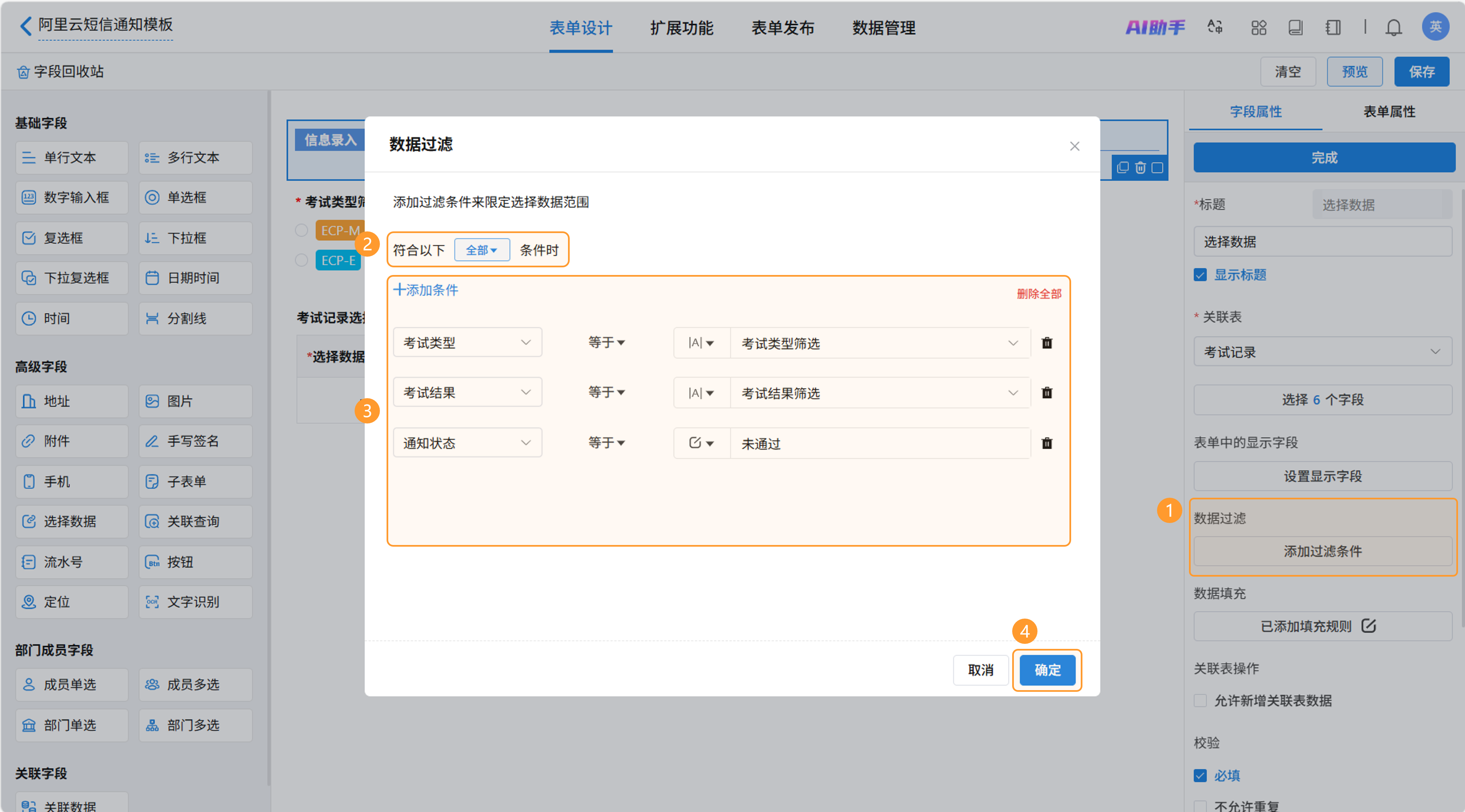 点击“选择数据”字段,在字段属性内点击“添加过滤条件”,设置好条件关系,加入考试类型、考试结果和通知状态三个筛选条件。
