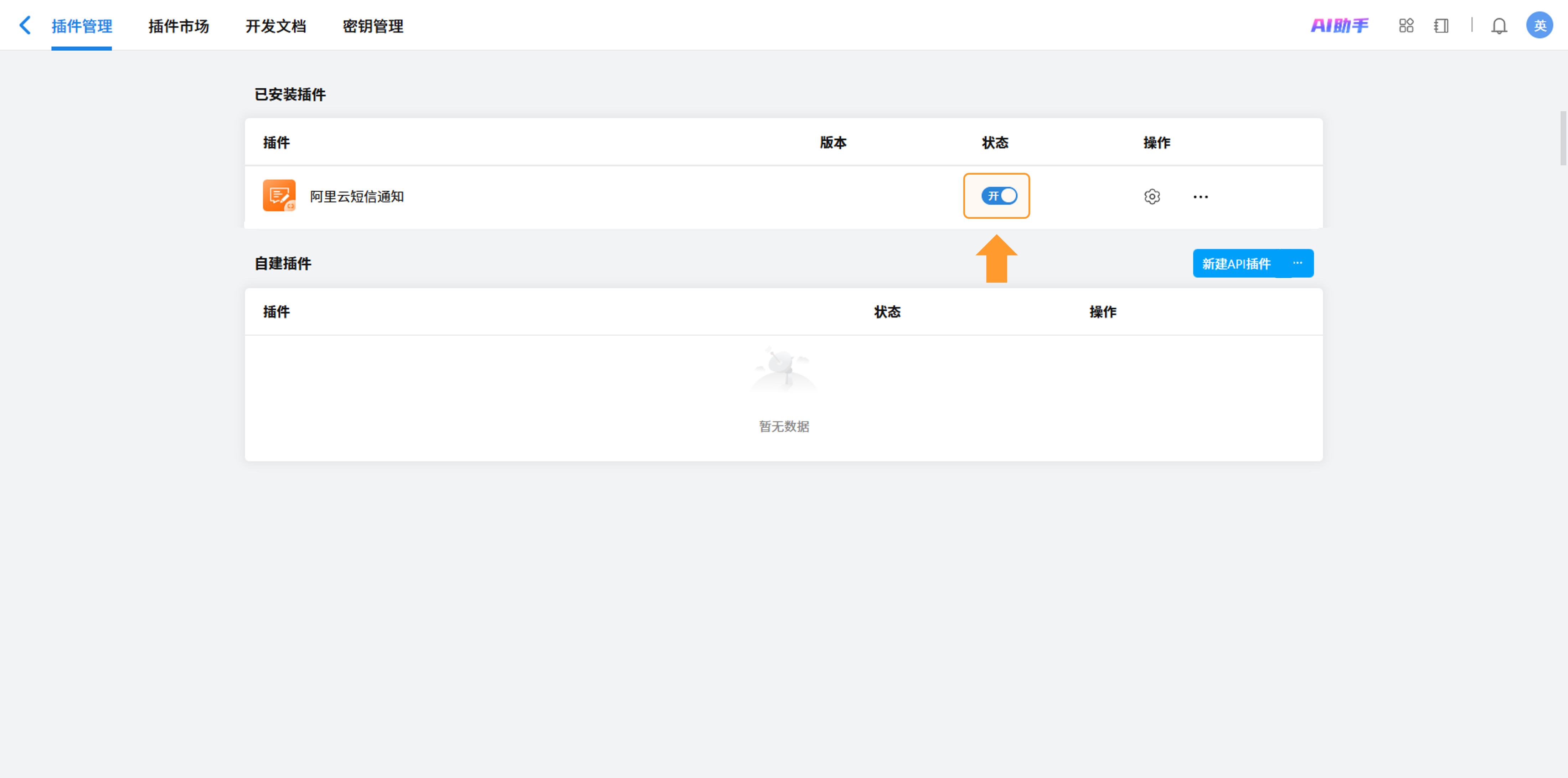 点击“插件市场”,选择“阿里云-短信通知”,进入插件详情页。