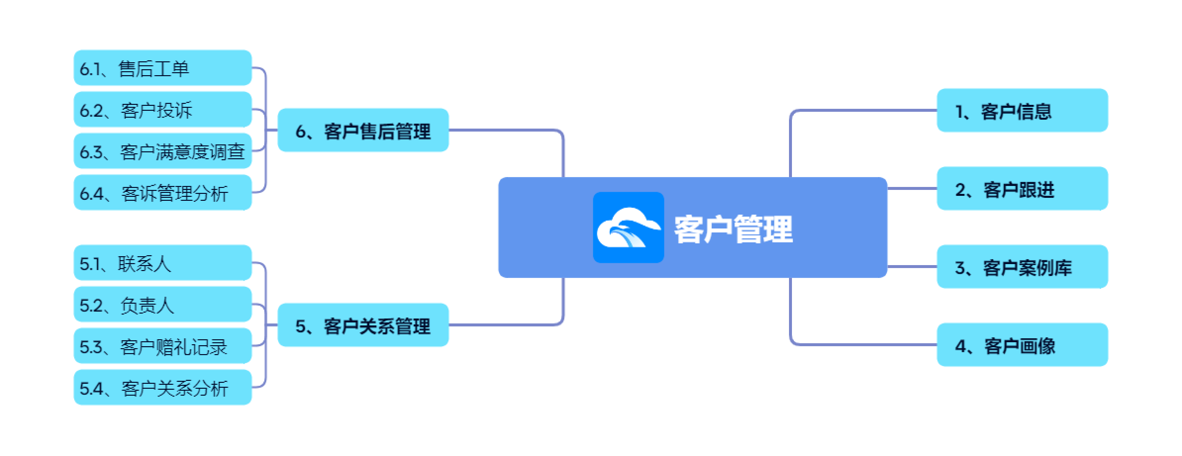 · 案例:团队有1个销售主管和3个销售专员,2名运营,1名客服,那么其核心流程是:客户线索获取 -> 初步沟通 -> 需求确认 -> 报价 -> 成交 ->售后跟进。